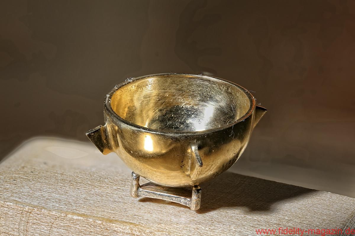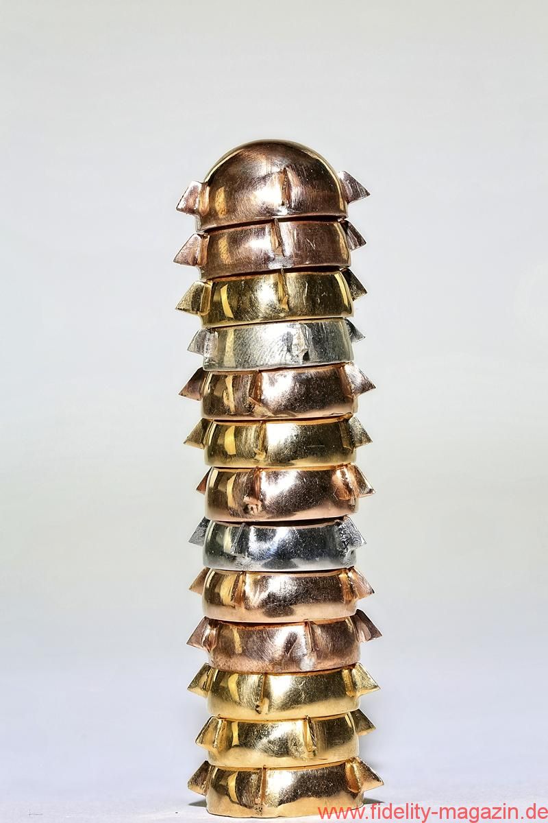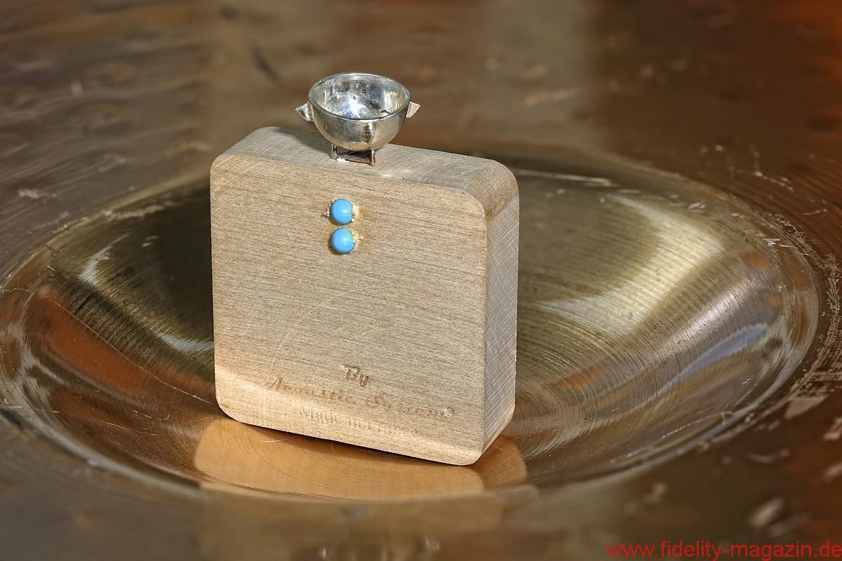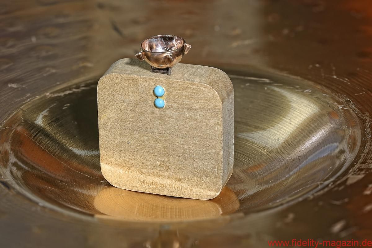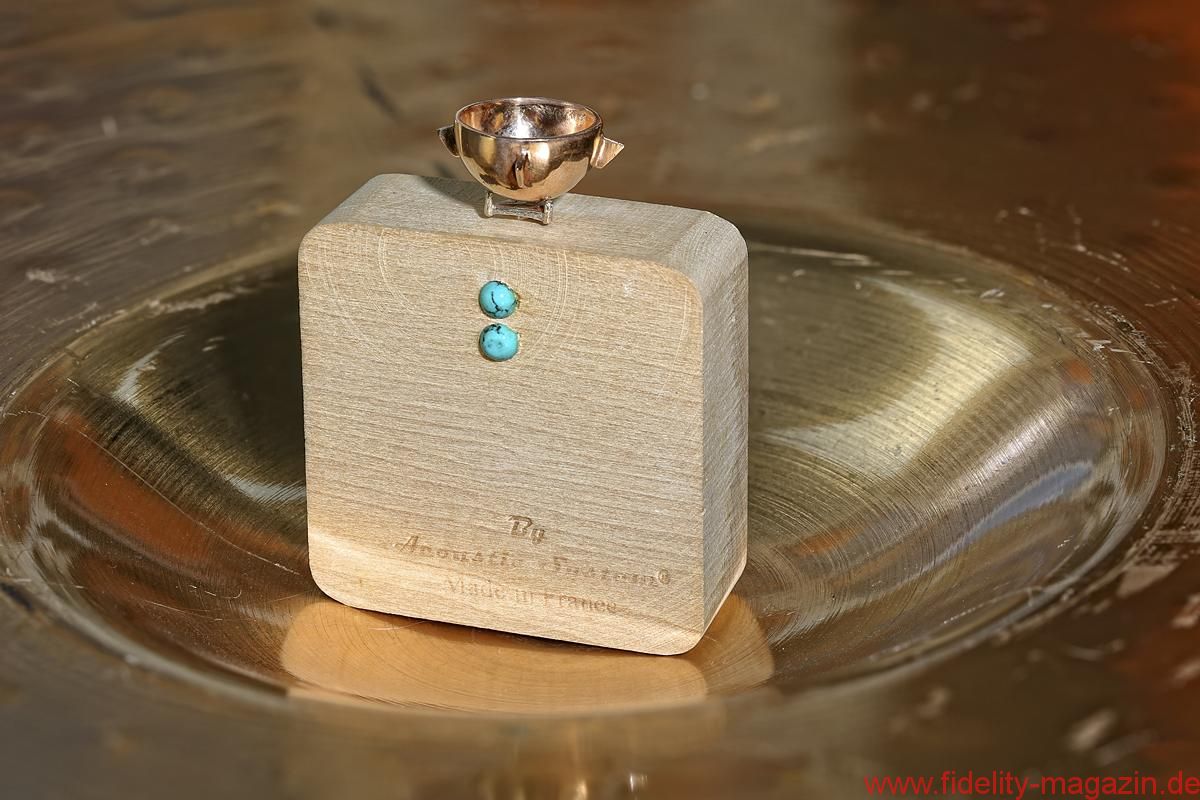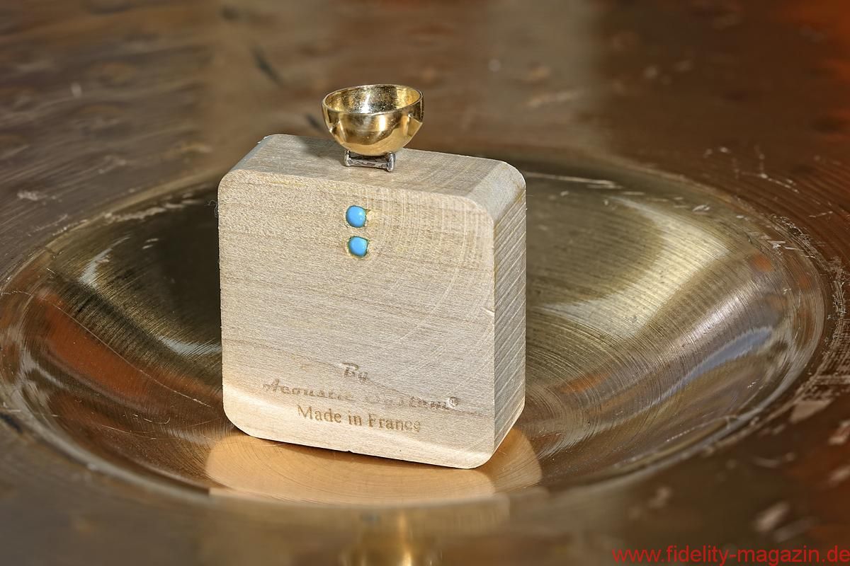 Aber jetzt passen Sie auf, damit haben Sie nicht gerechnet: Wenn Franck Tchang den Raum als Lautsprecher betrachtet, den es zu optimieren gilt, dann höre ich keine Additive, sondern die Korrektur von durch Gewöhnung akzeptierten Raummoden. Das erklärt dann auch, warum ich es als intuitiv authentischer empfinde. Den größten Einfluss scheinen die Resonatoren jedoch tatsächlich im unhörbaren Obertonbereich zu haben, weil sie die Tonalität unangetastet lassen. Sie reichern die Wiedergabe weniger an, als sie sie vielmehr ergänzen. In Tchangs Theorie um Obertöne, die bei der Aufnahme verloren gingen. Das darf man durchaus skeptisch sehen, auch mir will nicht ganz einleuchten, wie ein goldener Fingerhut die exakten Obertonfrequenzen verschiedenster Instrumente treffen soll. Das entscheidende Argument hält wieder die Praxis bereit: Es funktioniert für mein Gefühl. Vielleicht ist Exaktheit dabei gar nicht ausschlaggebend, sondern das bloße Vorhandensein dieser vorher fehlenden Oberwellen vermittelt schon das Gefühl von Wahrhaftigkeit. Es geht bei HiFi schließlich nicht um die genaue Reproduktion des Originals, sondern um die glaubhafte Illusion davon. Wer das anders sieht, soll mich persönlich kontaktieren.