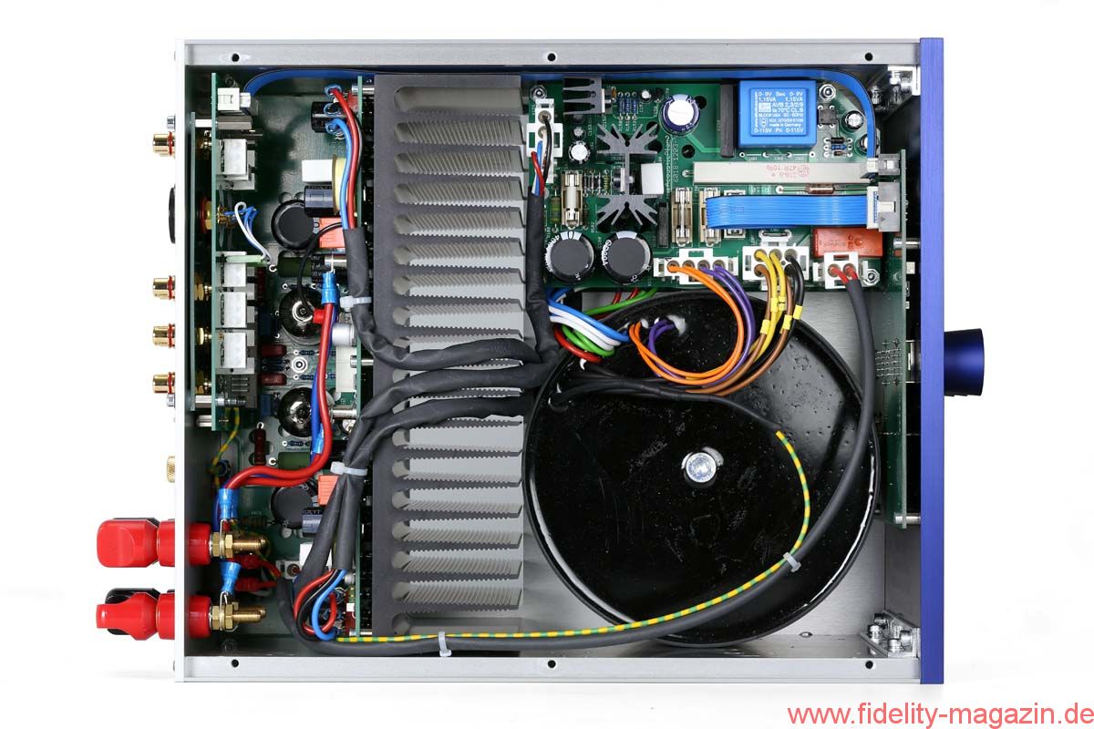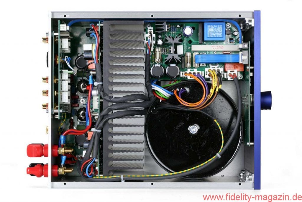 Fragt man nach technischen Details, antwortet Jäckle mit einer Aufzählung der Dinge, die fehlen: Über-alles-Gegenkopplung; Übernahmeverzerrungen in der Class A/B-Endstufe; thermische Verzerrungen; ein negativer Einfluss der Transistor-Endstufe auf das attraktive Klirrspektrum des Röhreneingangs. Jäckles Ziel ist Röhrenklang, aber nur im Sinne von Farbe und Textur. Daher die Forschung über Eigenklang-freie Transistorschaltungen. Daher die Verwendung einer Röhren-Eingangsstufe auch wieder im Mantra. Zwei Doppeltrioden des Typs 6922 (äquivalent E88CC) des Herstellers Electro Harmonix arbeiten einer mit vier bipolaren Sanken-Transistoren pro Kanal bestückten Push-Pull-Endstufe zu, die den nötigen Strom bereitstellt – „ist nur noch Impedanzwandler“, sagt Jäckle. Die lokal in der Endstufe eingesetzten Linearisierungsmaßnahmen sollen die vorgeschalteten Röhren ohne Einschränkung den Gesamtklang des Verstärkers bestimmen lassen.