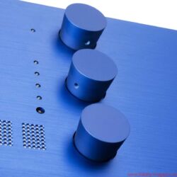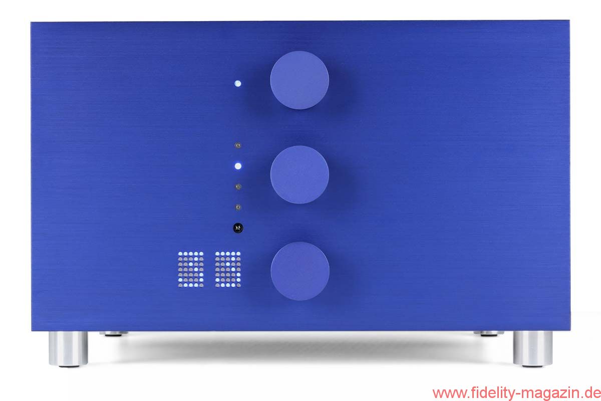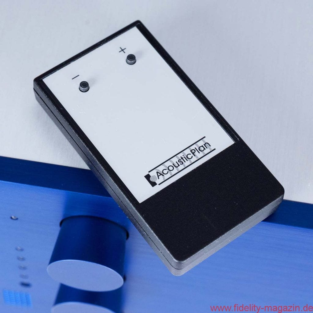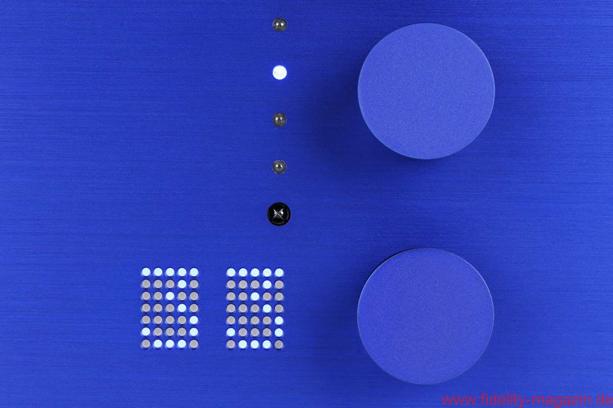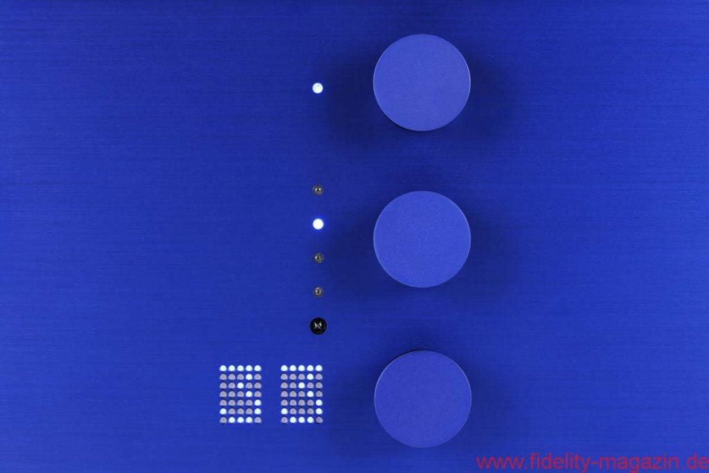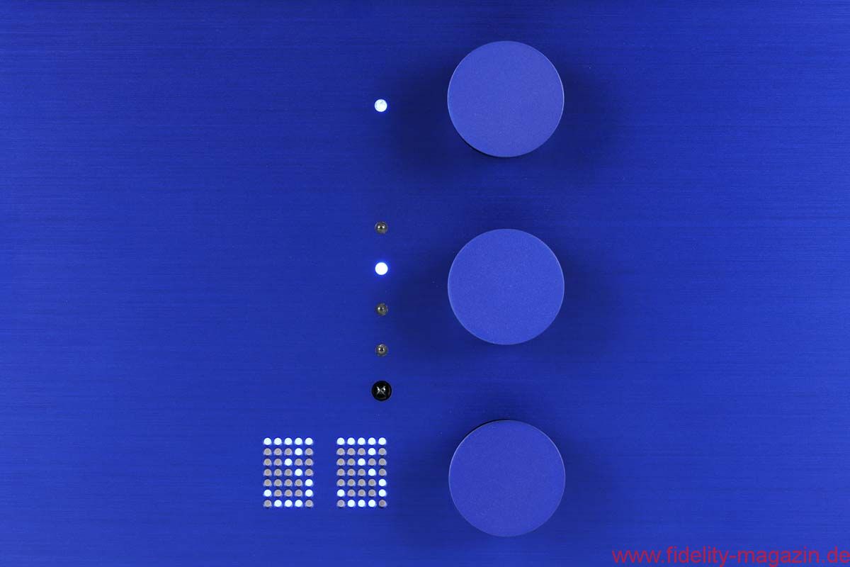 Der Mantra ist in der Grundversion ein klassischer analoger Hochpegelverstärker. Ein Phono-Einschub in Halbleitertechnik ist in Arbeit – einer von vielen Unterschieden zum ebenfalls hybriden Vorgänger Sitar, der an dieser Stelle auf Röhren setzte. Die Aluminium-Frontplatte strahlt im unverwechselbaren AcousticPlan-Nachtblau. Zu bedienen gibt es hier außer Quellenwahl und Pegelregelung (beides erfolgt via Relais) nichts. Die eingestellte Lautstärke ist von einer riesigen LED-Punktmatrix perfekt abzulesen. Ein „Direct Input“-Kippschalter auf der Rückseite verwandelt den Mantra in eine Stereo-Endstufe, das Display vermeldet daraufhin „DI“.