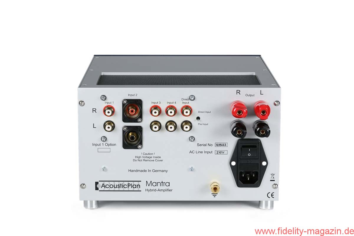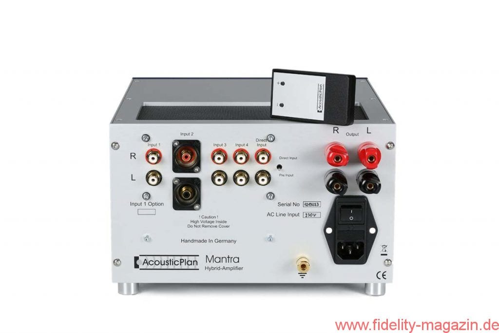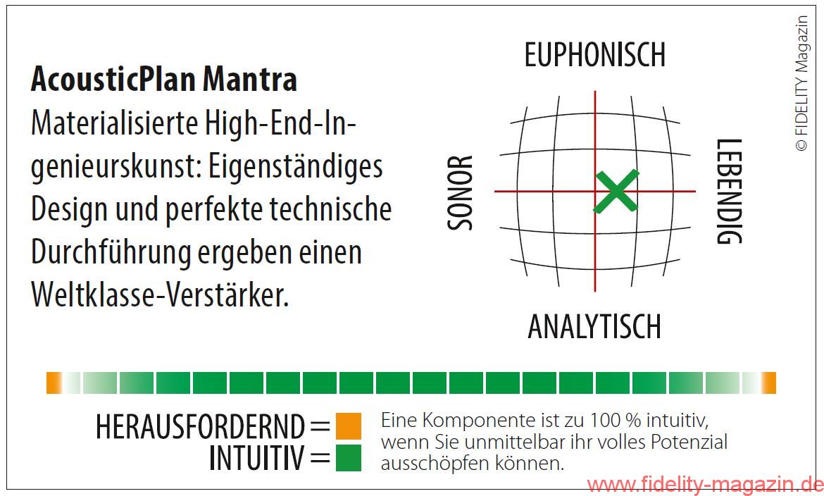 Der AcousticPlan Mantra besitzt Charakter. Sein Spiel hat Struktur und Verbindlichkeit, Lautsprecherlasten beeindrucken ihn nicht. Er ist kein romantisierender Schönklinger, kein galanter Euphoniker. Wer sich mit ihm einlässt, will wissen, was Sache ist. Der Mantra ist ein durch und durch musikalischer Verstärker für den gereiften Hörer, einer, bei dem man seine Boxen bestens aufgehoben weiß. Kurz: ein „Angekommen“-Verstärker.
