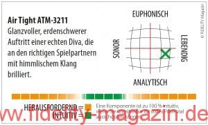 Idealerweise kombiniert man die ATM-3211 also nicht mit Impedanzmonstern, die nach einer Ansteuerung mit Transistoren schreien. Solche Kombinationen sind, was man neudeutsch ein „Mismatch“ nennen würde, eine Tendenz zu Blutleere und Farblosigkeit ist unüberhörbar. Zu großer Form laufen die Air-Tight-Monos dagegen an Lautsprechern auf, die von vornherein mithilfe von Röhrenverstärkern konstruiert oder abgestimmt wurden. Man denke unter anderem an die größeren Modelle etwa von Odeon, Ayon, DeVore Fidelity, Zingali oder Living Voice. Auch Audio Notes „E“-Klasse, die schon erwähnte Stereofone Dura sowie etliche Elektro- und Magnetostaten gehören zu den empfehlenswerten Konstruktionen, deren klangliches Profil mit den Schokoladenseiten eines ausgezeichneten Röhrenverstärkers harmonieren. Jörg Labza vom deutschen Vertrieb Axiss wusste zudem noch das Tocaro-Portfolio und – was für eine exzentrische Kombi! – die hauseigenen, superkompakten Breitbänder AL-05 zu loben. Kurzum: Man sollte die schönen Japan-Zwillinge einfach nicht mit abartigen Impedanzextremen quälen, bei denen sie trotz aller Nominalkraft die Contenance verlieren können.