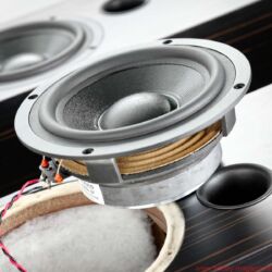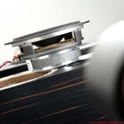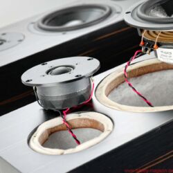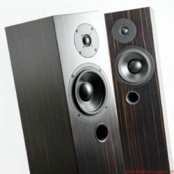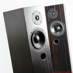 Bei mir zu Gast ist die Audes Maestro 116, ein vergleichsweise schlankes Zweiwege-Bassreflex-Modell mit sich leicht nach hinten verjüngendem Gehäuse. Die aus einem Kompakt- und zwei Standmodellen bestehende Maestro-Serie gibt es bereits seit einigen Jahren, sie wurde jedoch vom Akustikingenieur Aleksei Tjurin, dem Sohn des Audes-Eigentümers, überarbeitet; das Modell 116 war sein erstes abgeschlossenes Projekt. Verbaut sind ein Sechseinhalbzöller aus eigener Fertigung sowie ein exzentrisch platzierter Kalottenhochtöner von Seas; der Bassreflexkanal hat seine Öffnung auf der Frontseite, und zwar auf derselben Mittellinie wie der Hochtöner, also je nach Aufstellungsvariante einige Zentimeter nach links oder rechts versetzt. Ungewöhnlich niedrig ist die Trennfrequenz – bereits ab 950 Hertz übernimmt die Hochtonkalotte. Angesichts ihres geringen Volumens reicht die Audes herab bis zu erstaunlichen 40 Hertz (−3 dB). Der Wirkungsgrad ist mit 84 Dezibel durchschnittlich und die Sinusbelastbarkeit von 75 Watt ebenfalls keine besondere Überraschung für einen Lautsprecher dieser Größe.