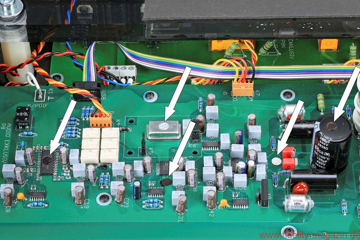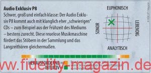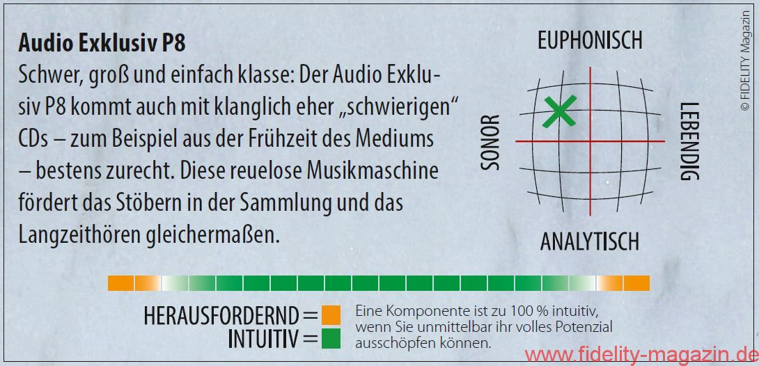 Der Kopf meint dazu, dass die Röhren-Ausgangsstufe des Audio Exklusiv P8 für dieses Zauberkunststück eventuell die Höhen behutsam softet und Bässe seelenstreichelnd verrundet … und dem Bauch ist das ganz recht. Dennoch verfärbt dieser Player, der dank digitaler Eingänge und USB-Anschluss auch für andere Digitalquellen und den Computer seinen Wandlertrakt zur Verfügung stellt, ganz gewiss nicht. Er setzt nur andere als die in mehr als drei Jahrzehnten vom Gehör in Sachen Digital „erlernten“ Schwerpunkte.
