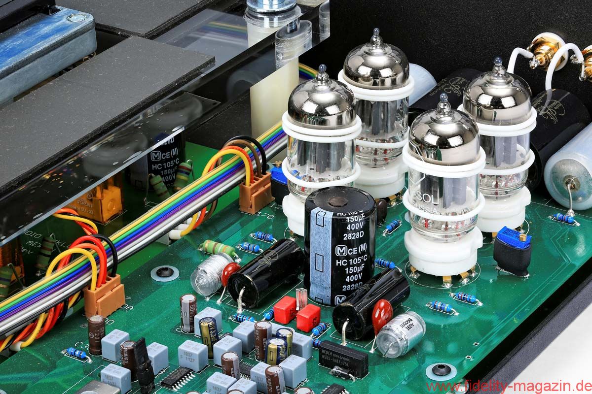 Besonderheiten: Toplader, Röhren-Ausgangsstufe mit 2 x ECC802S, 2 x 12AU7, Netzphasenkontrolle, Mute-Schalter, Systemfernbedienung, Display dimmbar