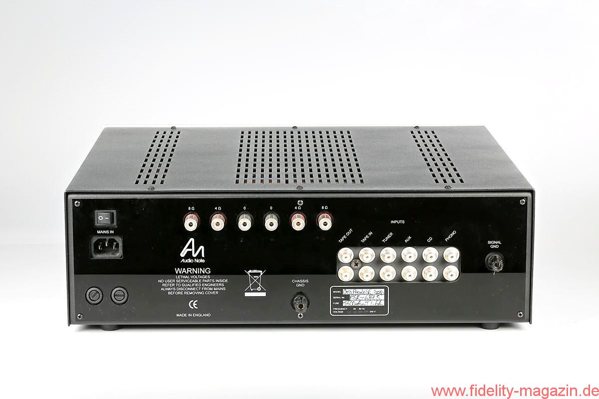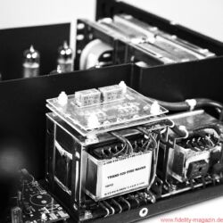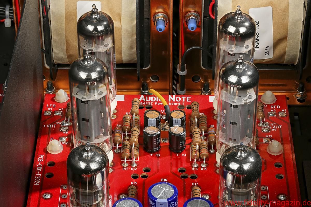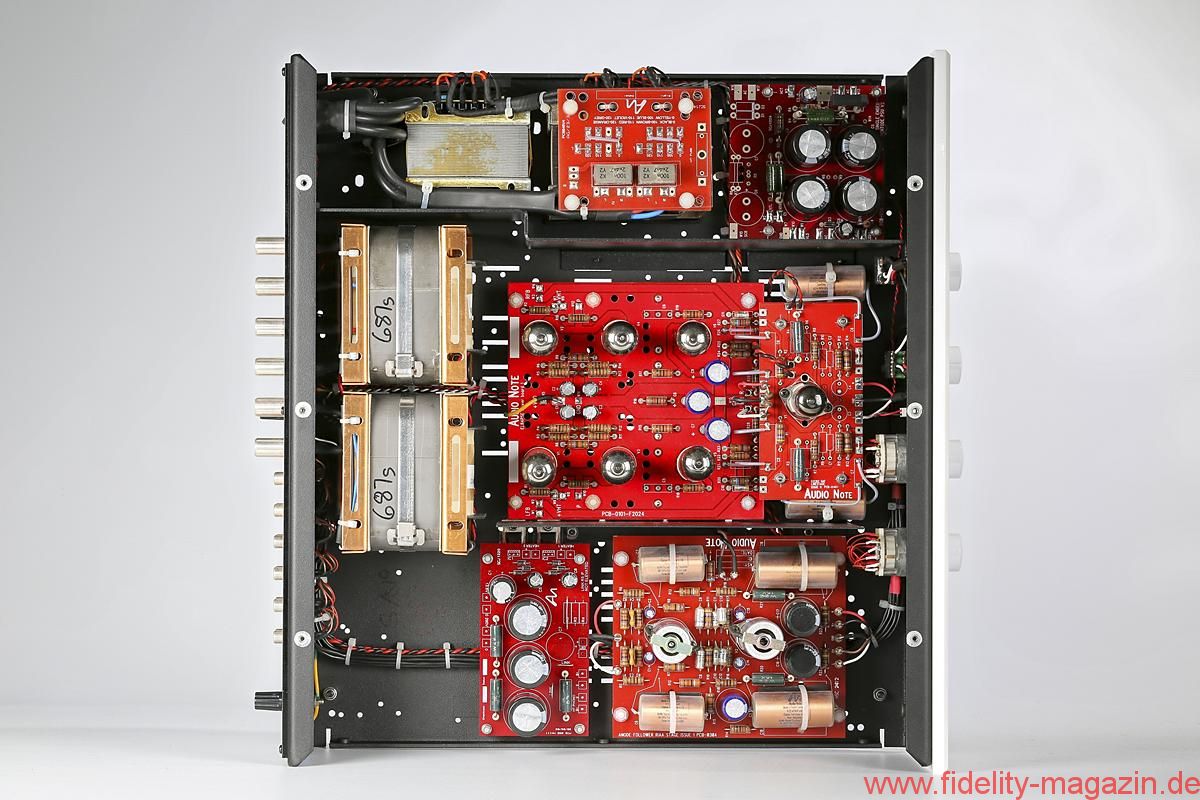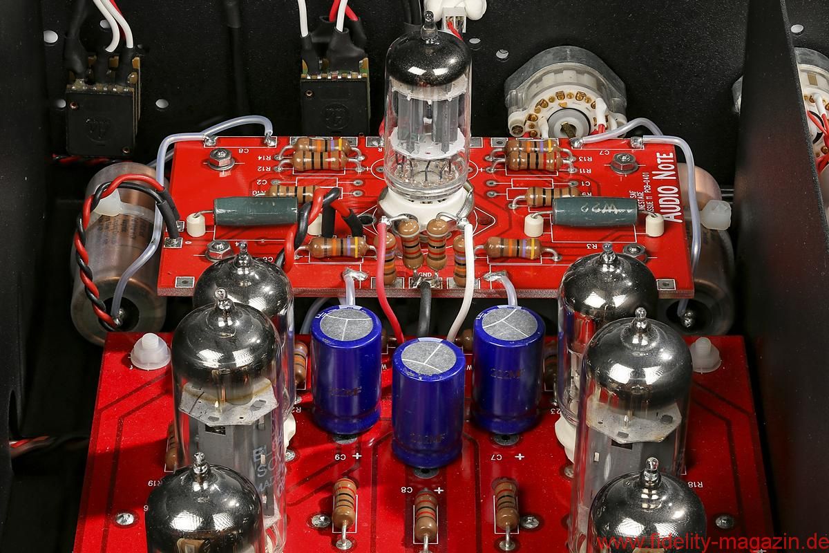 Zur Modulbauweise: In diesem Vollverstärker vereinen sich der Vorverstärker M1 und die Endstufe P1SE. Die eingesparten Kosten für getrennte Gehäuse, Netzteile, Buchsen und auch Verbindungskabel sind direkt am Preisschild erkennbar. Gleichwohl sorgen etliche der hier verwendeten klangentscheidenden Bauteile unter Kennern für begehrliche Blicke; Tantal-Widerstände, Kupferfolien-Elkos und insbesondere die berühmten Audio-Note-Übertrager haben entscheidenden Anteil am klanglichen Gesamtergebnis. Ein ausgesuchtes Quartett EL84-Leistungsröhren fühlt sich in einer solchen maßgeschneiderten Umgebung natürlich pudelwohl und läuft zur Höchstform auf. Was immer wieder für einige Überraschungen sorgt; sogar, das gebe ich gerne zu, bei mir selbst.