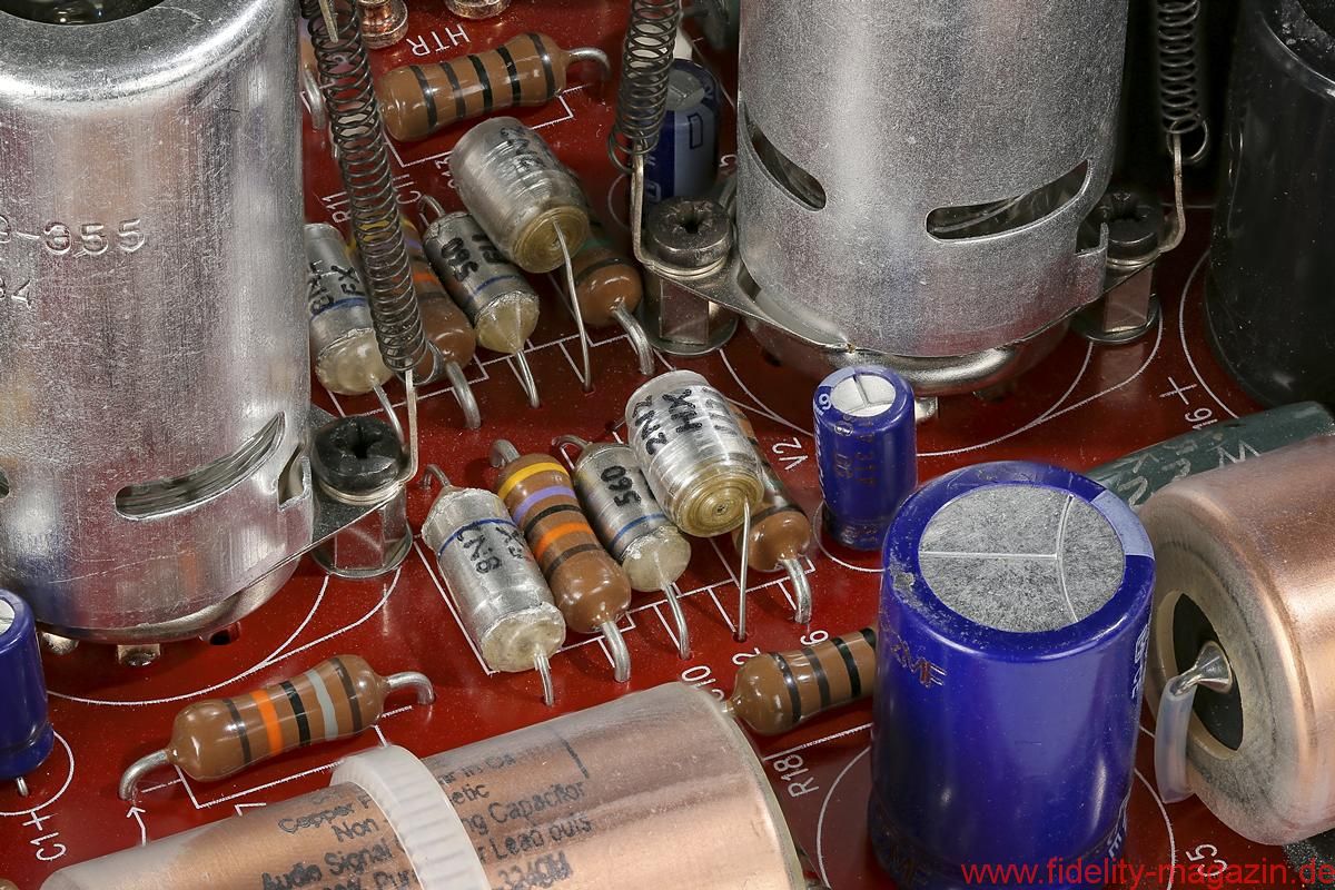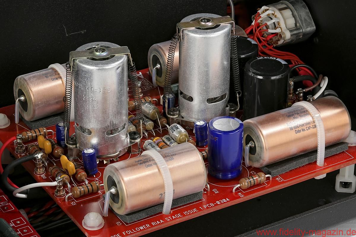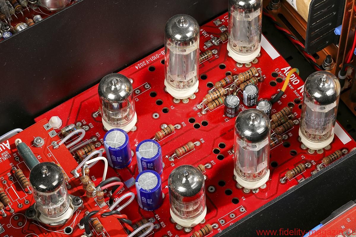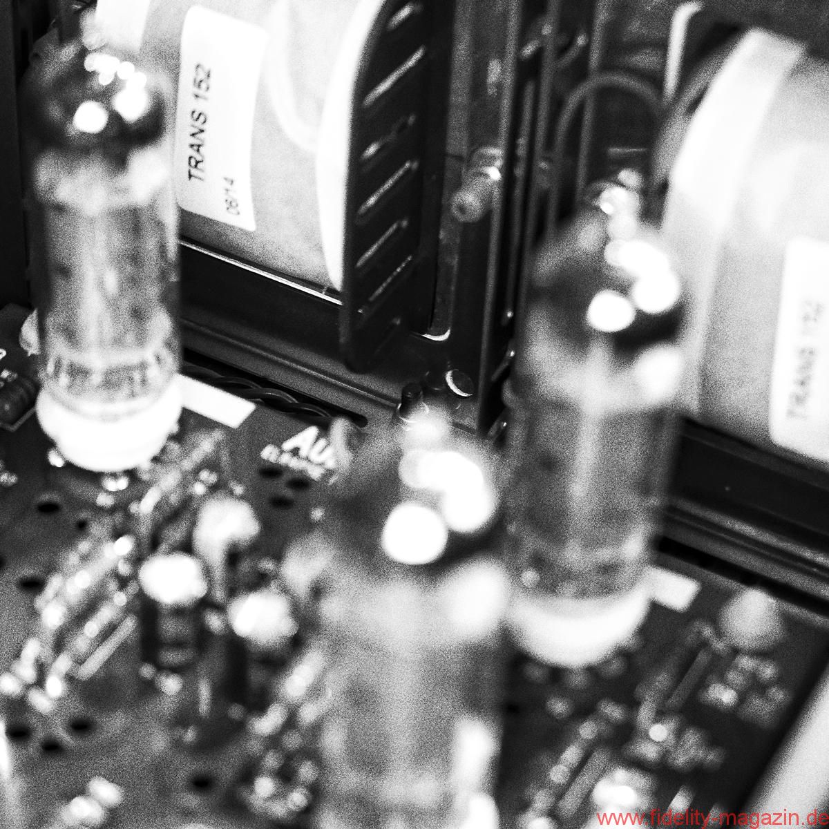 Zur Modulbauweise: In diesem Vollverstärker vereinen sich der Vorverstärker M1 und die Endstufe P1SE. Die eingesparten Kosten für getrennte Gehäuse, Netzteile, Buchsen und auch Verbindungskabel sind direkt am Preisschild erkennbar. Gleichwohl sorgen etliche der hier verwendeten klangentscheidenden Bauteile unter Kennern für begehrliche Blicke; Tantal-Widerstände, Kupferfolien-Elkos und insbesondere die berühmten Audio-Note-Übertrager haben entscheidenden Anteil am klanglichen Gesamtergebnis. Ein ausgesuchtes Quartett EL84-Leistungsröhren fühlt sich in einer solchen maßgeschneiderten Umgebung natürlich pudelwohl und läuft zur Höchstform auf. Was immer wieder für einige Überraschungen sorgt; sogar, das gebe ich gerne zu, bei mir selbst.