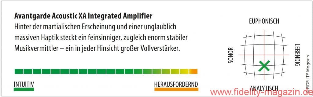 Nun dürfte klar sein: Der Avantgarde Accoustic XA Integrated ist trotz (oder vielleicht gerade wegen) seiner beeindruckenden Physis kein Haudrauf – ganz im Gegenteil. Selten habe ich einen Vollverstärker erlebt, der geschmeidiger, eleganter, ausgewogener und detailverliebter mit den ihm anvertrauten Signalen umgeht. Werde ich eine Träne im Auge haben, wenn er wieder geht? – Eine reicht nicht.