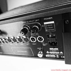 Die Rückseite bietet Platz für die üblichen Verdächtigen: zwei symmetrische und drei unsymmetrische Eingänge sowie ein Satz Polklemmen für den Anschluss der Lautsprecherkabel. Alles in fraglos bester Qualität und so großzügig über die Fläche verteilt, dass man auch sperrige und dickere Kabel mühelos anbringen kann. Lobenswert ist auch die kapitale Rändelmutter, mittels derer man gegebenenfalls zusätzliche Massekabel befestigen kann. Wer viel mit Analogequipment spielt, weiß ein solches kleines Extra zu schätzen. Das massive Gehäuse soll übrigens zu einem großen Teil der Vermeidung klangschädlicher Mikrofonieeffekte dienen. In wieweit sich Mikrofonie wirklich hörbar auf Transistorschaltungen auswirkt, vermag ich nicht zu beurteilen – eine gewisse Skepsis bleibt meinerseits bestehen. Zwar schätze ich jedes engagierte Bemühen um den guten Klang, zu diesem Punkt hätte ich irgendwann dann doch mal gerne einen Beweis. Zweifellos kann man allerdings attestieren, dass Avantgarde Acoustic sich dieses Themas mit ausgesuchter Gründlichkeit angenommen hat. Die ineinandergreifenden massiven Aluminiumschalen der XA-Serie, zu der auch der Integrated Amp gehört, sind in ihrer Ausführung schon beispielhaft kompromisslos.