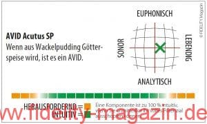 Die Plattenspieler von AVID, insbesondere der Acutus, der seit 1995 nahezu unverändert gebaut wird, sind das Herzstück von Conrad Mas’ Schaffen. Erst in diesem Jahr wurde der Phonospezialist mit beeindruckenden Lautsprechern und Leistungsverstärkern zum Vollsortimenter. Daneben fertigt seine Firma in der Nähe des englischen Huntingdon aber auch für echte Industrieunternehmen Spezialteile, bei denen es um höchste Präzision geht. Der typisch britische Humor kommt dabei nicht zu kurz: Das Akronym AVID steht für „A Very Interesting Design“.