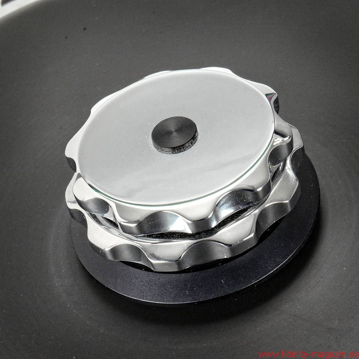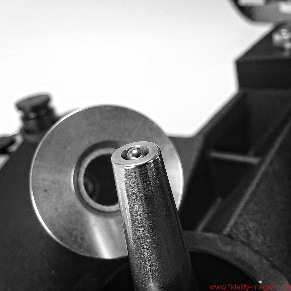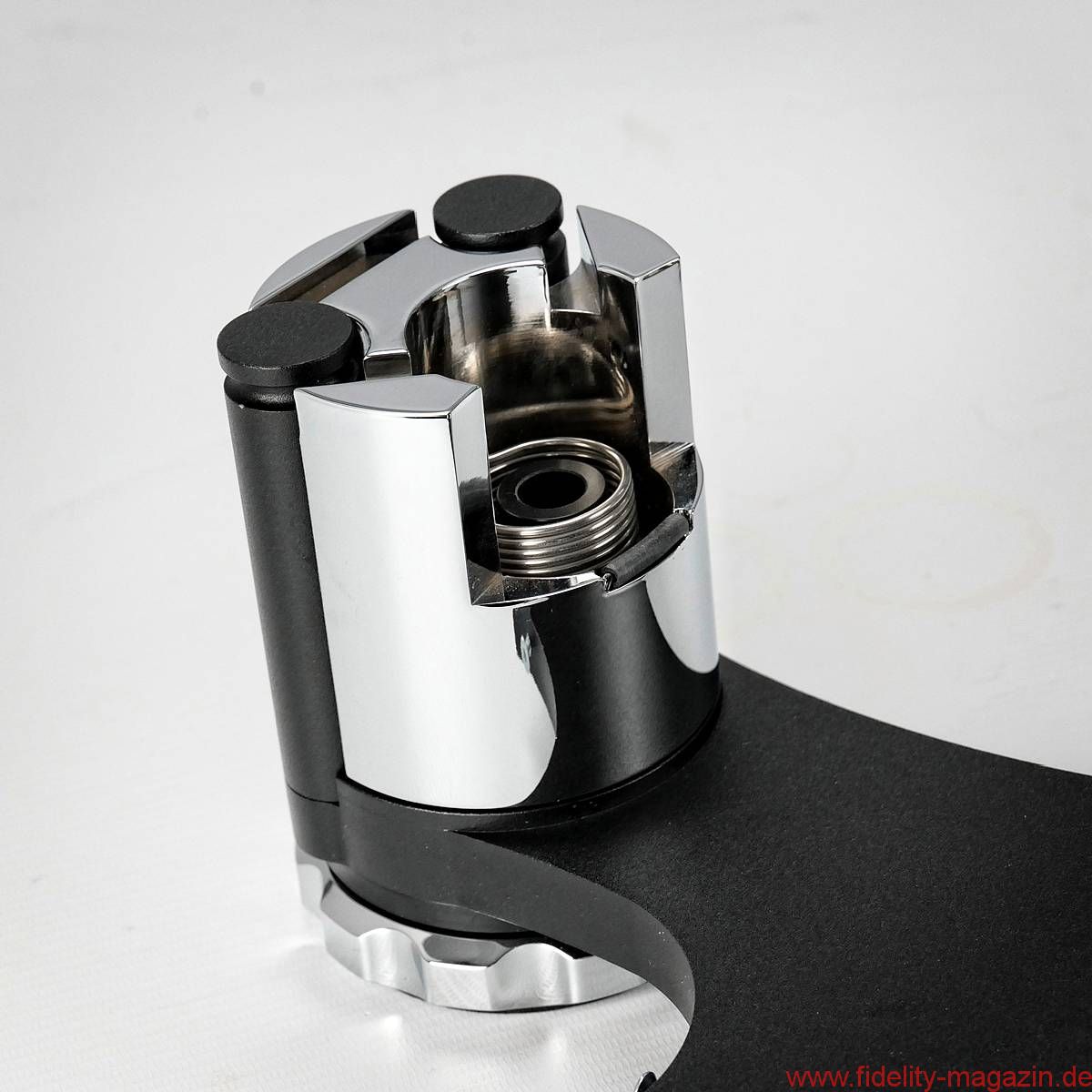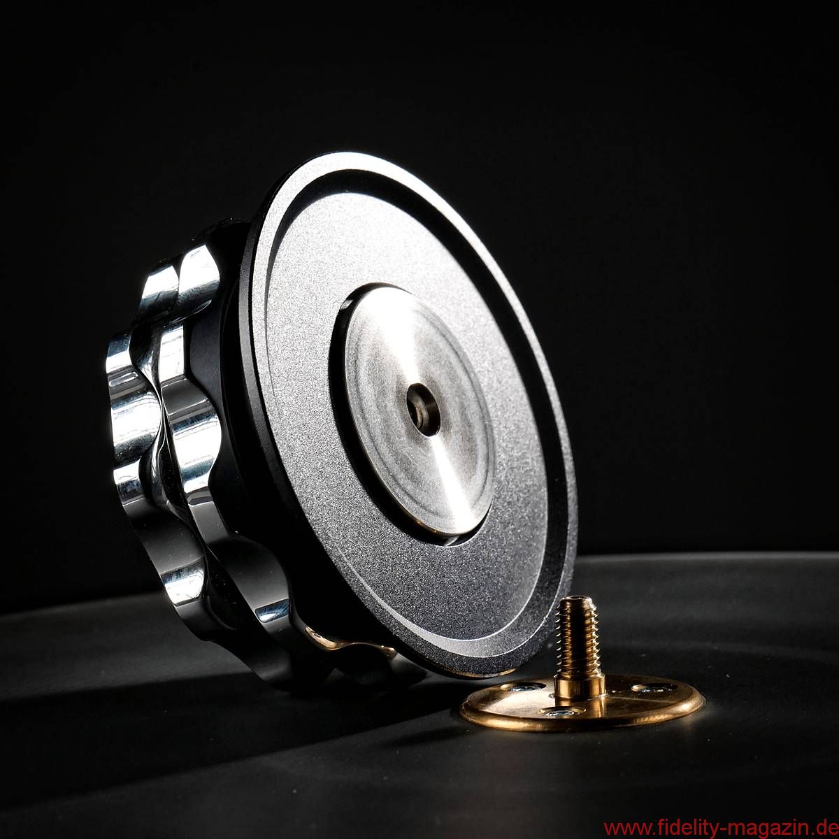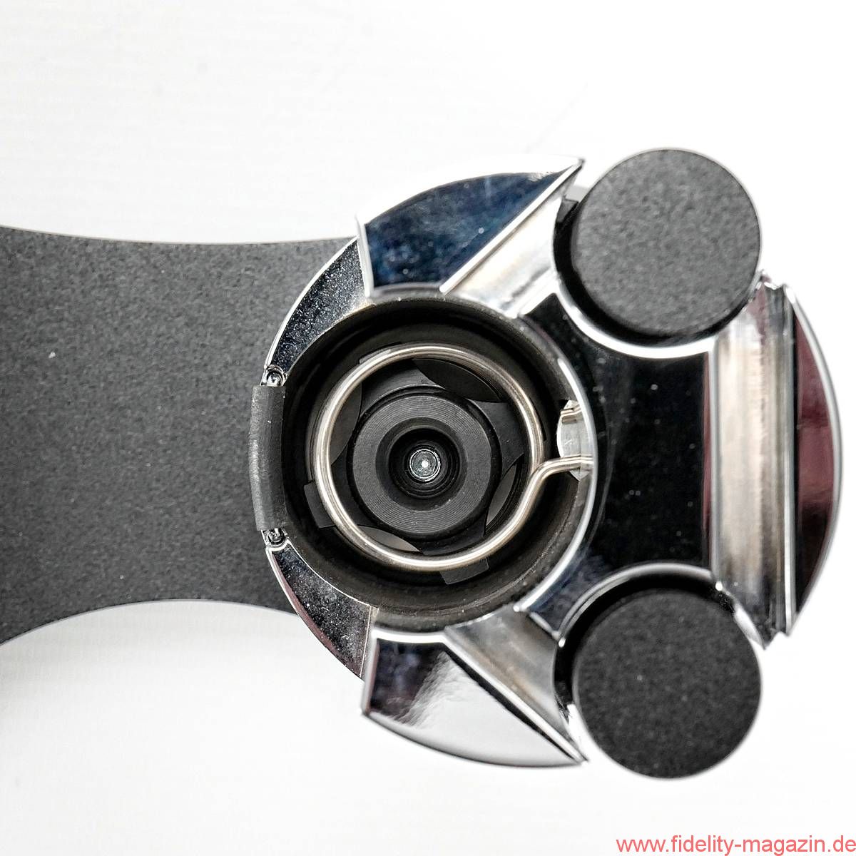Bevor man den Teller endgültig überstülpt, sollte man an die Antriebsriemen denken. Zwei Rundriemen müssen um den Subteller gelegt und mittels eines zweinutigen Splints zum Tellerrand gespannt werden. Dann peilt man unter dem Teller das Pulley an, zieht den Splint aus seiner winzigen Bohrung und lässt die Riemen über die Motorachse flitschen. Vorsicht, dass der Splint nicht mitfliegt, einige Kratzer unterm Teller des Testgeräts könnten genau daher stammen. Die Telleroberfläche besteht eigentlich aus einer reflektierenden, transparenten Matte; ihre schwarze Farbe rührt vom durchscheinenden anodisierten Metall her. Diese spezielle Auflage soll Vibrationen der Abtastung – unüblich für massereiche Teller – gar nicht erst eindringen lassen, sondern unmittelbar über das Lager ableiten. Dass Vibrationen aus beiden Richtungen – also von Umwelteinflüssen einerseits und abtastbedingt andererseits – gleichermaßen der Kampf angesagt wird, macht meines Erachtens die Einzigartigkeit dieses Designs aus. Laut Conrad Mas spielt sogar die Verchromung bzw. Vergoldung des Tellers eine klangentscheidende Rolle, da sie die Resonanzfrequenz verringert und ihn vor HF-Einstrahlung schützt. Da kann man nichts machen, außer mit der makellos glänzenden Oberfläche leben zu lernen.
