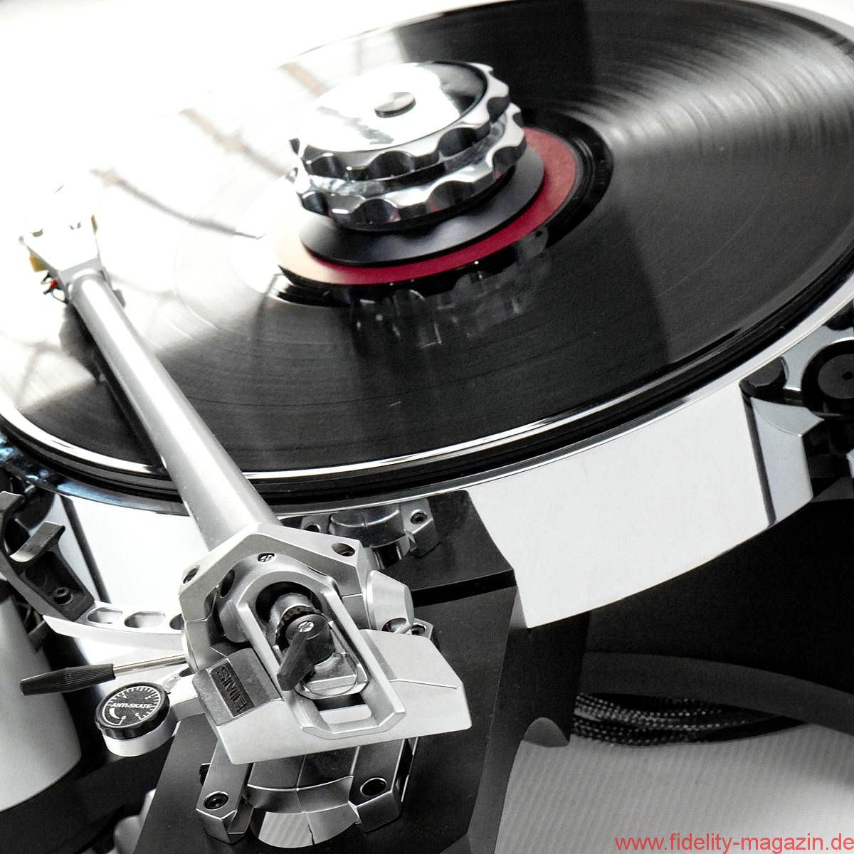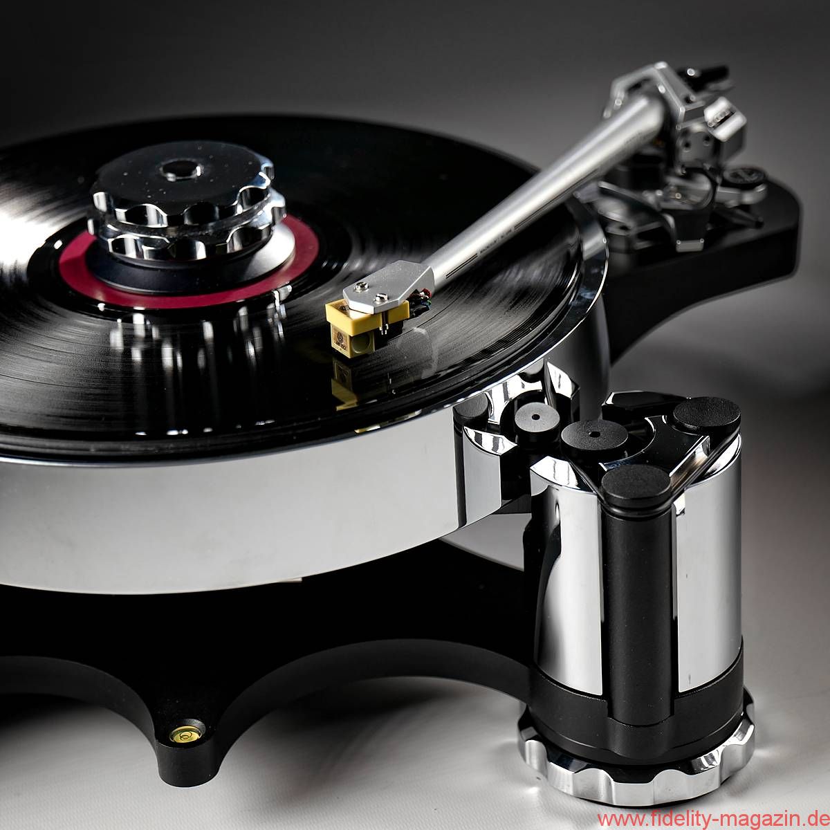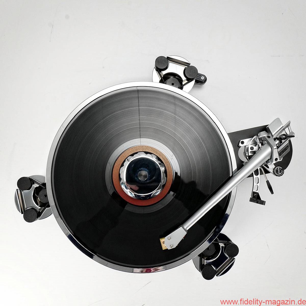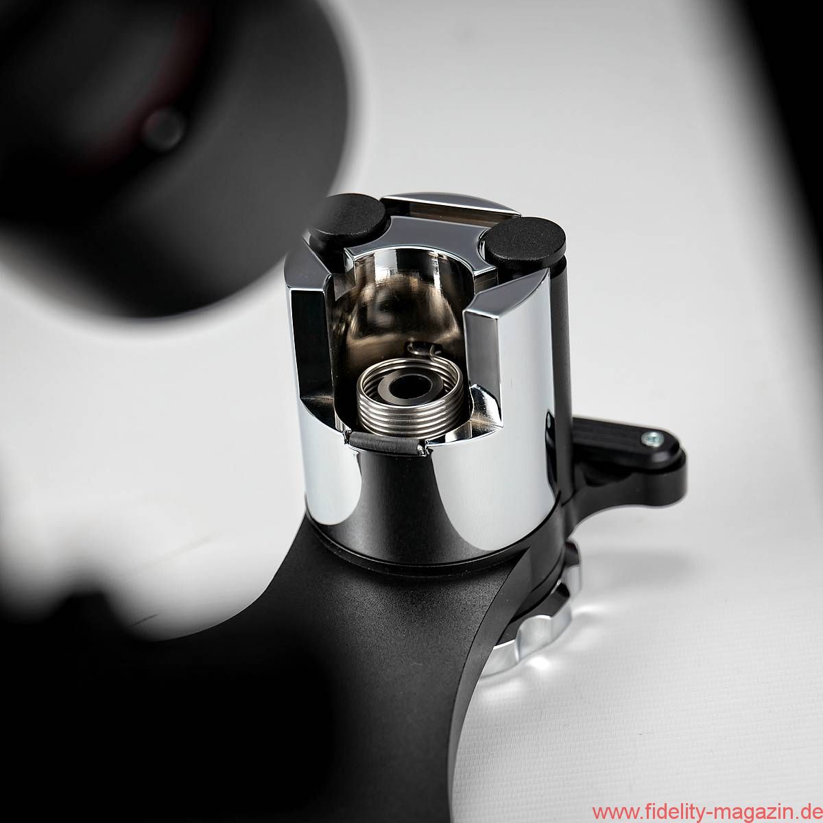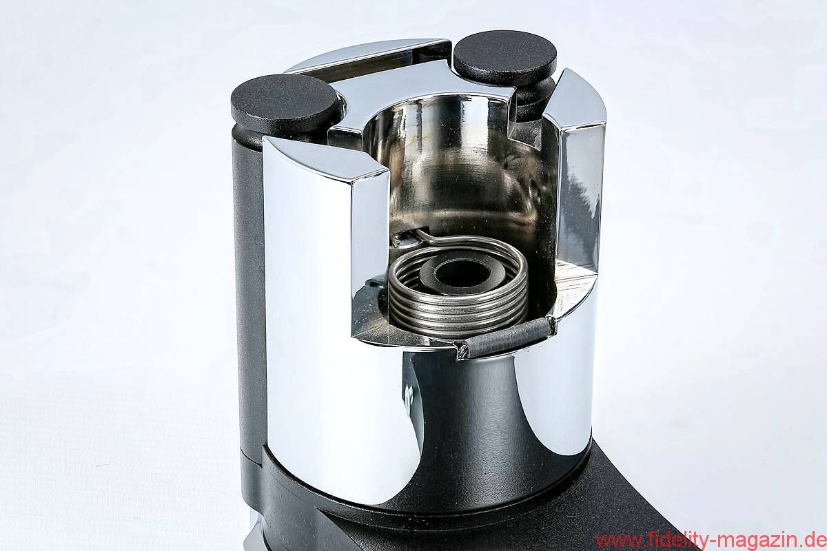 Bevor man den Teller endgültig überstülpt, sollte man an die Antriebsriemen denken. Zwei Rundriemen müssen um den Subteller gelegt und mittels eines zweinutigen Splints zum Tellerrand gespannt werden. Dann peilt man unter dem Teller das Pulley an, zieht den Splint aus seiner winzigen Bohrung und lässt die Riemen über die Motorachse flitschen. Vorsicht, dass der Splint nicht mitfliegt, einige Kratzer unterm Teller des Testgeräts könnten genau daher stammen. Die Telleroberfläche besteht eigentlich aus einer reflektierenden, transparenten Matte; ihre schwarze Farbe rührt vom durchscheinenden anodisierten Metall her. Diese spezielle Auflage soll Vibrationen der Abtastung – unüblich für massereiche Teller – gar nicht erst eindringen lassen, sondern unmittelbar über das Lager ableiten. Dass Vibrationen aus beiden Richtungen – also von Umwelteinflüssen einerseits und abtastbedingt andererseits – gleichermaßen der Kampf angesagt wird, macht meines Erachtens die Einzigartigkeit dieses Designs aus. Laut Conrad Mas spielt sogar die Verchromung bzw. Vergoldung des Tellers eine klangentscheidende Rolle, da sie die Resonanzfrequenz verringert und ihn vor HF-Einstrahlung schützt. Da kann man nichts machen, außer mit der makellos glänzenden Oberfläche leben zu lernen.