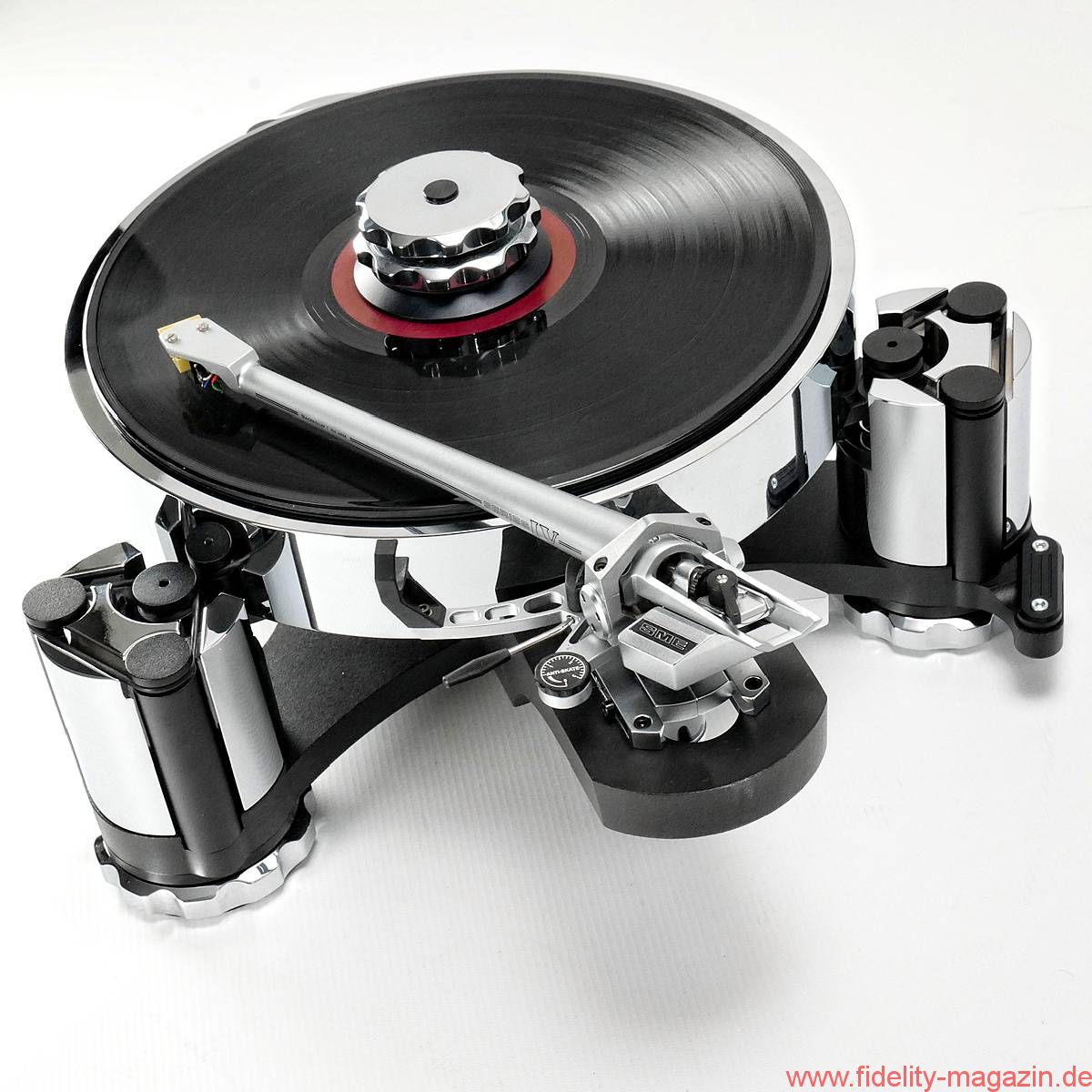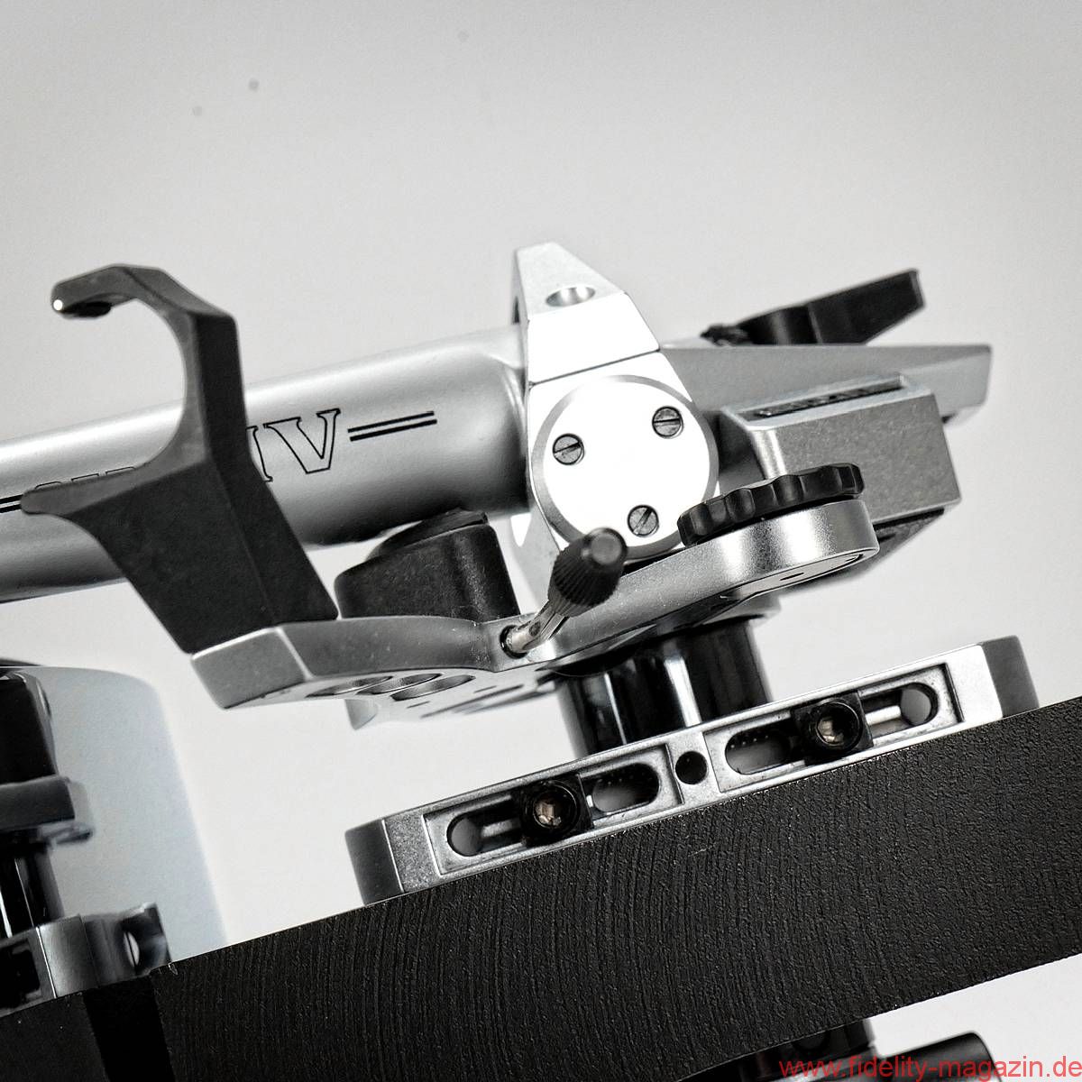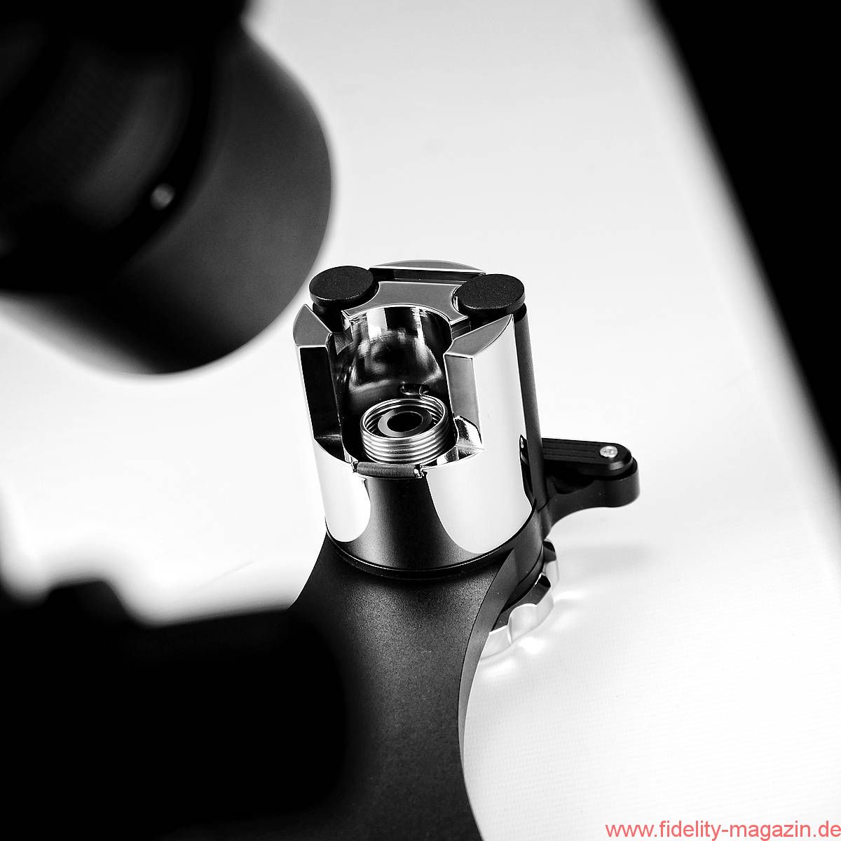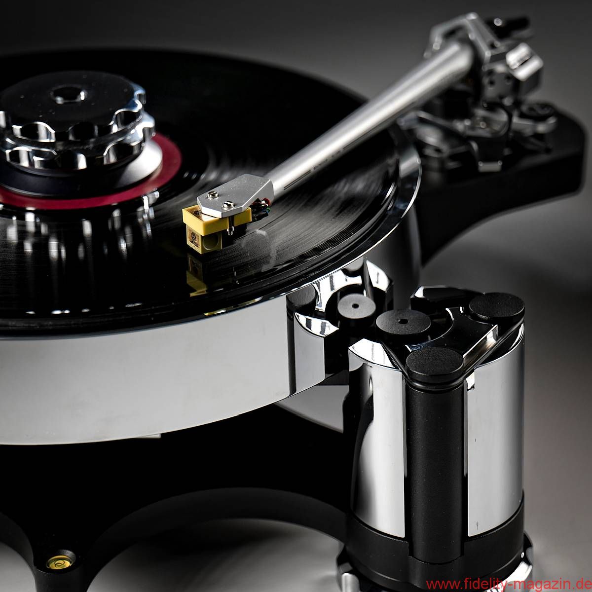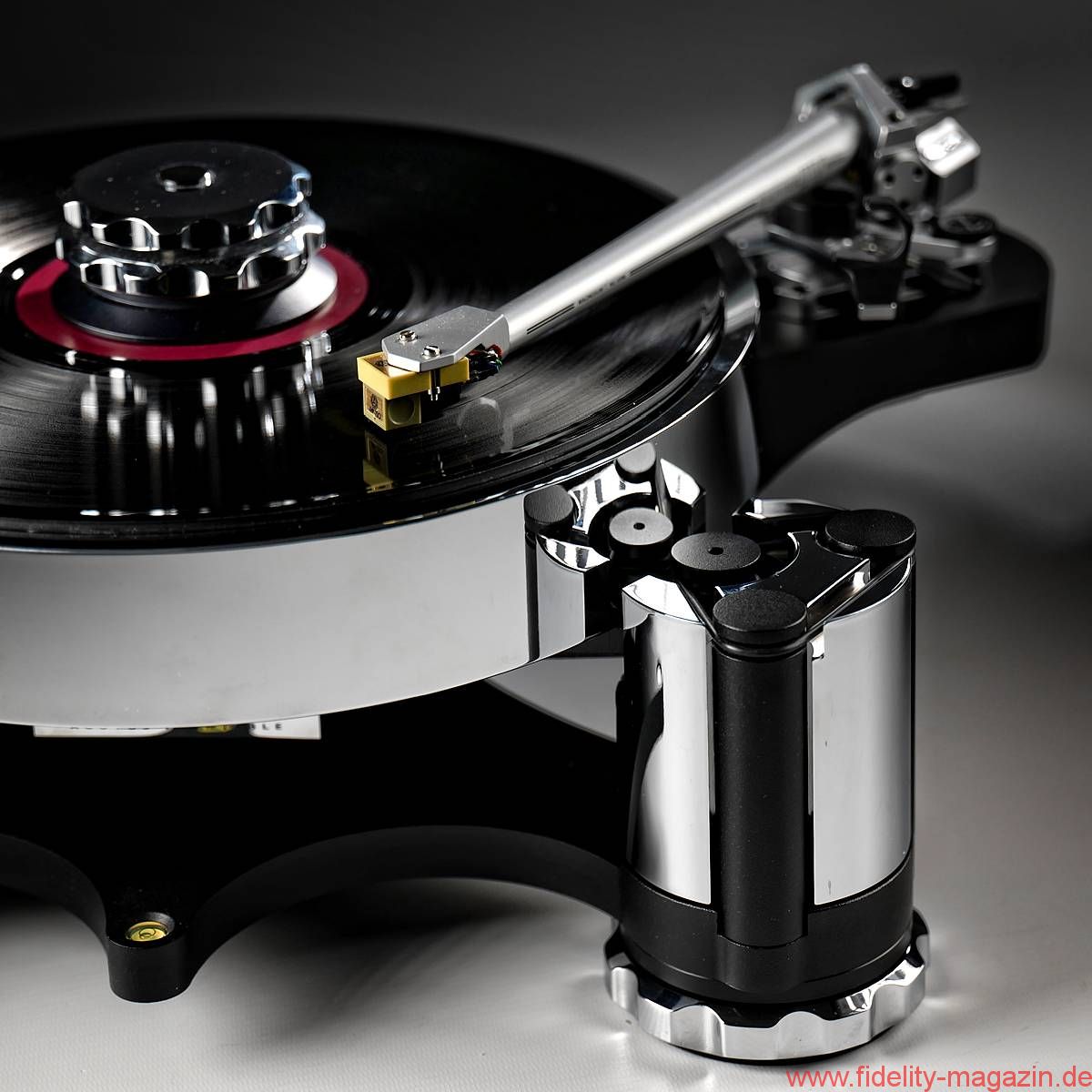 Bevor man den Teller endgültig überstülpt, sollte man an die Antriebsriemen denken. Zwei Rundriemen müssen um den Subteller gelegt und mittels eines zweinutigen Splints zum Tellerrand gespannt werden. Dann peilt man unter dem Teller das Pulley an, zieht den Splint aus seiner winzigen Bohrung und lässt die Riemen über die Motorachse flitschen. Vorsicht, dass der Splint nicht mitfliegt, einige Kratzer unterm Teller des Testgeräts könnten genau daher stammen. Die Telleroberfläche besteht eigentlich aus einer reflektierenden, transparenten Matte; ihre schwarze Farbe rührt vom durchscheinenden anodisierten Metall her. Diese spezielle Auflage soll Vibrationen der Abtastung – unüblich für massereiche Teller – gar nicht erst eindringen lassen, sondern unmittelbar über das Lager ableiten. Dass Vibrationen aus beiden Richtungen – also von Umwelteinflüssen einerseits und abtastbedingt andererseits – gleichermaßen der Kampf angesagt wird, macht meines Erachtens die Einzigartigkeit dieses Designs aus. Laut Conrad Mas spielt sogar die Verchromung bzw. Vergoldung des Tellers eine klangentscheidende Rolle, da sie die Resonanzfrequenz verringert und ihn vor HF-Einstrahlung schützt. Da kann man nichts machen, außer mit der makellos glänzenden Oberfläche leben zu lernen.