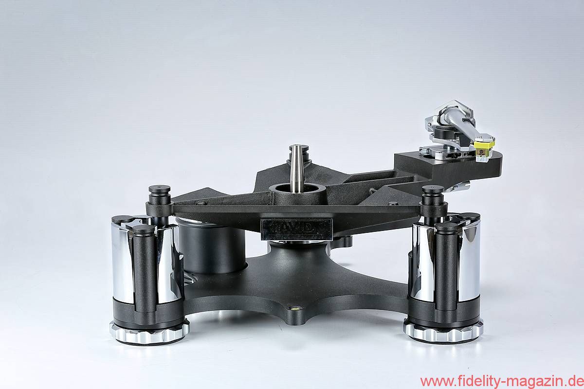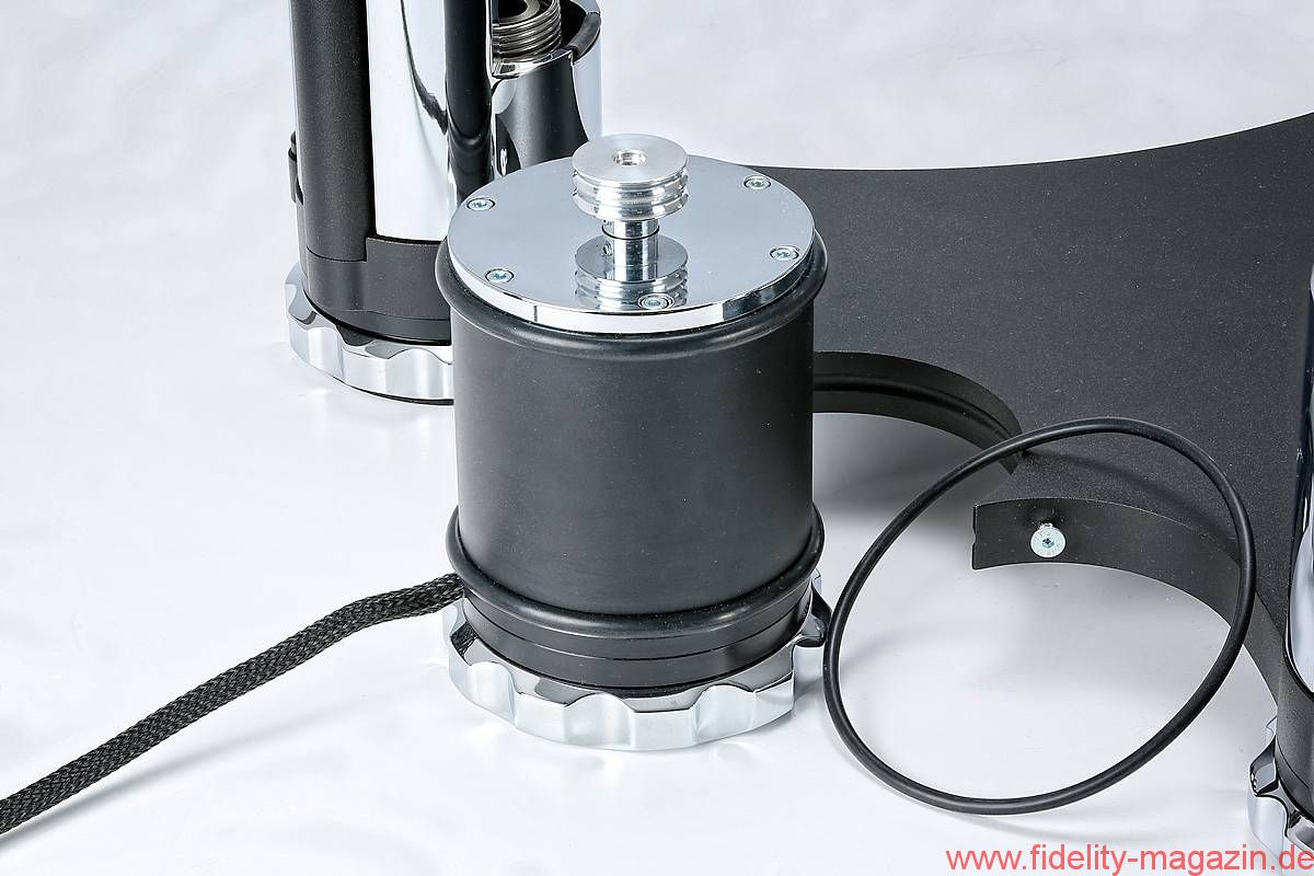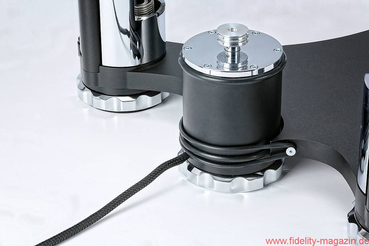 Die Basis mit drei regulierbaren Füßen besitzt eine Libelle zur Ausrichtung. Ich empfehle dennoch, schon im Vorfeld für einen perfekt ebenen Untergrund zu sorgen, denn wenn man den Regelbereich der Schraubfüße überstrapaziert, kann es nachher Probleme mit der Riemenführung über das Motorpulley geben. Der äußerst kräftige Synchronmotor findet in einer Ausbuchtung Platz und wird mit einem dicken Gummiring daran fixiert. Im von oben betrachtet pfeilförmigen Subchassis findet sich ebenfalls eine halbrunde Aussparung, die dessen Stellung vorgibt. Man lässt nur die Kolben des Subchassis in die Federtürme gleiten, wo sie der sehr leicht anzuregenden Konstruktion zum Trotz sicher Halt finden.