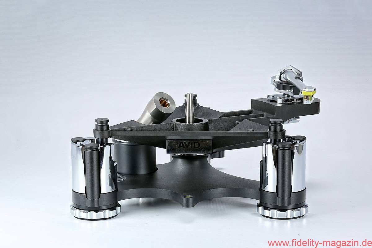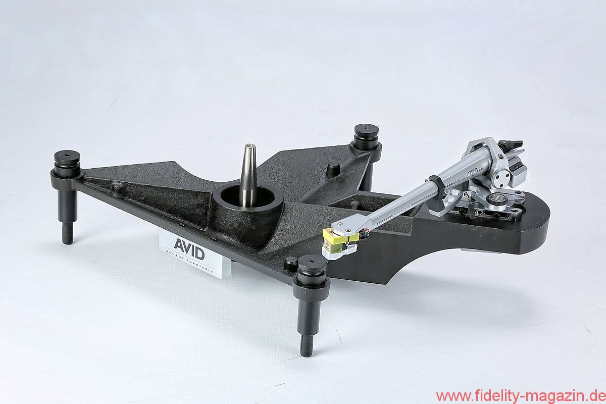 Um Resonanzen auf der neuralgischen Achse zwischen Tonarm und Tellerlager zu verhindern, weist das Subchassis einen ungewöhnlichen fachwerkartigen, dreidimensionalen Aufbau auf. Wenn Mikrovibrationen nicht zu verhindern sind, so Conrad Mas, muss man sie akzeptieren und mit ihnen arbeiten. Deshalb befinden sich zwischen den stabilen Dreiecksstreben flexiblere Flächen, die Energie schlucken. In der Mitte ragt die massive Achse des invertierten Tellerlagers konisch empor. Lateral wird der Teller nur über eine schmale Sinterbronzehülse geführt, oben liegt er mit einem Saphirspiegel auf einer kleinen Wolframkarbidkugel. Der poröse Spiegel nimmt die Kugel in einer Mulde auf, darüber hinaus soll der Lagerspalt so gering sein, dass die selbstschmierende untere Hülse fast wie ein Öldrucklager arbeitet, wie Conrad Mas erläutert. Taumelnde Teller oder asymmetrisch eingelaufene Lagerkugeln sollen bei AVID nicht vorkommen.