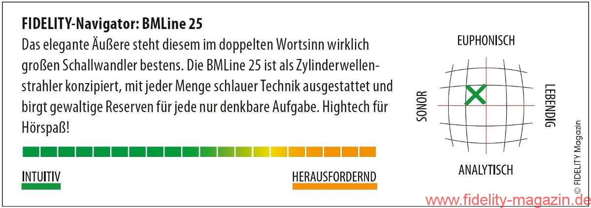 Sehr angenehm finde ich auch, dass man bei der BMLine 25 im Raum umherlaufen kann, ohne dass die hohen Lagen wie bei vielen anderen Schallwandlern nennenswert dunkler werden oder gar „absaufen“. Mit ihr kann man daher auch mal bedenkenlos im Wohnzimmer ausgelassene Steh- und Tanzpartys feiern, was angesichts ihrer immensen Dynamikreserven übrigens ausgesprochen großen Spaß macht. Der ist bei der BMLine 25 ohnehin unter allen Umständen garantiert – aber das haben Sie sicherlich schon längst herausgelesen.