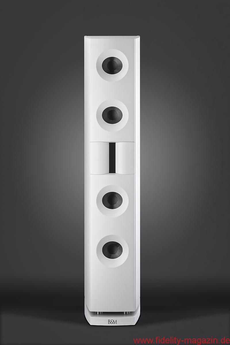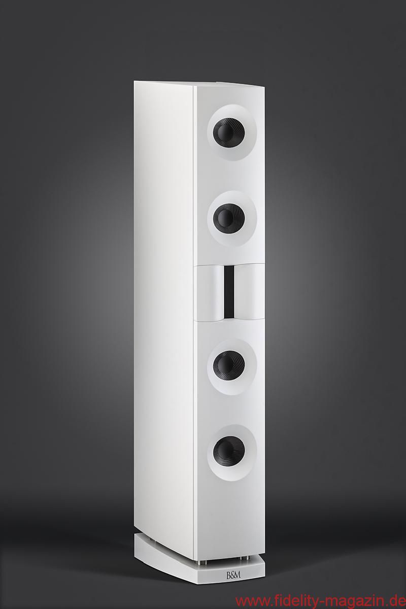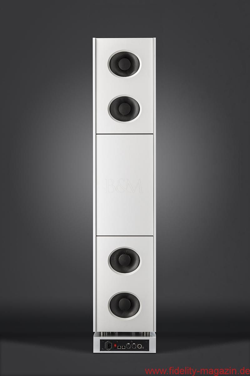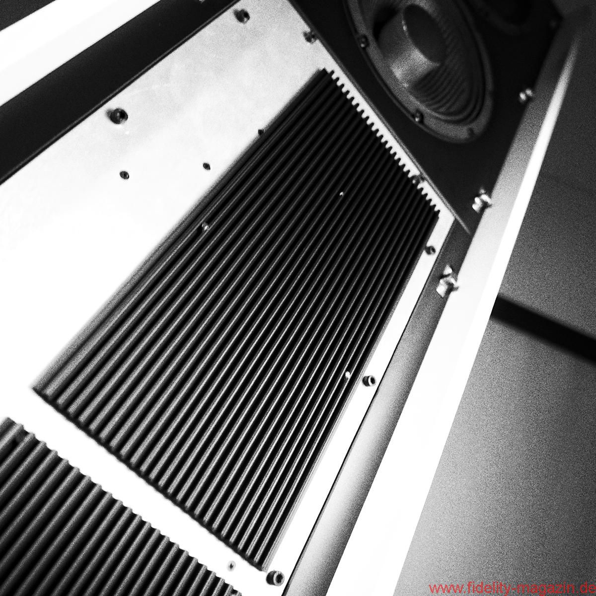 Quasi ein technisches Markenzeichen für die B&M-Schallwandler sind Basschassis mit elektrodynamischer Membrangegenkopplung (DMC) zur Korrektur eventueller „Bewegungsfehler“: Bei der BMLine 25 kümmert sich pro Box gleich ein ganzes rückseitig angeordnetes Quartett solcher DMC-Achtzöller um die Tiefton-Arbeit – angetrieben von jeweils eigenen, analog arbeitenden MOSFET-Endstufen, deren Gegenkopplungspfad individuell auf jedes Chassis eingemessen wird. Wie bei Aktivlautsprechern üblich, verfügen auch Tiefmittel- und Hochtonzweig der BMLine 25 über eigene, ebenfalls analog mit MOSFETs verstärkende Endstufen. Für besten Rauschabstand erfolgt die Lautstärkeeinstellung auf analoger Ebene unmittelbar vor allen beteiligten Endverstärkern: Klangverluste durch Wortbreitenreduzierung wie bei digitaler Lautstärkeeinstellung sind durch diese „Full Scale Volume Control“ (FSVC), wie B&M sie nennt, ebenfalls ausgeschlossen.