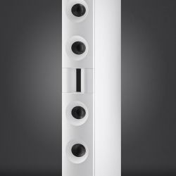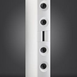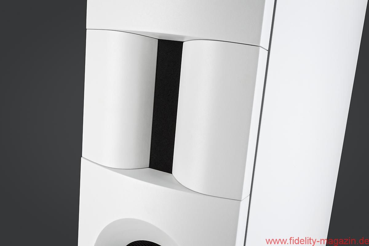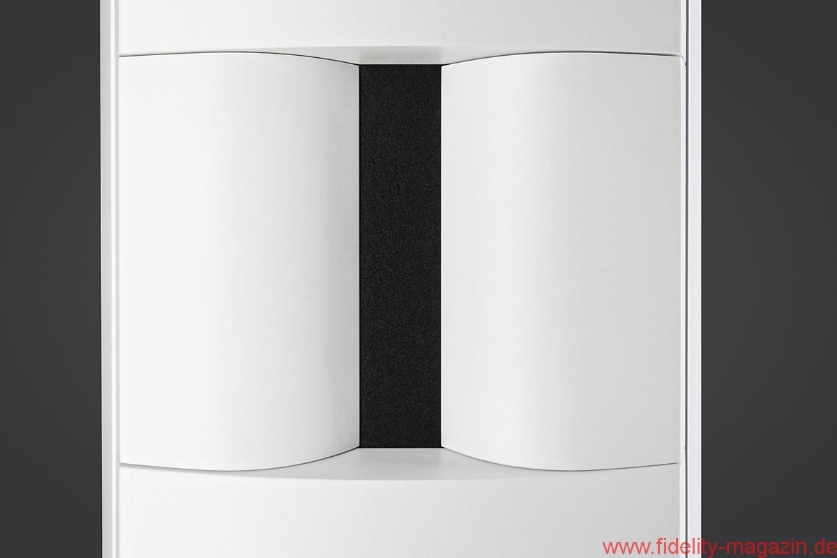 Elektroakustisch zählt die BMLine 25 zu den Linienstrahlern, wie man sie öfter bei Backes & Müller findet. Ein Kennzeichen von Linienstrahlern (wenn richtig dimensioniert) ist ihr horizontal breites, vertikal jedoch gerichtetes Abstrahlverhalten. Dieses Konzept bewirkt weniger Schallreflexionen von Boden und Decke, was am Hörplatz zu gesteigerten Direktschallanteilen und damit unmittelbarerem Klang führt. Unterstützt wird das durch die exakt dimensionierten, kurzen Hornvorsätze (Waveguides) vor den vier frontseitigen 6,5-Zoll-Tiefmitteltönern: Sie sorgen zudem für ein konstantes Abstrahlverhalten beim Übergang zum magnetostatischen Zylinderwellen-Hochtöner, was einem gleichmäßigen Raumeindruck im ganzen Tonspektrum zugutekommt. Auch koppelt der Hochtöner mit einer Trennfrequenz von 850 Hz erstaunlich niedrig an, sodass die BMLine 25 im gesamten für die Definition zuständigen Frequenzbereich praktisch mit nur einer Tonquelle arbeitet.