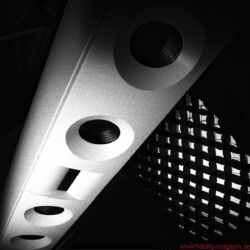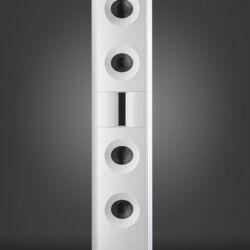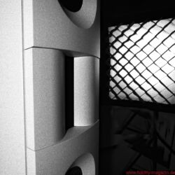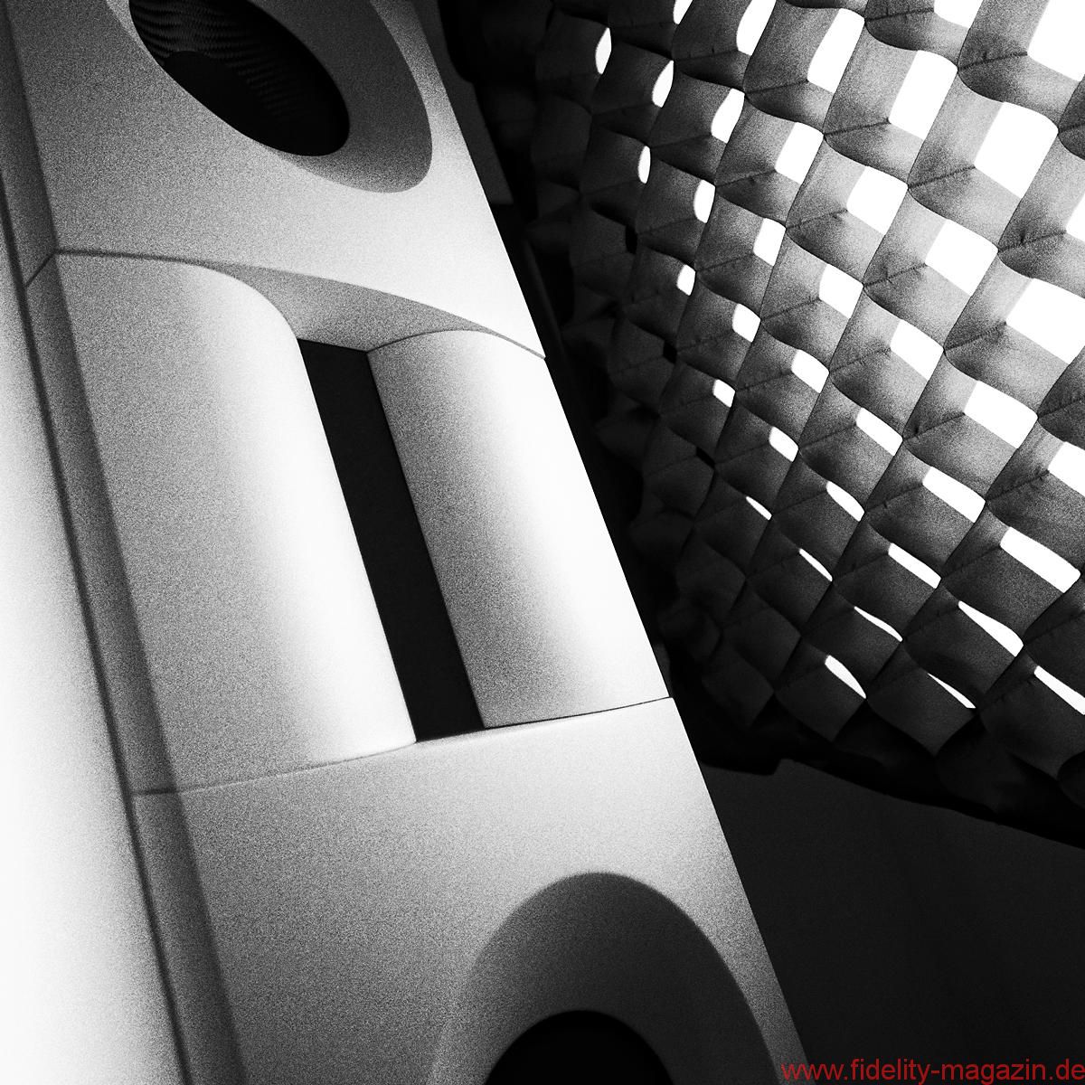 Schon sind Johannes Siegler und André Hammerschmidt zur Stelle, um Ingo Schulz’ und meine technische Neugier unmittelbar am Objekt zu stillen. „Warum sind denn eigentlich die Öffnungen der Waveguides oval und zudem kleiner als die Tiefmitteltöner-Mebranen?“, lautet meine erste Frage. Halt! Stop! So wird das nichts – schließlich war nicht geplant, dass mein Bericht nachher über das ganze Heft geht; die Wahrscheinlichkeit, sich in den technischen Untiefen der BMLine 25 zu „verschreiben“, ist ja recht hoch … Darum hier zunächst mal die wichtigsten Fakten: Bei der BMLine 25 handelt es sich um eine rund 160 Zentimeter hohe, schlanke Standbox in Aktivtechnik. Die gesamte Elektronik einschließlich aller Anschlüsse ist in einem aus dem Vollen gefrästen Corian-Sockel untergebracht (das Kunststeinmaterial kommt vom Spezialisten DuPont). Das eigentliche Lautsprechergehäuse weist daher weder außen liegende Kühlkörper noch irgendwelche Verschraubungen auf – und damit auch nichts, was die Schallabstrahlung beeinflussen könnte.
