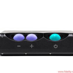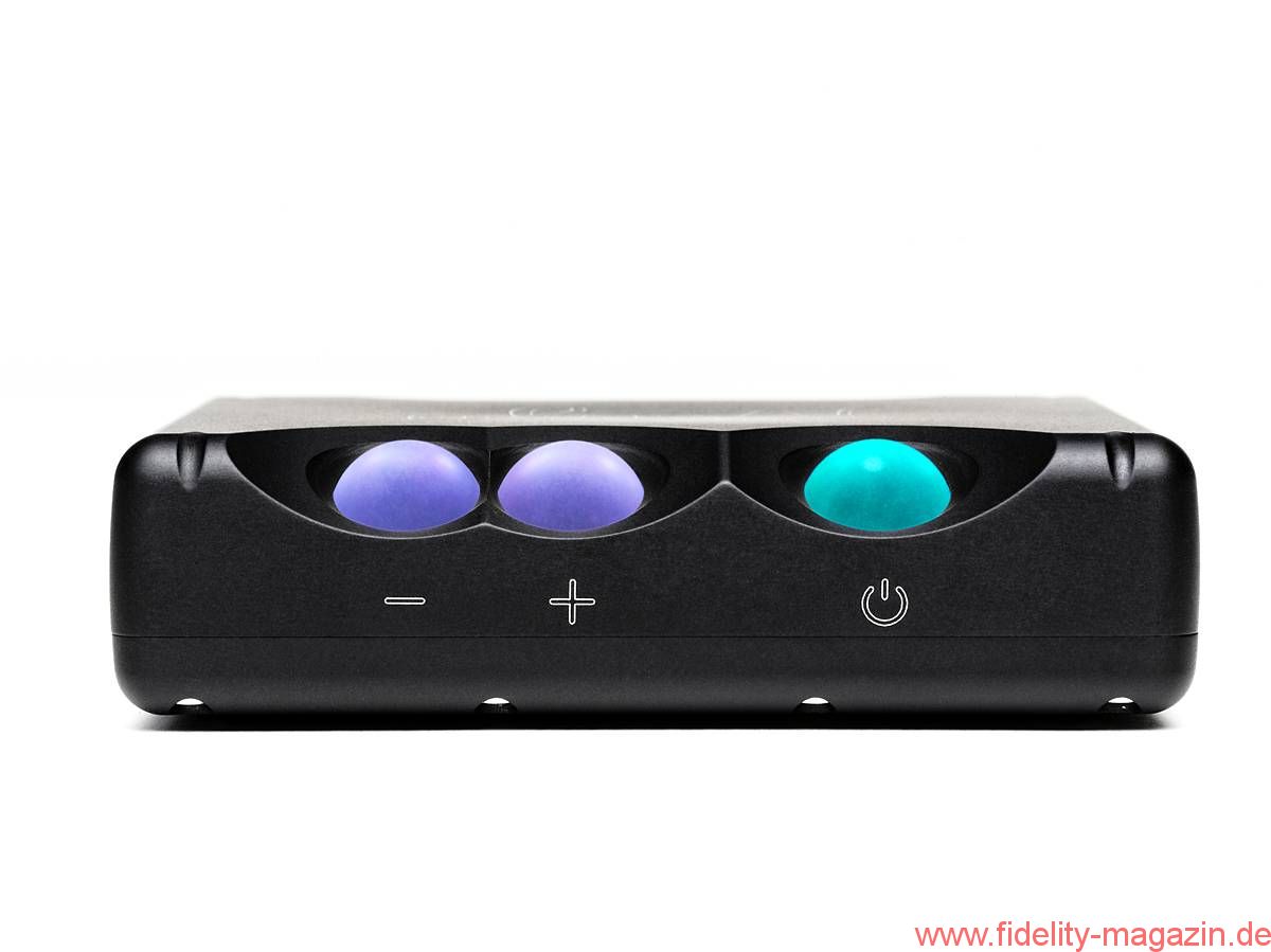 In London waren Kopfhörer aller Größen und Preisklassen und etliche feine Mediaplayer verfügbar. Tracks, die ich auf dem iPhone in Vollauflösung stets parat habe, öffneten mir dabei Aug und Ohr: Auflösung, Dynamik und Spielfreude des Mojo sind superb und liegen weit jenseits dessen, was man einem derart kompakten Produkt zutraut. Die Steuerung ist bequem und supereinfach: Drei opake Leucht-Taster zeigen Samplingfrequenz und Abhörpegel an, indem sie farblich variieren. Beim Einschalten läuft gar eine Art Regenbogenshow ab – witzig. Wer die Lautstärkeanzeige dann im Betrieb durch das Farbspektrum laufen lässt, erlebt praktisch jeden beliebigen Pegel zwischen sanfter Brise und Donnerlüttchen.