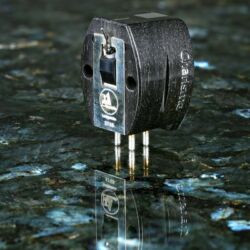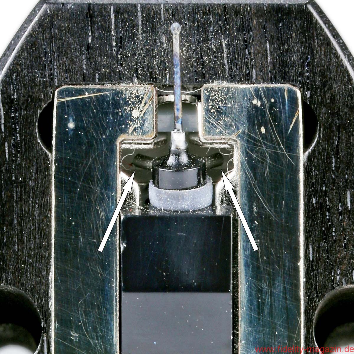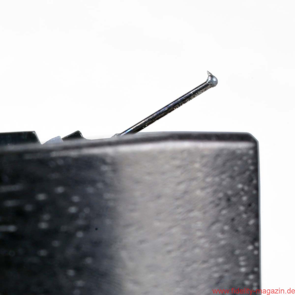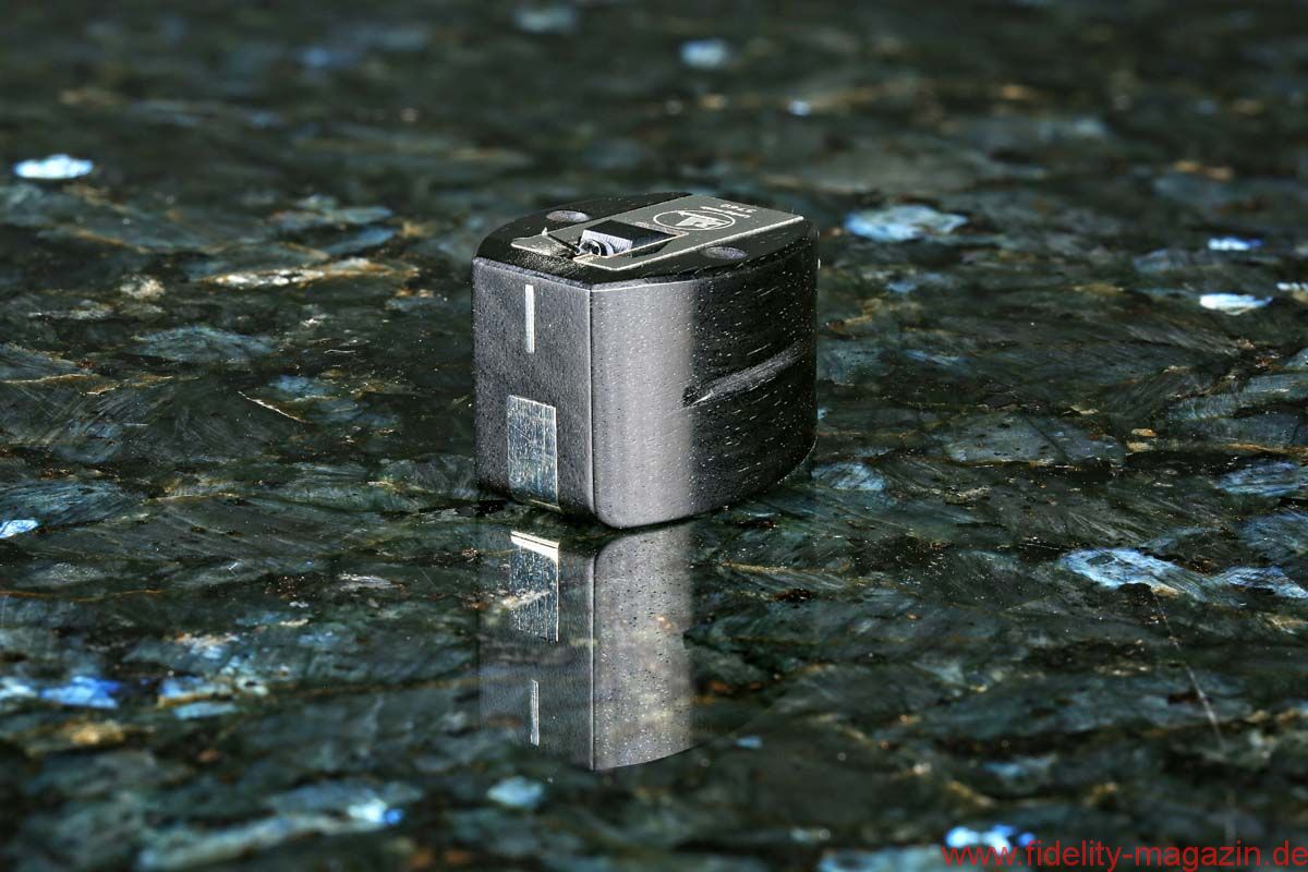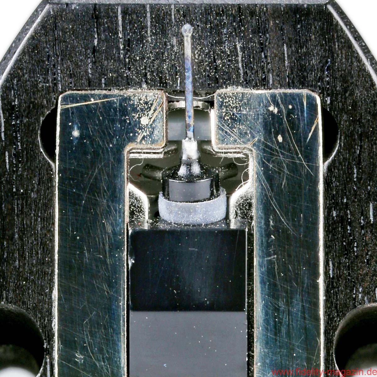 Die kleineren Geschwister unterscheiden sich bei Clearaudio oft nur durch den Selektionsgrad der verwendeten Bauteile. Für den charismatischen König der bewegten Magnete wurde aber erheblich mehr investiert. Ein gutes Jahr wurde probiert, verglichen, verworfen und immer wieder gehört. Daher wundert es nicht – sowohl angesichts des Klanges als auch der geforderten fünfzehnhundert Euro –, dass nur die feinsten Zutaten des Hauses zum Einsatz kommen. Den Bor-Nadelträger samt doppelt poliertem Diamanten mit Gyger-S-Schliff findet man auch am Übertonabnehmer Goldfinger Statement. Statt den winzigen Diamanten wie üblich mittels Kleber zu fixieren, wurde er zunächst mit höchster Präzision auf seinem Träger justiert und dann in das Bor-Röhrchen gepresst. Nur ein mikroskopisch kleiner Kleberklecks fixiert sicherheitshalber, ohne zu viel Energie zu absorbieren. Die Selektion der für die sportliche Ausgangsspannung nötigen leistungsstarken Magnete dürfte ihre Zeit in Anspruch genommen haben – Clearaudio spricht von hundertprozentigen Paarungen. Auch auf die Feinabstimmung des Resonanzverhaltens wurde Wert gelegt. Ein handpolierter Ebenholzbody mit präzise in Material und Masse herausgehörter Neusilber-Einlage lieferte dann das gewünschte – im Zusammenspiel mit Antrieb und Auslesefähigkeit perfekt harmonierende – Ergebnis.