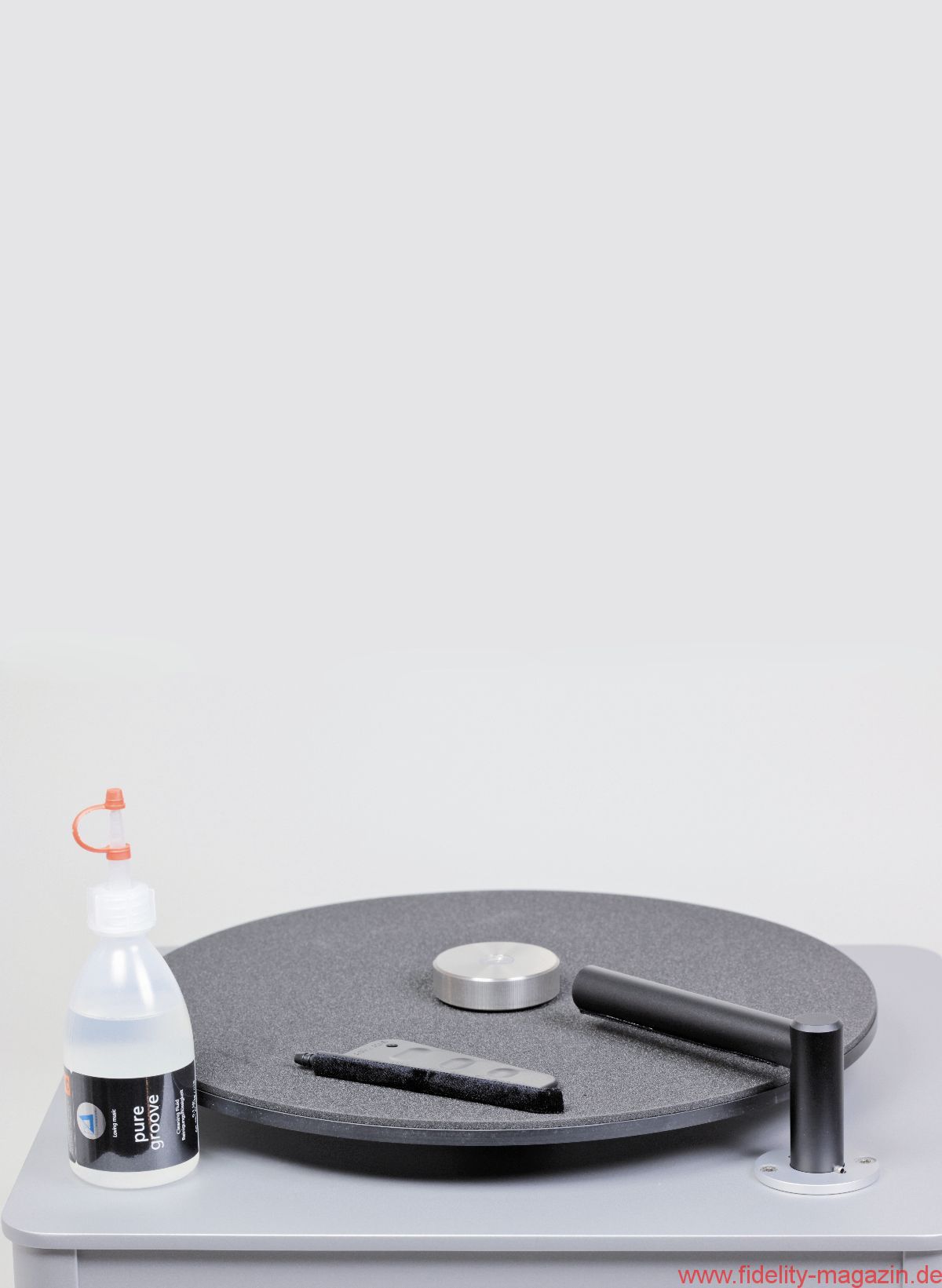 Zur Praxis: Das Fläschchen mit der „pure groove“ getauften Reinigungsflüssigkeit gibt ein ausgezeichnetes Spritzfläschchen ab. Die Mikrofaserbürste vermittelt im Einsatz das angenehme Gefühl von plattenschonender Gründlichkeit – vielleicht lege ich mir eine als Tuning-Teil für meine Maschine zu, oder als Zweitbürste für besonders hartnäckige Fälle.