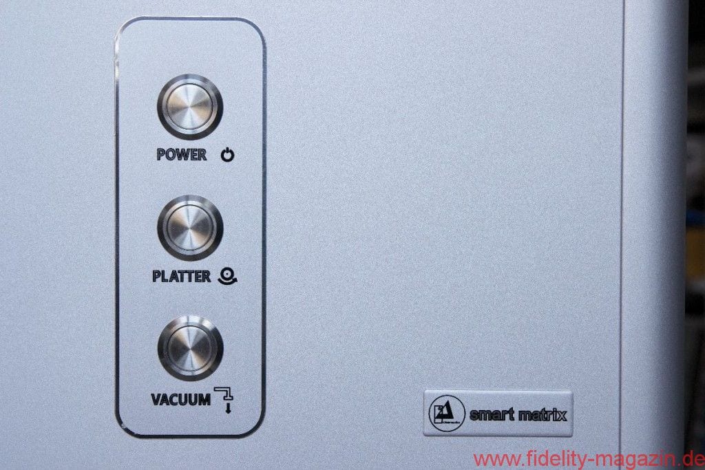 Was heute unter dem Namen Smart Matrix Professional zu, oha, Tausenden jährlich die Clearaudio-Fertigung verlässt, sieht nun ohne Wenn und Aber einfach schick aus. Das Gehäuse aus wasserfester hochdichter Faserplatte schimmert in matt silbernem Aluminium-Ton. Die Steuerung der wenigen Funktionen (Motor an/aus, Drehrichtungsumschaltung, Pumpe an/aus) geschieht über Metall-Druckschalter mit durchaus audiophiler Haptik. Eigentlich alles fasst sich schlicht gut an, ganz besonders aber der massive Metallpuck, mit dem die Platten auf der festen Schaumstoffmatte des Tellers fixiert werden.