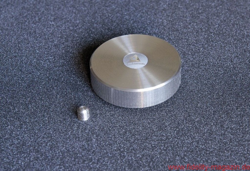 Der Fixierpuck der Clearaudio lässt sich perfekt handhaben. Das griffige Metallteil ist ohne Fummelei wahrlich im Handumdrehen festgeschraubt und schont mit einer recht breiten Auflagefläche das Plattenlabel.