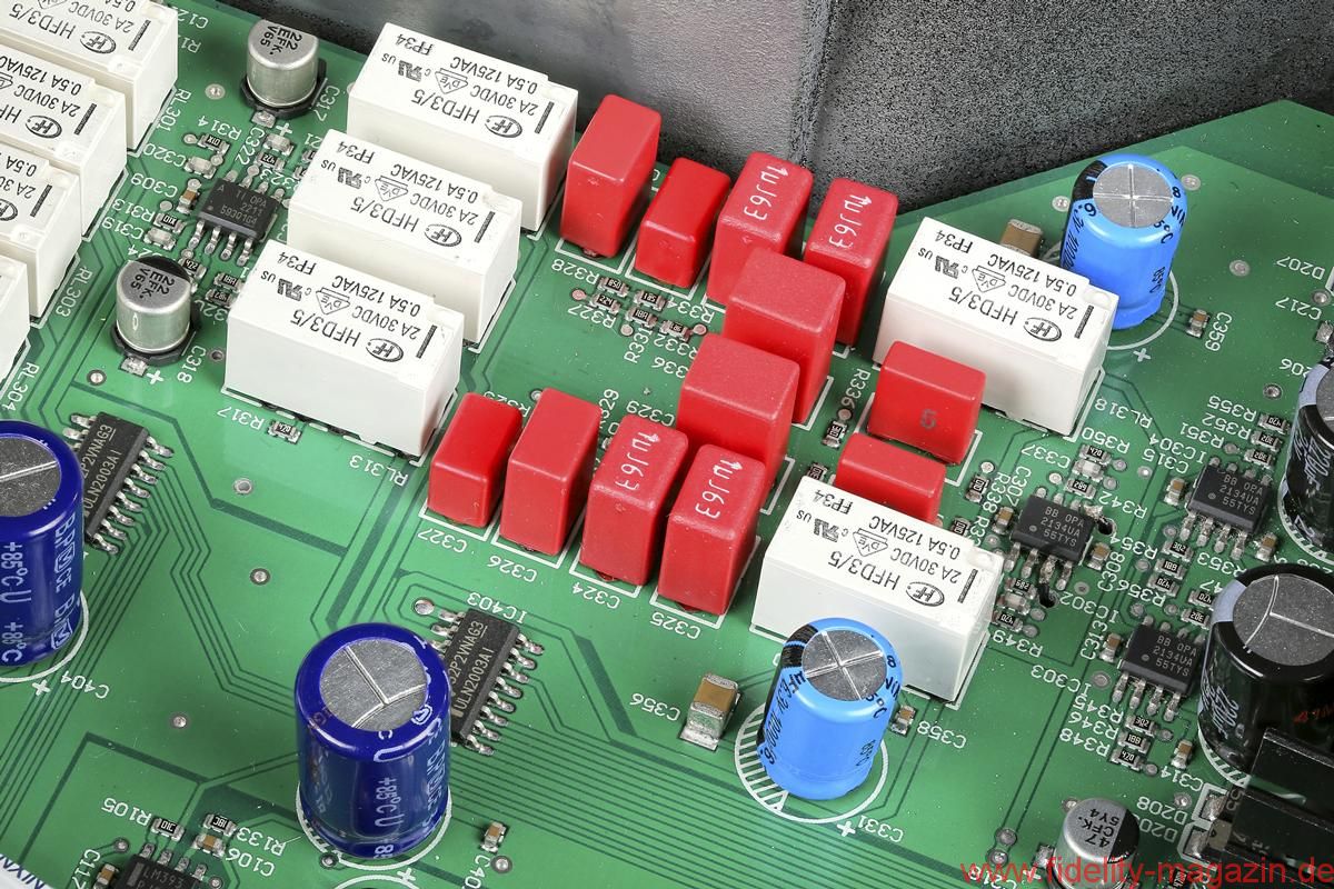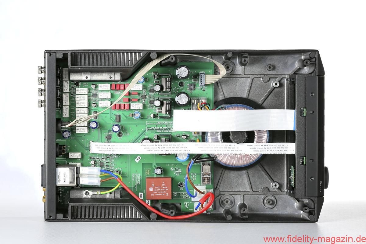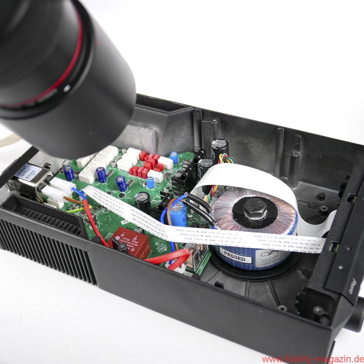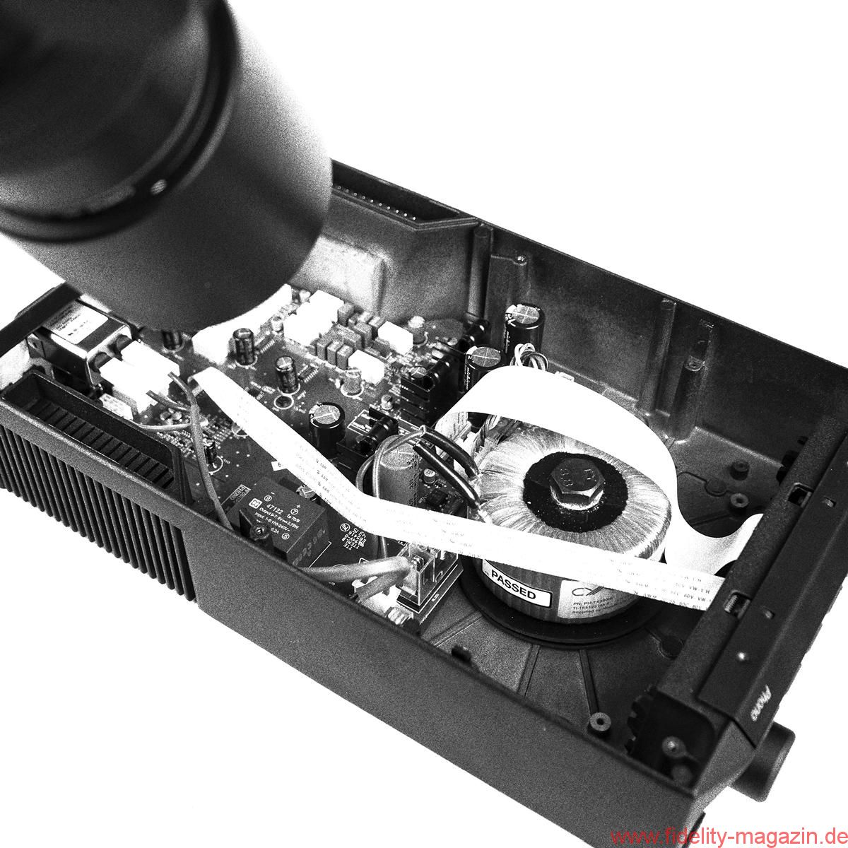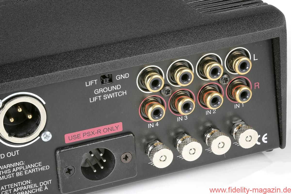 Wie bei bei allen Mitgliedern der Signature-Familie befinden sich hier auf der Rückseite neben Cinch- auch symmetrische Ausgänge in Form von XLR-Buchsen, sodass es aufgrund der vielen Anschlussmöglichkeiten ziemlich gedrängt zugeht. Als Spezialität bietet Cyrus die Möglichkeit, mittels des optionalen Netzteils PSX-R2 die Stromversorgung des Phono Signature zu optimieren. Leider stand es mir während des Testzeitraums nicht zur Verfügung. Sobald das externe Netzteil angeschlossen ist, muss sich das interne nur noch um die Relais und das Display kümmern, während alle Audioschaltkreise vom PSX versorgt werden. Über Details der eigentlichen Verstärkerschaltung schweigt sich Cyrus Audio weitgehend aus.