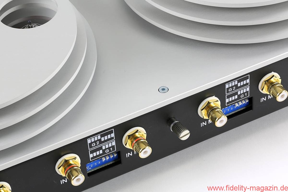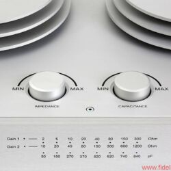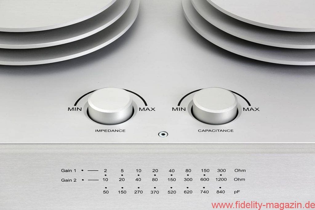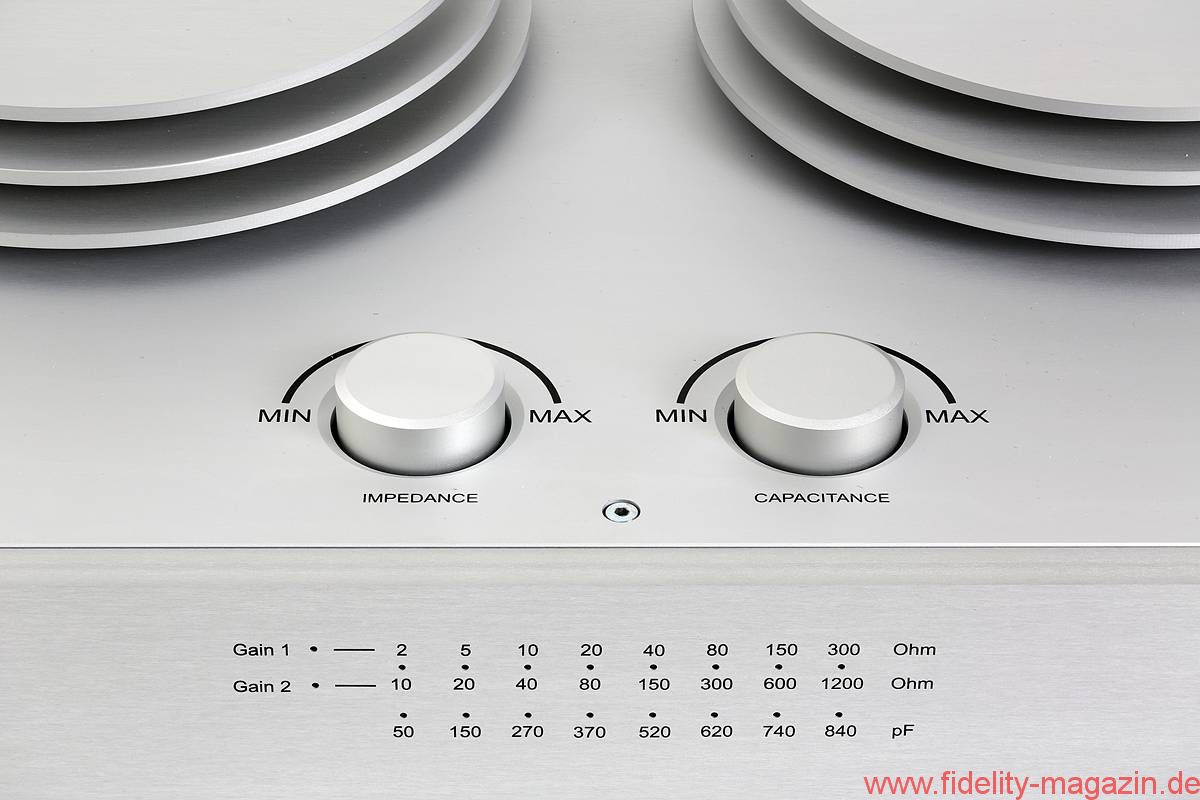 Besonderheiten: externes Netzteil, Impedanz/Gain schaltbar (10−1200 Ω/70 dB; 2-300 Ω/76 dB); Kapazität Phono MM schaltbar (50-840 pF), Gain MM 46 dB, Subsonicfilter 12 dB/Oktave