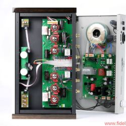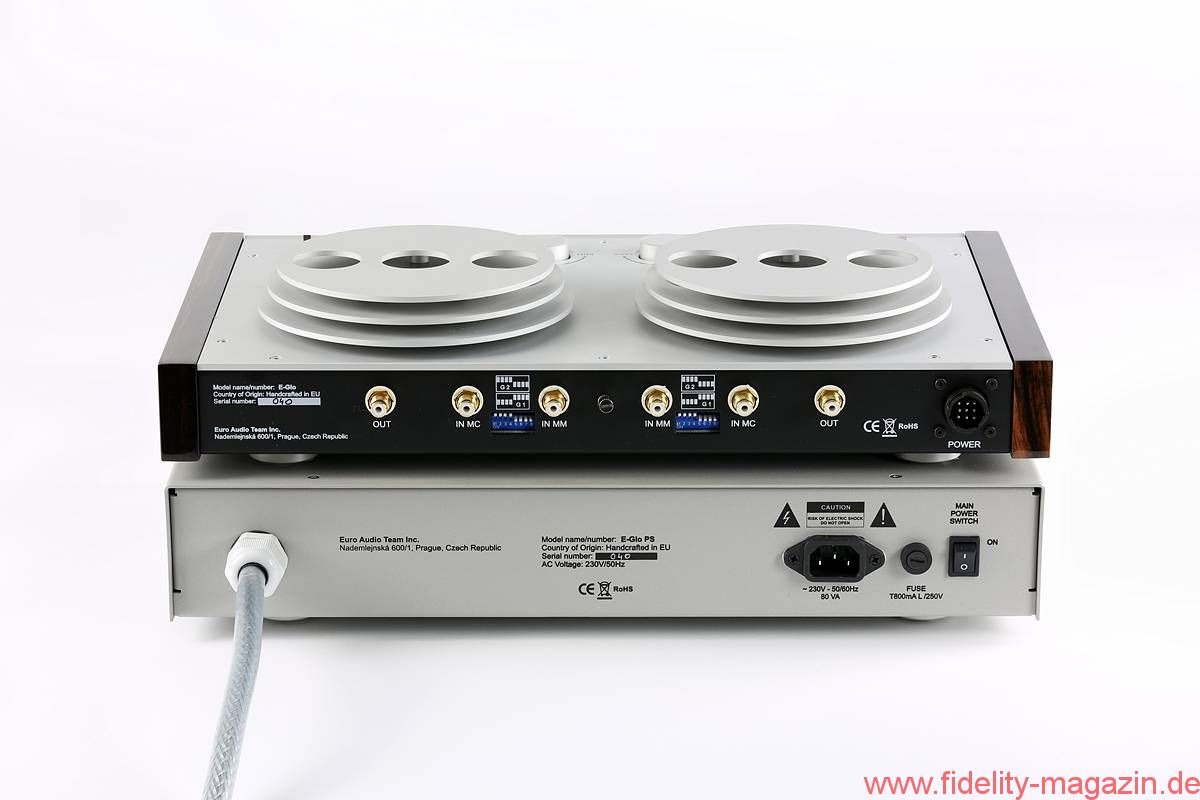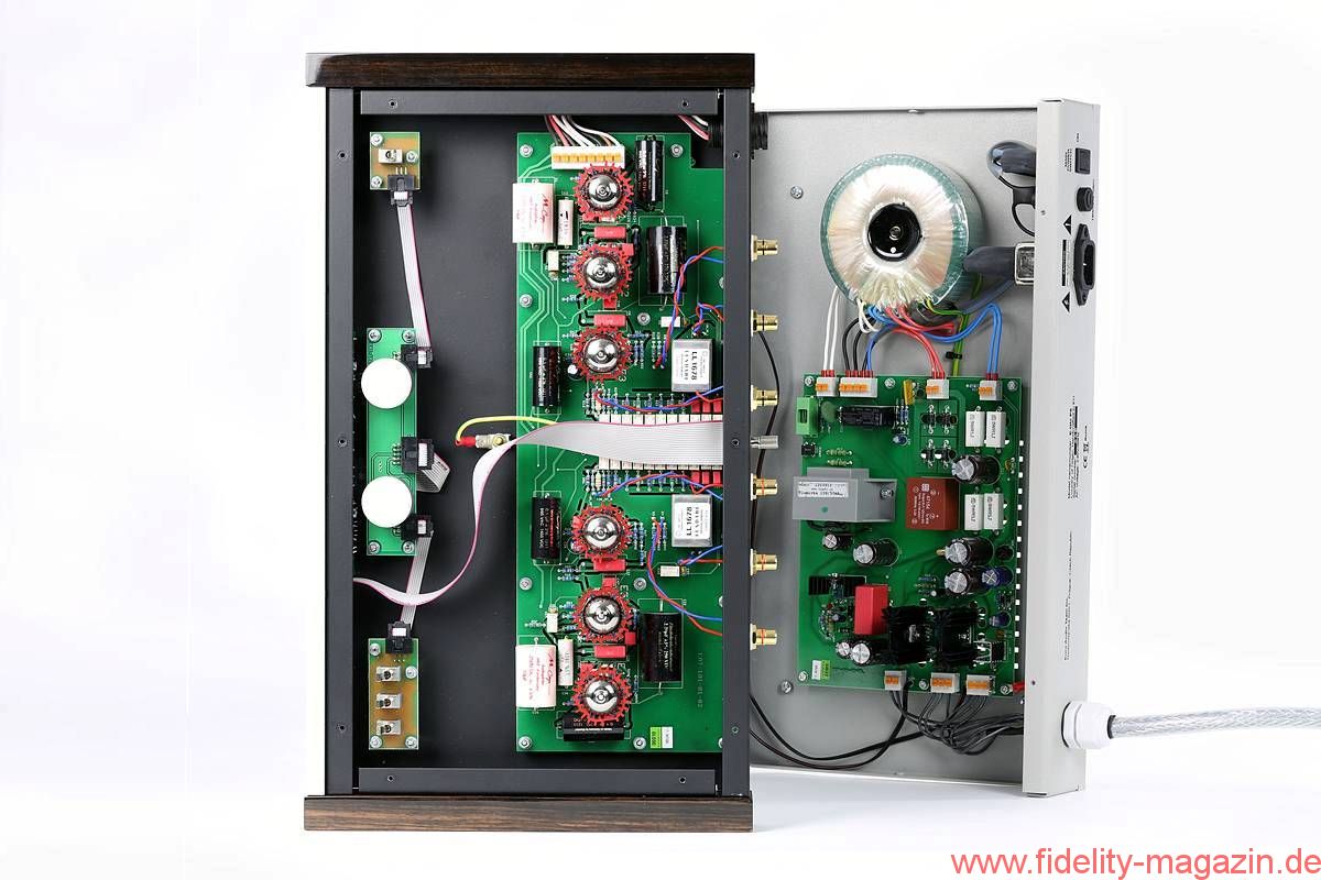 In dem in Tschechien gefertigten E-Glo sind das insgesamt vier ECC83 und zwei ECC88. „Sand“ kommt den Analog- und Röhren-Spezialisten aus Prag natürlich nicht in den Signalweg, außer vielleicht im Netzteil, wo auf Halbleitern basierende Spannungsregelung platzsparend sicher nicht schaden kann. Beim E-Glo betätigt sich nach einem Ringkerntrafo und einer speziellen Gleichrichterstrecke diesbezüglich ein FET (Feldeffekttransistor).