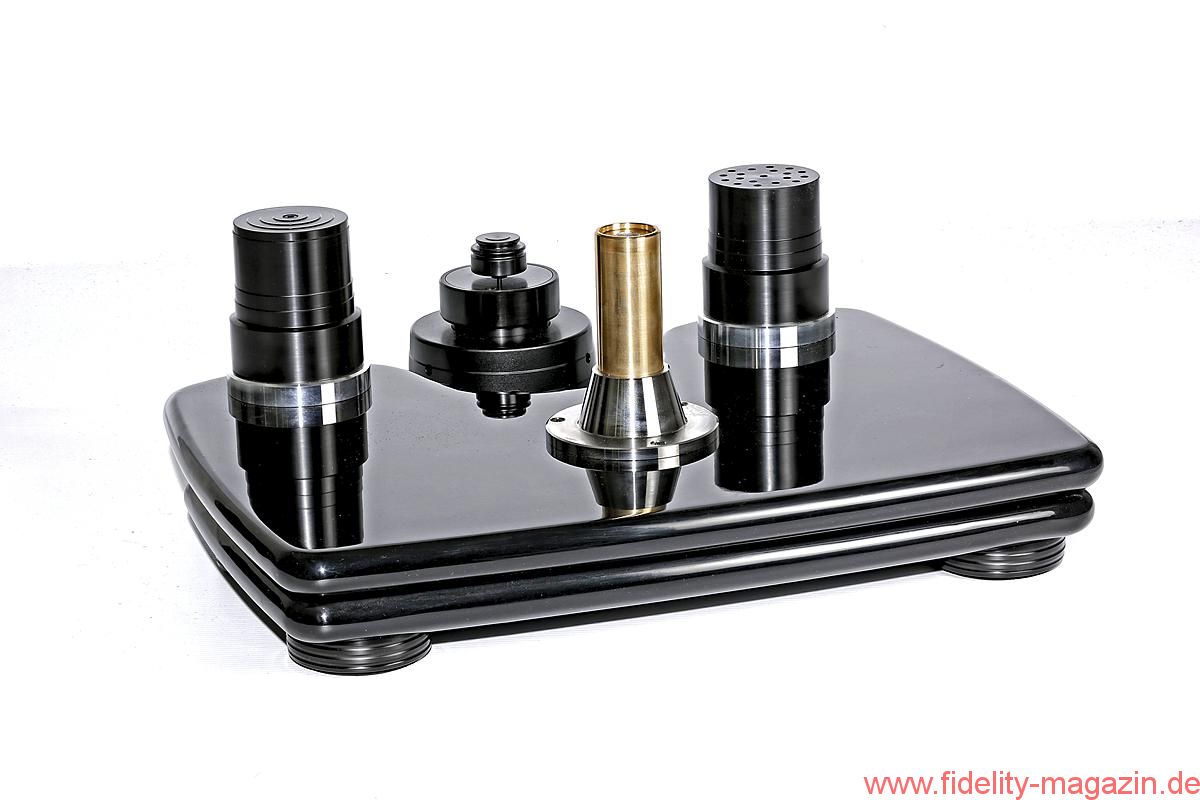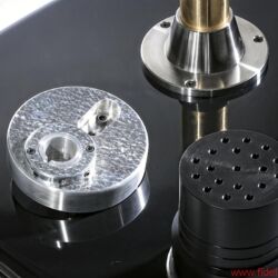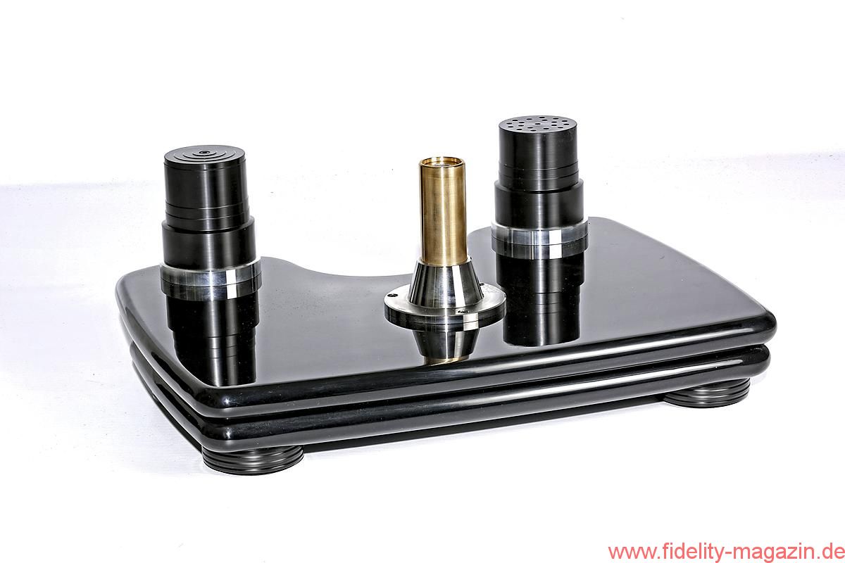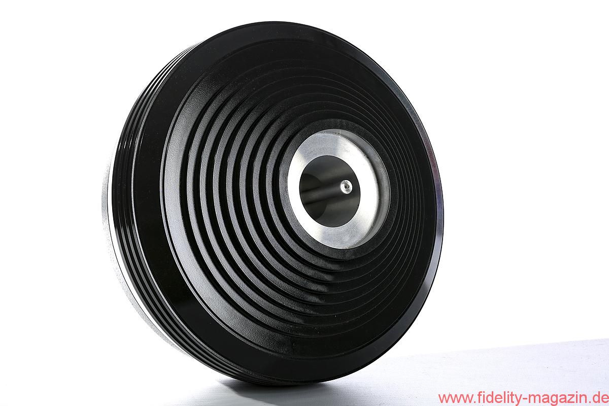 Doch kommen wir endlich zum Teller und damit zu dem in jeder Hinsicht dominierenden Stilelement. Seine einzigartige Form ist schwer zu beschreiben und erinnert eher an eine Skulptur denn an einen schnöden Plattenteller. Der große untere Teil wurde aus einem massiven Block einer Aluminiumlegierung gedreht und verdickt sich stufenweise nach oben. Nimmt man diesen auf dem Kopf stehenden Kegel vorsichtig (!) in die Hand und schnippt mit einem Finger gegen das Metall, stellt man fest, dass dieses Bauteil allem Anschein nach nicht zu Resonanzen neigt. Dies allein aber war den Entwicklern wohl noch nicht gut genug. Zum Teller gehört eine Bitumenmatte, auf der zusätzlich eine dicke Scheibe aus Carbon zu liegen kommt. Ebenfalls wieder typisch für Nottingham-Analogue-Laufwerke ist, dass der Teller an definierten Stellen von dicken Gummiriemen eingefasst wird. Aber der Löwenanteil der Resonanzarmut des gesamten Plattentellers dürfte bei dem aus dem Vollen gefrästen Aluminiumteil liegen, dessen Herstellung wohl auch maßgeblich für den Gesamtpreis des Black Diamond verantwortlich ist.