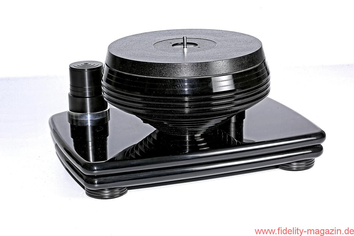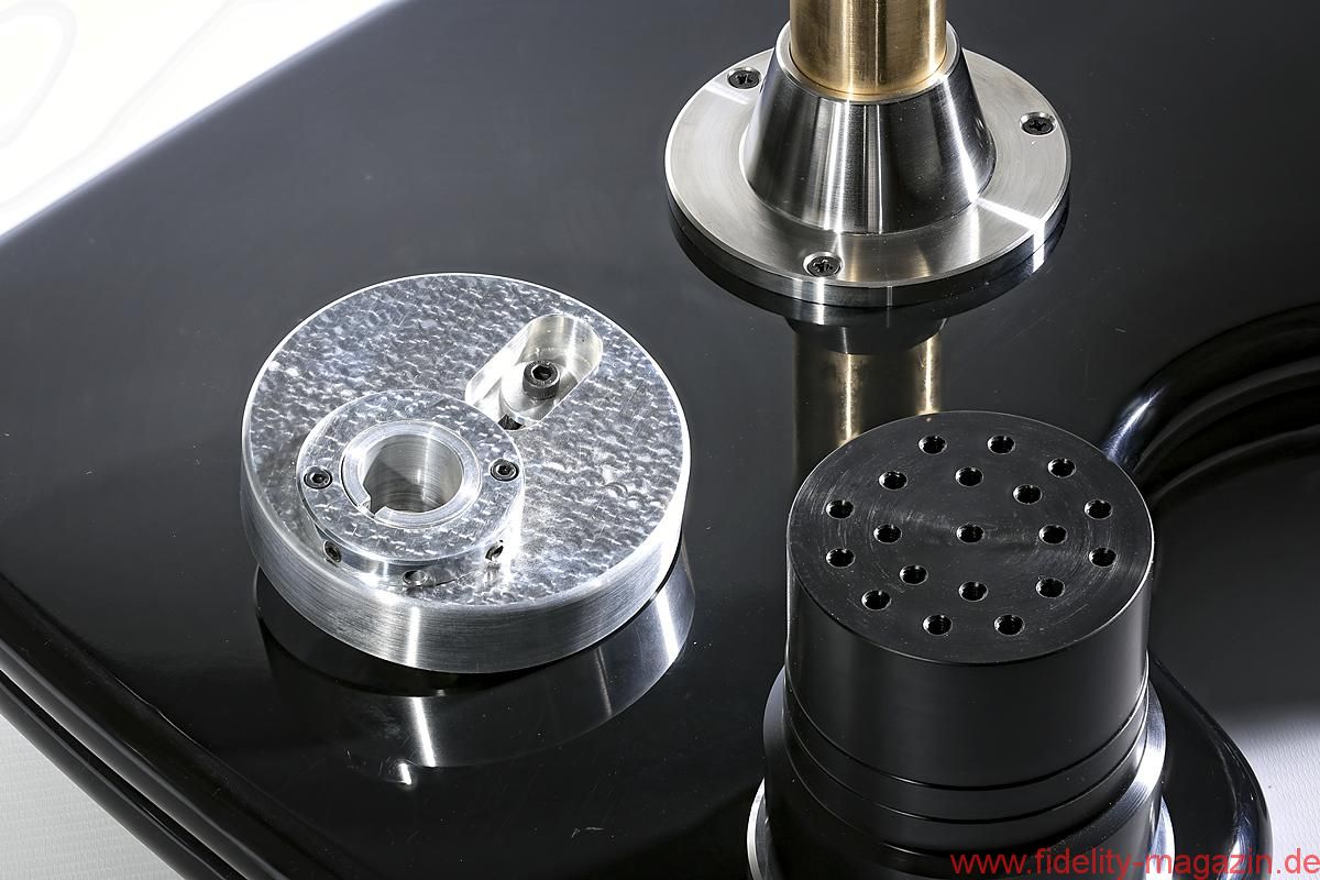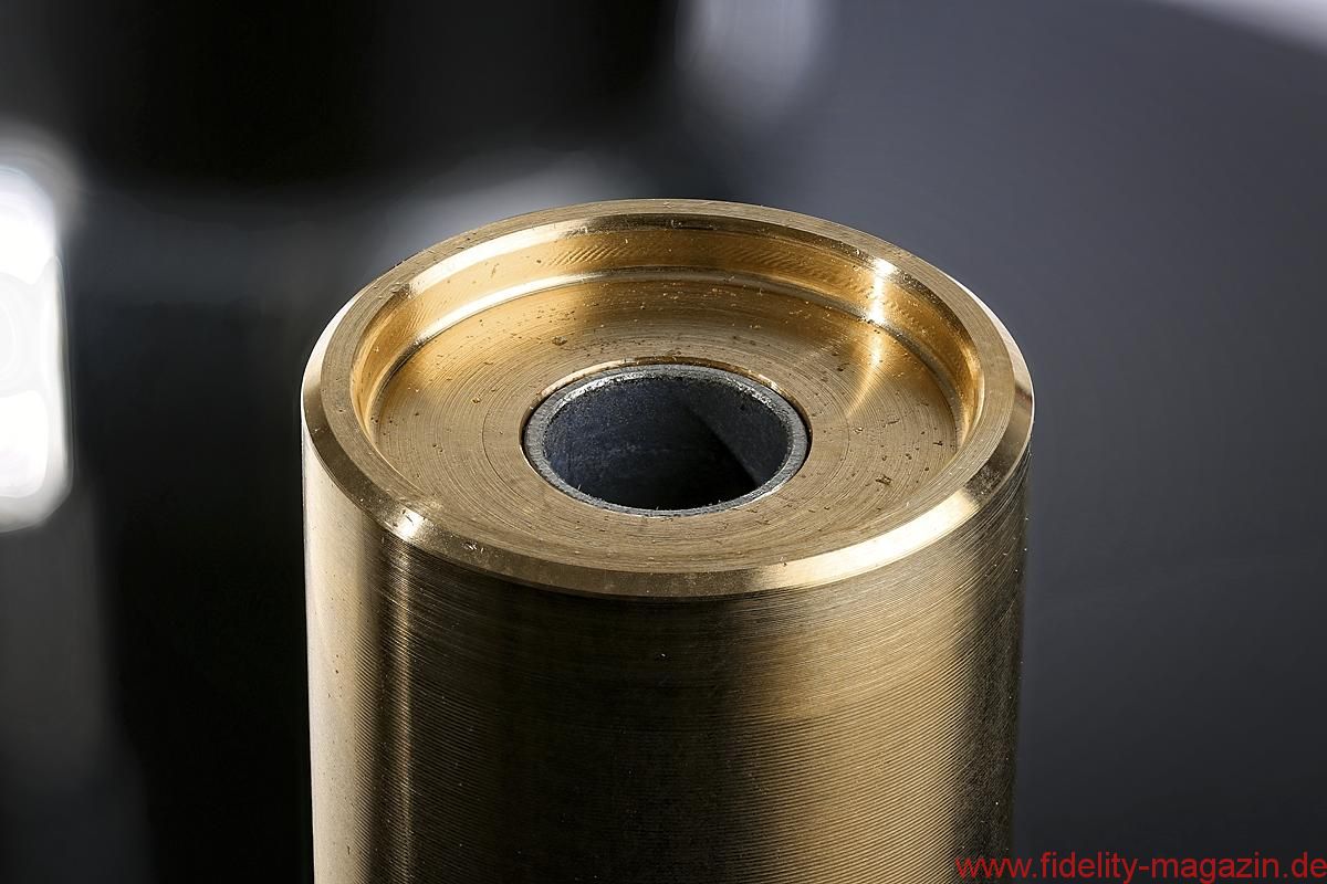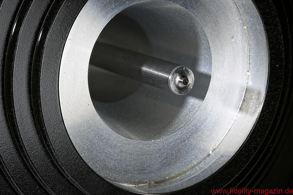Das gilt insbesondere auch für den wirklich beeindruckend dimensionierten Teller und sein nicht minder eindrucksvolles Lager. Es besteht aus einer Bronzebuchse, in der als Lagerboden eine stählerne Querstrebe dient. Der Lagerdorn aus speziell gehärtetem Stahl (außen hart, innen weich) ist keine kugelförmige „Spitze“, vielmehr ein kleiner Kegelstumpf. Dadurch entsteht kein Auflagepunkt, sondern eine „Auflagelinie“. Sie bewirkt, dass ein wirklich minimaler, aber genau definierter Reibungswiderstand entsteht und so den Motor ein ganz kleines bisschen unter Last hält – auch dann, wenn sich der Teller bereits mit der gewünschten Geschwindigkeit dreht. Das verspricht noch weniger Vibrationen, da im Allgemeinen Motoren unter Last ruhiger laufen.