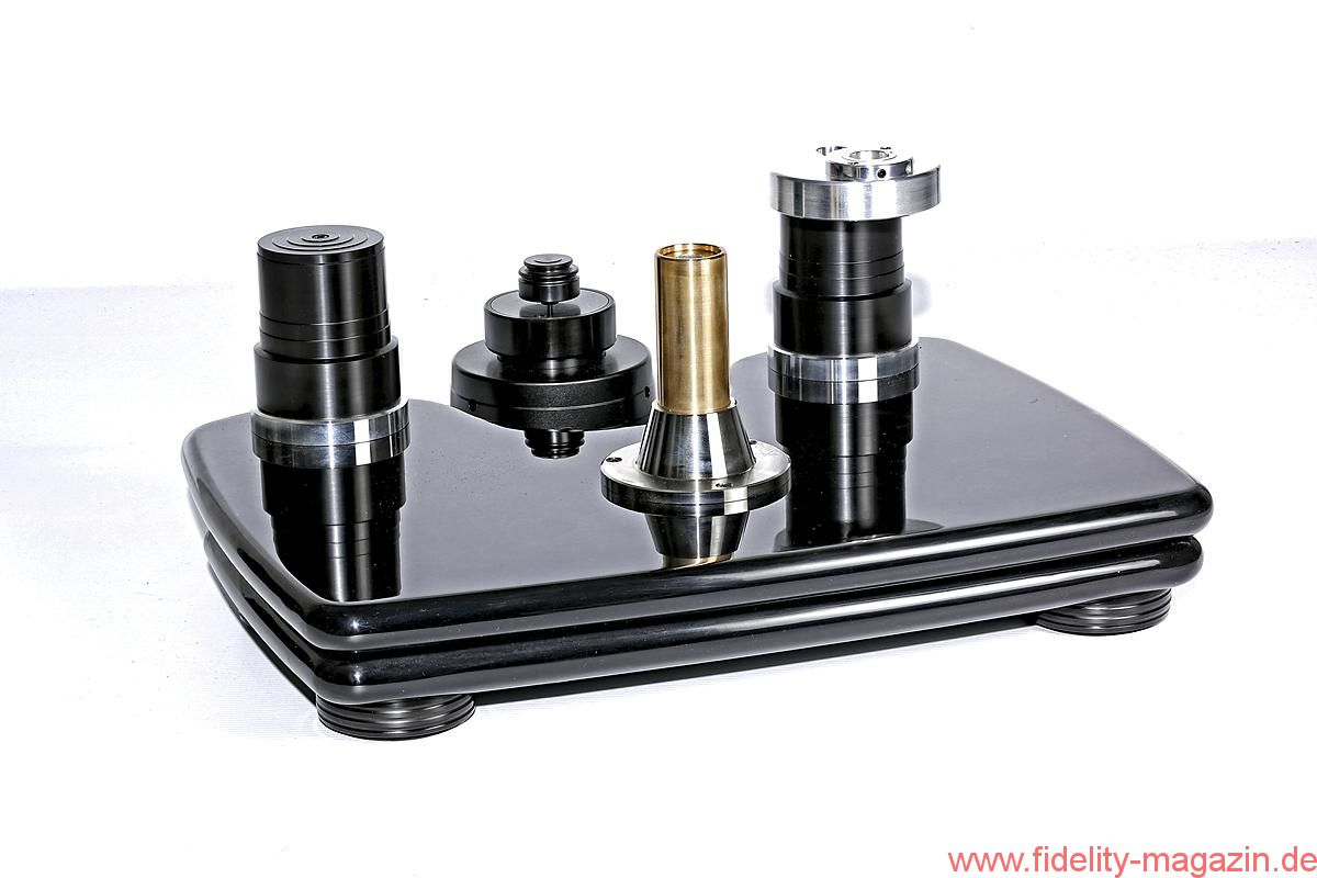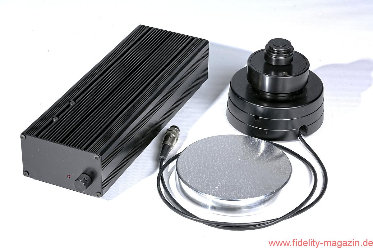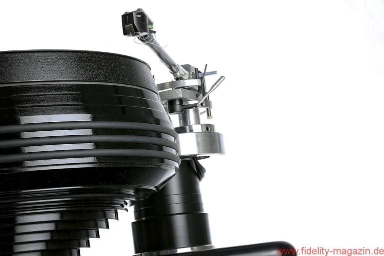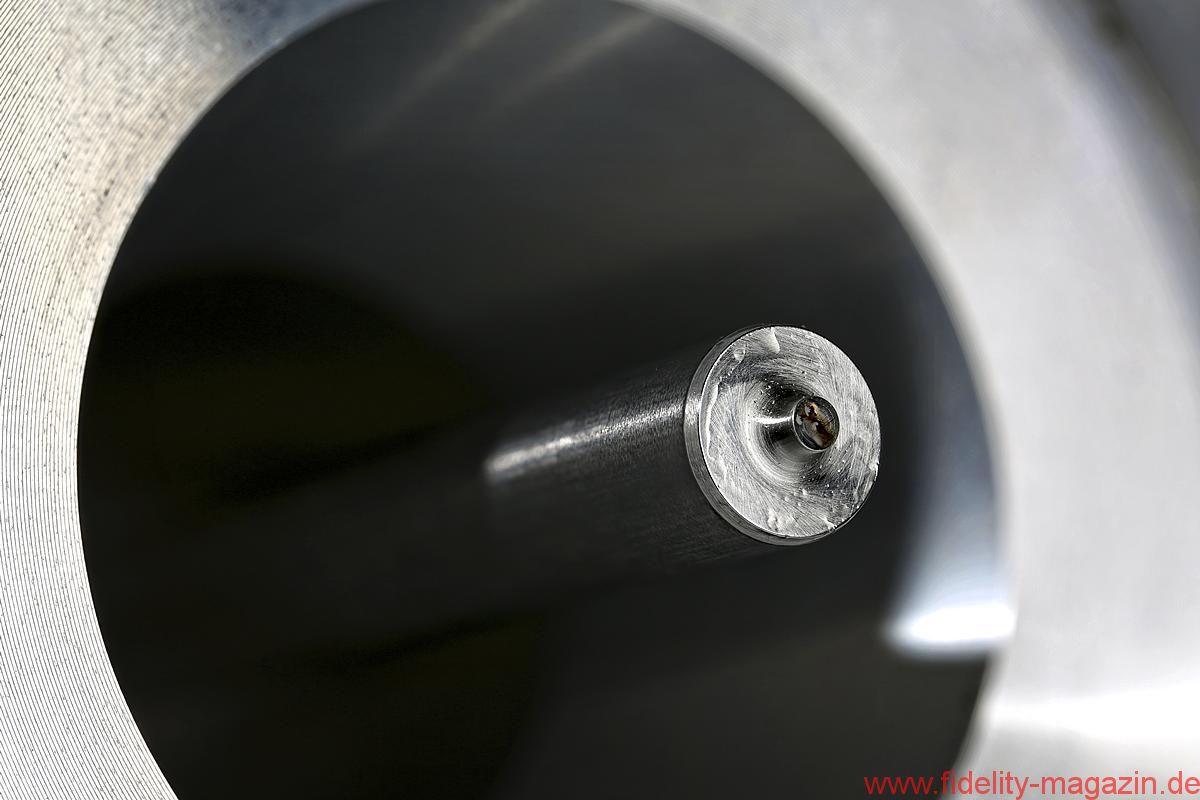 Das gilt insbesondere auch für den wirklich beeindruckend dimensionierten Teller und sein nicht minder eindrucksvolles Lager. Es besteht aus einer Bronzebuchse, in der als Lagerboden eine stählerne Querstrebe dient. Der Lagerdorn aus speziell gehärtetem Stahl (außen hart, innen weich) ist keine kugelförmige „Spitze“, vielmehr ein kleiner Kegelstumpf. Dadurch entsteht kein Auflagepunkt, sondern eine „Auflagelinie“. Sie bewirkt, dass ein wirklich minimaler, aber genau definierter Reibungswiderstand entsteht und so den Motor ein ganz kleines bisschen unter Last hält – auch dann, wenn sich der Teller bereits mit der gewünschten Geschwindigkeit dreht. Das verspricht noch weniger Vibrationen, da im Allgemeinen Motoren unter Last ruhiger laufen.