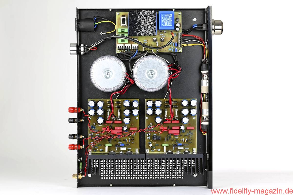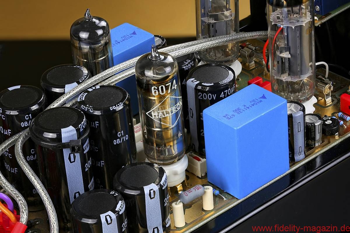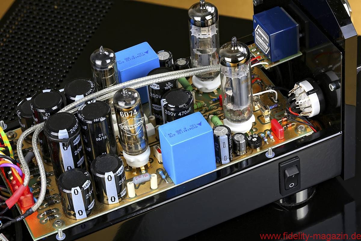 Die ungewöhnliche Röhrentechnik des mit drei per Relais geschalteten Hochpegel-Eingängen ausgestatteten HLP verdient eine nähere Beschreibung: Hinter den Cinchbuchsen ist der Pegelsteller – ein Alps-Poti – angeordnet, über den das Signal zum Steuergitter der Triode gelangt; deren Kathoden- und Anodenwiderstand wurden teilweise einstellbar gemacht, um die Stufe präzise einstellen zu können. Gleichspannungsgekoppelt geht es dann weiter zum Steuergitter der Pentode, die tatsächlich im reinen Pentodenbetrieb läuft und als impedanzwandelnder Kathodenfolger geschaltet wurde, um niedrige Ausgangsimpedanz zu erhalten. Damit liefert die Triode hier die gesamte Spannungsverstärkung, während der kleiner als eins verstärkende Pentodenteil auch für niederohmige Kopfhörer genug Strom liefern kann. Der via Kondensator ausgekoppelte Ausgang wurde umschaltbar gestaltet, damit sowohl nieder- als auch hochohmige Kopfhörer optimal versorgt werden können; die Ausgangsimpedanz im normalen Vorverstärkerbetrieb beträgt dabei 300 Ohm.