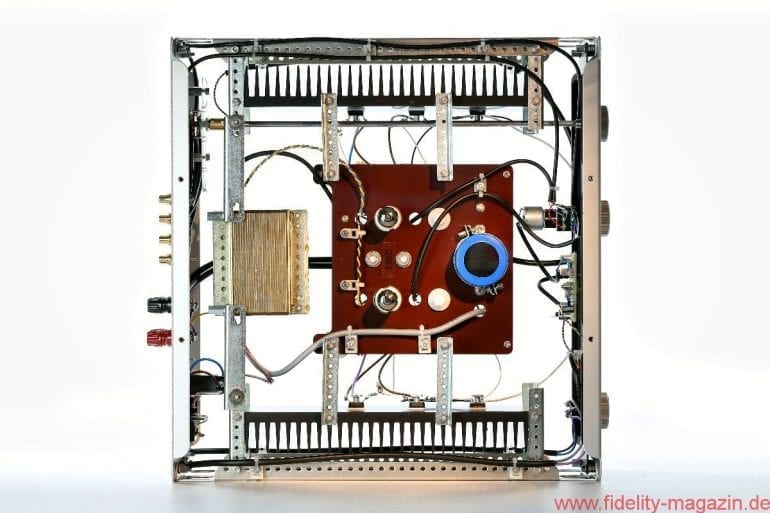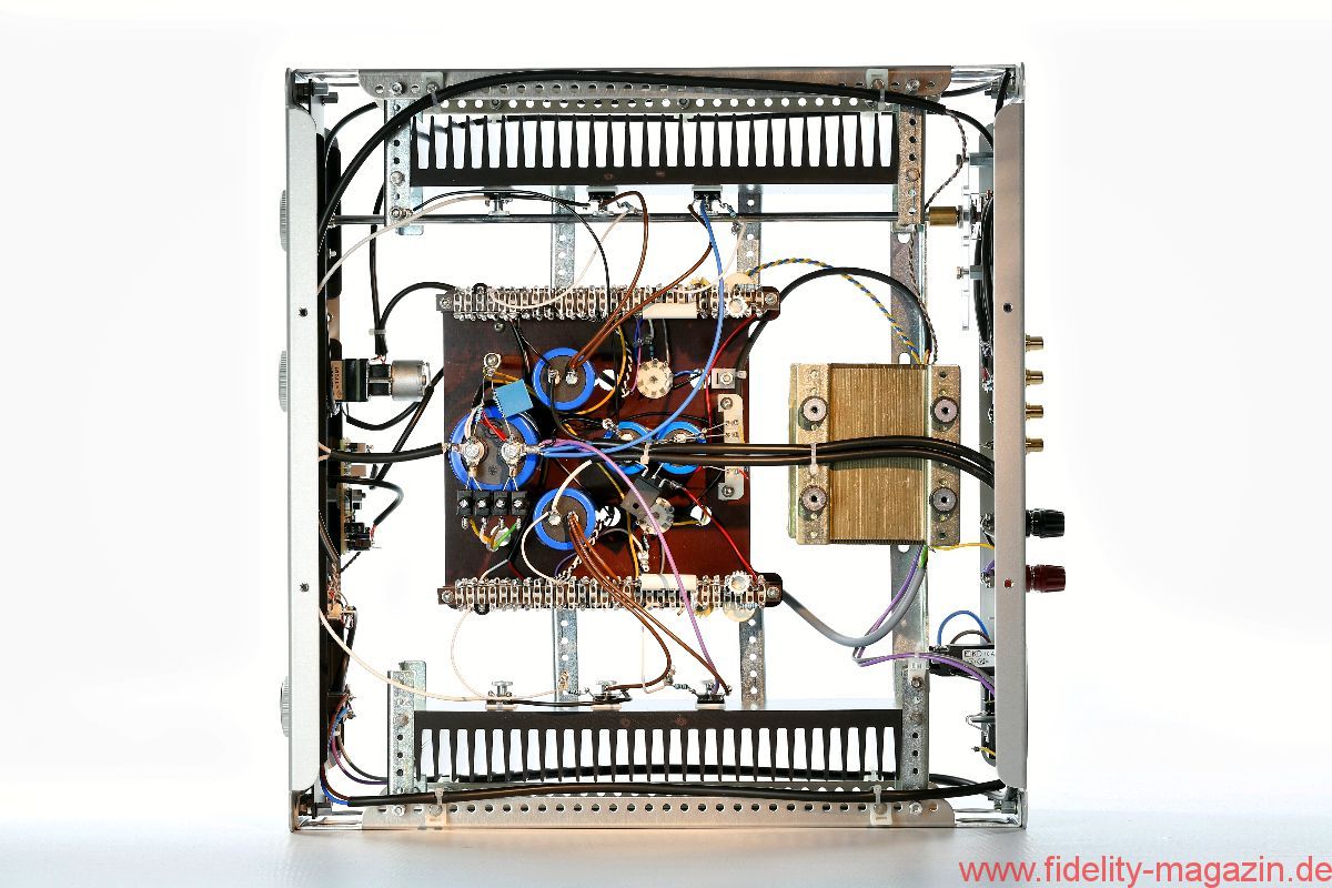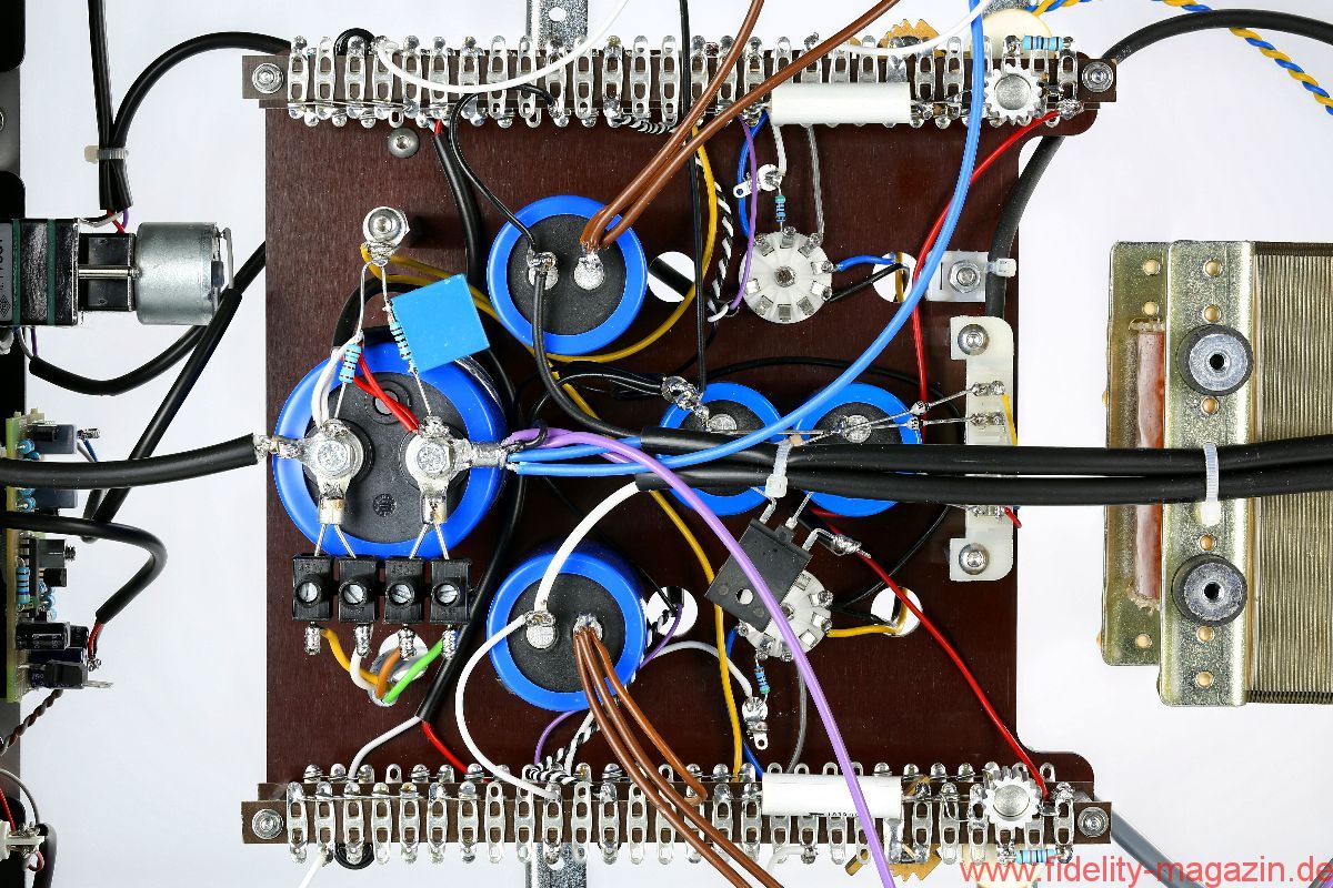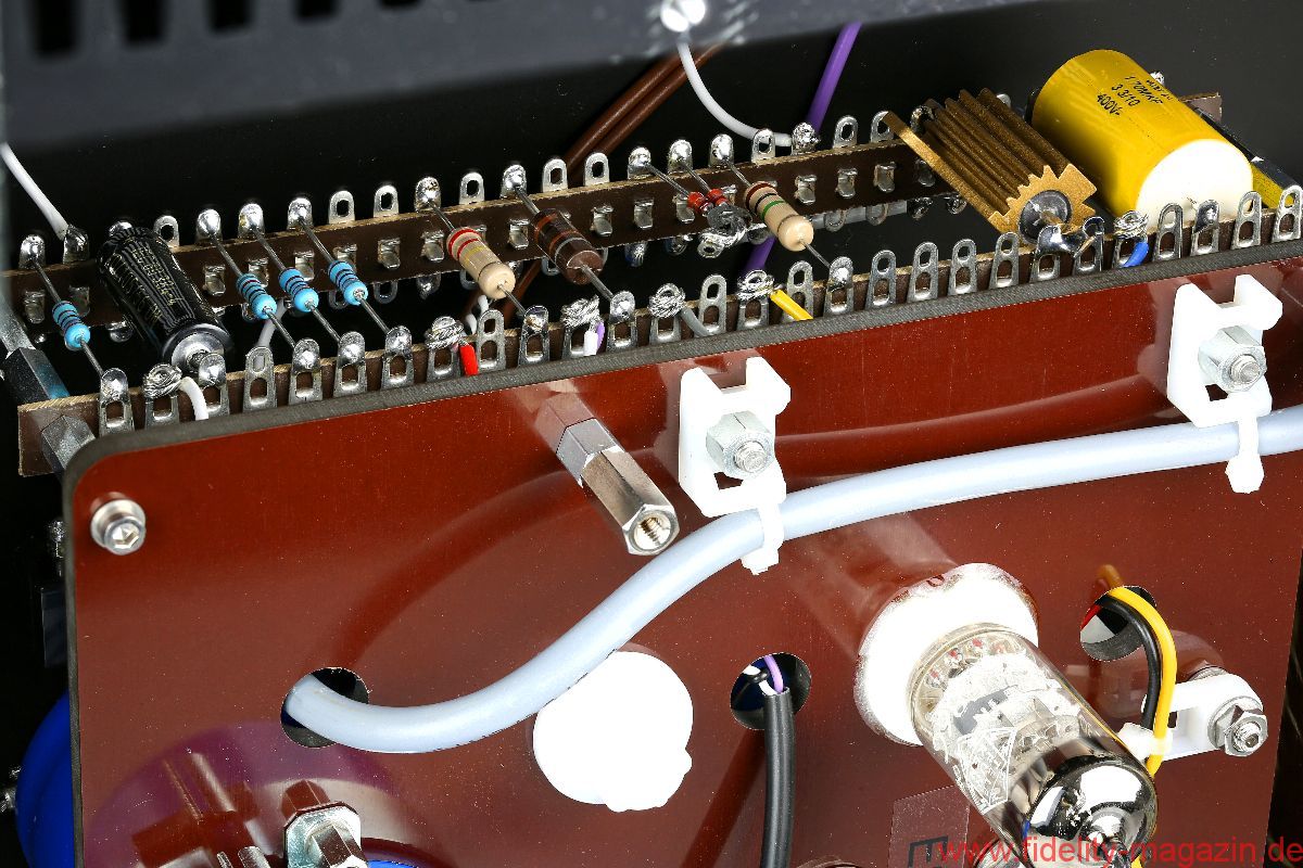 Ein Genuin Straight entsteht in Aachen komplett in Handarbeit – inklusive Netztrafo! – und wird innerhalb mehrerer Tage von nur zwei Händen zusammen gelötet: Beide gehören Reinhard Thöress. Die Vorstufe ist in selten anzutreffender Qualität auf Lötleisten aufgebaut. Oben lugen zwei NOS-PC86 durchs Gehäuse wie zwei Schlümpfe im Schützengraben. Das hat den Vorteil, dass sie auch im schlumpfigsten Schlumpfgewitter noch einen sicheren Unterschlumpf haben, aber den Nachteil, dass man keine Plattencover auf den Straight legen kann und erst recht keine Häkeldeckchen mit Blumenvasen. Schleier Nummer sechs legt den Rücken mit drei Line-Eingängen, die für den Erst-, Zweit- und Drittplattenspieler reichen, und einem als „Quelle“ bezeichneten fixen Hochpegel-Ausgang frei. Nicht eben üppig, aber das muss als Gegenentwurf zu überfrachteten Schaltzentralen mit Bluetooth und W-LAN betrachtet werden. Überdies stellt für Reinhard Thöress jedes Bauteil, das nicht unmittelbar der Signalverstärkung dient, einen potentiellen Störenfried dar. Deshalb – und weil sie nicht nötig sind – gibt es im Straight auch keinerlei Schutzschaltungen wie Einschaltverzögerung oder sofortige Stummschaltung bei Kurzschluss. Im Ausgang befindet sich lediglich ein stabiler Kondensator, der einen eventuellen DC-Offset auffängt. Trotzdem fährt der Verstärker bis auf gelegentliches Rascheln in den ersten Sekunden geräuschlos hoch, der Entwickler behauptet sogar, man könne Lautsprecher bedenkenlos auch im Betrieb anstecken. So etwas würde mir allerdings im Traum nicht einfallen! Der Kniff der Schaltung, sowie ich das verstehe, tastet das Wesen eines Vollverstärkers an sich an: Durch die lediglich zweistufige Verstärkung mit Röhren-Treibern, die schon genug Spannung liefern, um Lautsprecher auch direkt versorgen zu können, und diskreter Halbleiterschaltung, die lediglich als Impedanzpuffer fungiert und einen niederohmigen Ausgangswiderstand von maximal einem halben Ohm gewährleistet, ist der Straight nicht ohne Weiteres in Vor- und Endstufe auftrennbar. Deshalb bietet er auch keinen Vorverstärkerausgang. Je ein MosFET und ein Sensor-Widerstand pro Kanal bilden eine Stromsenke für das von den beiden PC86 verstärkte Signal und bieten dem Single-Ended-Leistungs-MosFET seinen optimalen Arbeitspunkt – selbstverständlich in reinem Class A. In dieser Betriebsart, die zwingend aus der SE-Schaltung resultiert, sind schwerlich mehr als die gegebenen 15 Watt verzerrungsfrei herauszuquetschen, darüber hinaus funktioniert die Minimal-Schaltung auch nur mit kleiner Leistung. Andernfalls bräuchte es wieder Schutzschaltungen, um Betriebssicherheit zu gewährleisten. Für Straight-Besitzer ist Purismus eben mehr als bloß ein Schlagwort.