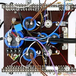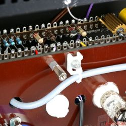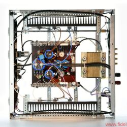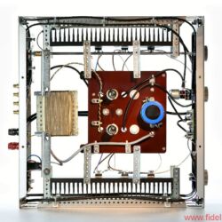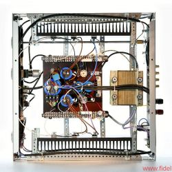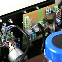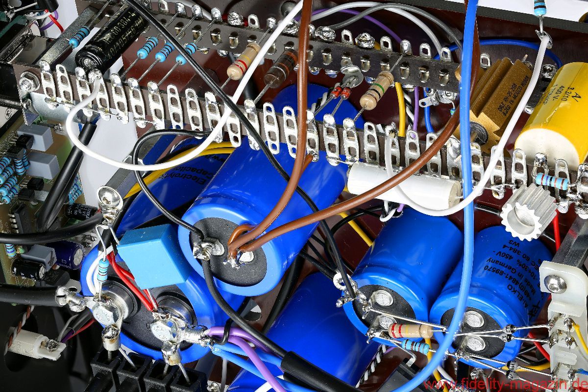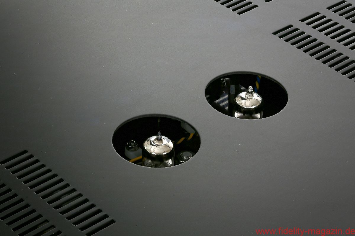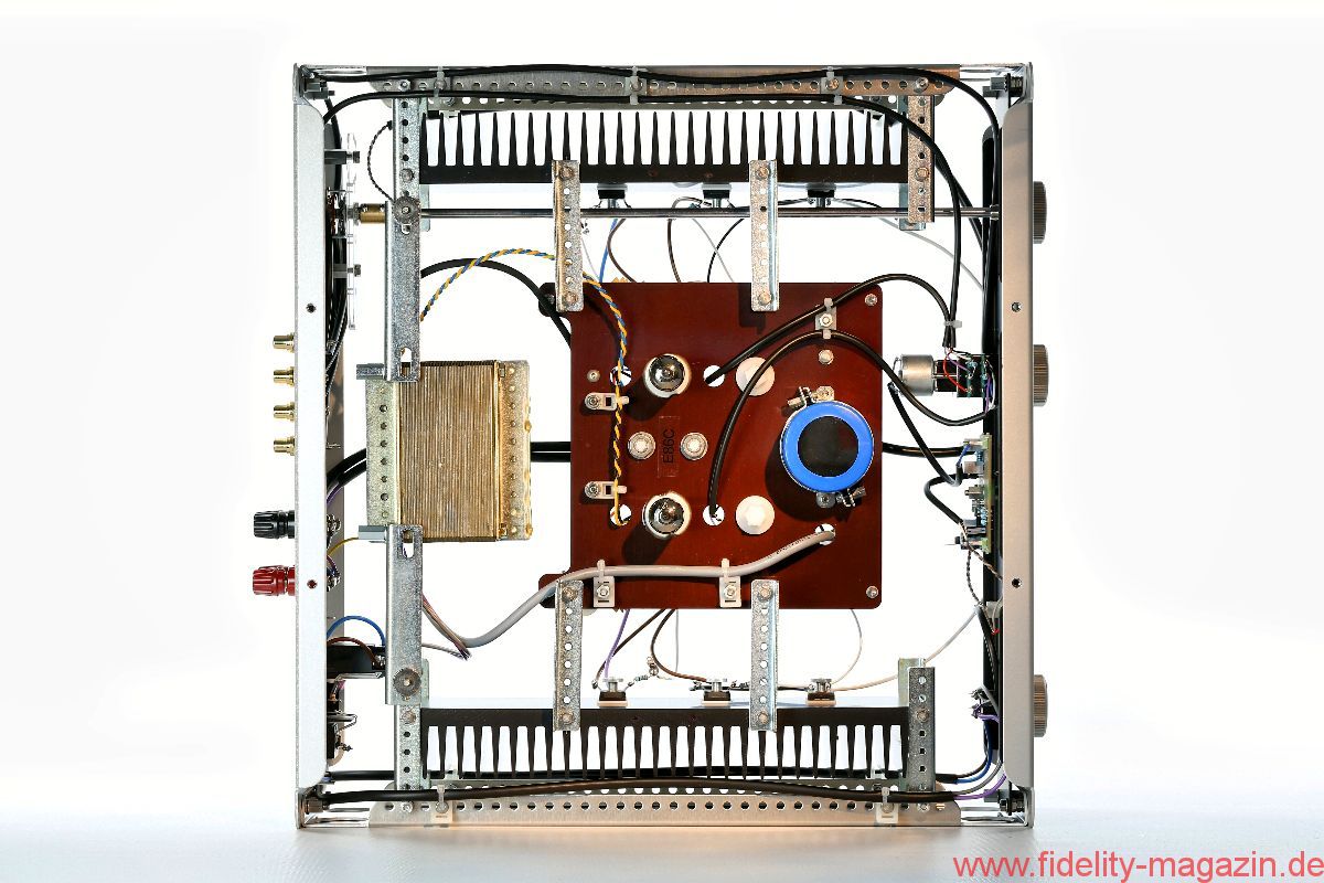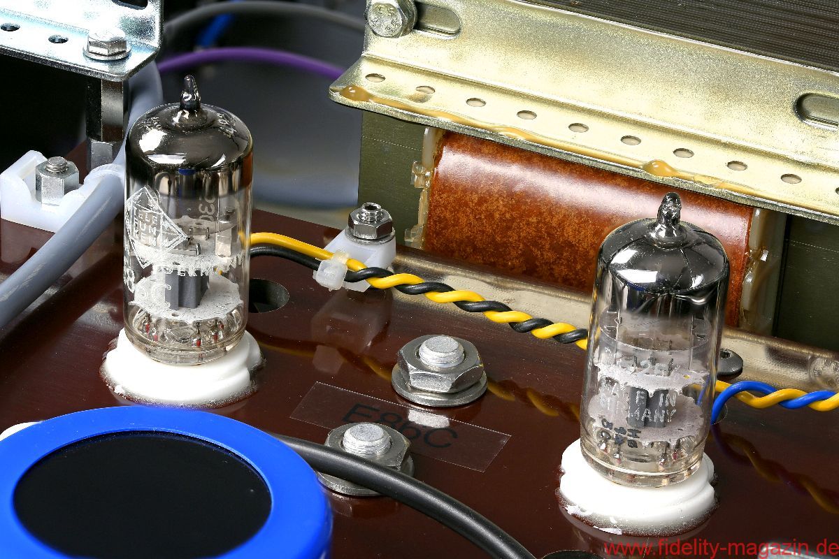 Ein Genuin Straight entsteht in Aachen komplett in Handarbeit – inklusive Netztrafo! – und wird innerhalb mehrerer Tage von nur zwei Händen zusammen gelötet: Beide gehören Reinhard Thöress. Die Vorstufe ist in selten anzutreffender Qualität auf Lötleisten aufgebaut. Oben lugen zwei NOS-PC86 durchs Gehäuse wie zwei Schlümpfe im Schützengraben. Das hat den Vorteil, dass sie auch im schlumpfigsten Schlumpfgewitter noch einen sicheren Unterschlumpf haben, aber den Nachteil, dass man keine Plattencover auf den Straight legen kann und erst recht keine Häkeldeckchen mit Blumenvasen. Schleier Nummer sechs legt den Rücken mit drei Line-Eingängen, die für den Erst-, Zweit- und Drittplattenspieler reichen, und einem als „Quelle“ bezeichneten fixen Hochpegel-Ausgang frei. Nicht eben üppig, aber das muss als Gegenentwurf zu überfrachteten Schaltzentralen mit Bluetooth und W-LAN betrachtet werden. Überdies stellt für Reinhard Thöress jedes Bauteil, das nicht unmittelbar der Signalverstärkung dient, einen potentiellen Störenfried dar. Deshalb – und weil sie nicht nötig sind – gibt es im Straight auch keinerlei Schutzschaltungen wie Einschaltverzögerung oder sofortige Stummschaltung bei Kurzschluss. Im Ausgang befindet sich lediglich ein stabiler Kondensator, der einen eventuellen DC-Offset auffängt. Trotzdem fährt der Verstärker bis auf gelegentliches Rascheln in den ersten Sekunden geräuschlos hoch, der Entwickler behauptet sogar, man könne Lautsprecher bedenkenlos auch im Betrieb anstecken. So etwas würde mir allerdings im Traum nicht einfallen! Der Kniff der Schaltung, sowie ich das verstehe, tastet das Wesen eines Vollverstärkers an sich an: Durch die lediglich zweistufige Verstärkung mit Röhren-Treibern, die schon genug Spannung liefern, um Lautsprecher auch direkt versorgen zu können, und diskreter Halbleiterschaltung, die lediglich als Impedanzpuffer fungiert und einen niederohmigen Ausgangswiderstand von maximal einem halben Ohm gewährleistet, ist der Straight nicht ohne Weiteres in Vor- und Endstufe auftrennbar. Deshalb bietet er auch keinen Vorverstärkerausgang. Je ein MosFET und ein Sensor-Widerstand pro Kanal bilden eine Stromsenke für das von den beiden PC86 verstärkte Signal und bieten dem Single-Ended-Leistungs-MosFET seinen optimalen Arbeitspunkt – selbstverständlich in reinem Class A. In dieser Betriebsart, die zwingend aus der SE-Schaltung resultiert, sind schwerlich mehr als die gegebenen 15 Watt verzerrungsfrei herauszuquetschen, darüber hinaus funktioniert die Minimal-Schaltung auch nur mit kleiner Leistung. Andernfalls bräuchte es wieder Schutzschaltungen, um Betriebssicherheit zu gewährleisten. Für Straight-Besitzer ist Purismus eben mehr als bloß ein Schlagwort.