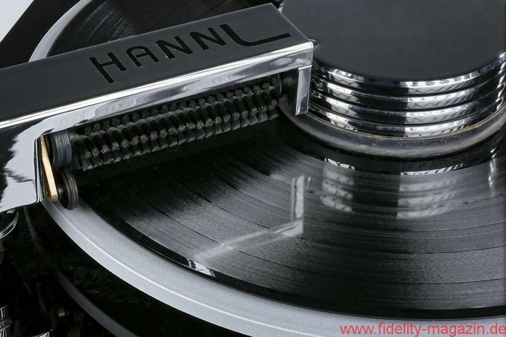 Methodisch vertritt Günter Hannl ähnliche Standpunkte, wie sie sich auch in meiner Erfahrung herausgebildet haben: Um festen Schmutz tief aus der Rille zu holen, muss man ihn herauslösen, aufquellen lassen und dann abnehmen. Das braucht Zeit, damit die Reinigungsflüssigkeit einwirken kann. Darüber hinaus aber hat Günter Hannl mit der Rotationsbürste einen Weg gefunden, dies viel effizienter zu gestalten. Die sich über eine gewitzte Reibradumlenkung immer entgegen der Platte drehende Rundbürste entfaltet ihre Wirkung durch kinetische Fluiddynamik, also Strömungsenergie, indem sie für Wirbel in der Flüssigkeit auf der Platte sorgt. Sie dringt nicht in die Rille ein, sondern soll mit einer Rändelschraube so fixiert werden, dass sie die Plattenoberfläche gerade sanft streift. Günter Hannl möchte, dass noch ein Blatt Papier dazwischenpasst; ich habe immer mit einem Auge gepeilt, ob noch ein Streifen Licht durchscheint. Man hat das schnell im Gefühl, im Übrigen meldet die Mera schon, ob der Abstand passt – durch ein „Helikoptergeräusch“ und spritzendes Wasser einerseits oder durch einen stillen See auf der Platte andererseits. Ich glaube, den idealen Abstand hat man gefunden, wenn sich vor der Bürste eine kleine Bugwelle bildet und dahinter ein leichtes Wellenmuster auf der Platte bleibt. Aus dieser Beschreibung geht schon hervor, dass für die Reinigung mittels Rotationsbürste mehr Flüssigkeit benötigt wird als mit der regulären Doppelbürste – meiner Erfahrung nach in etwa die dreifache Menge. Hannl bietet dafür einen speziellen Reiniger an, der leicht alkoholisch riecht und so gut wie nicht schäumt; geringe Bläschenbildung bei einem längeren Reinigungsvorgang schlürft die überaus kräftige, aber nur dezent laute, in ihrer Intensität regelbare Absaugung klaglos weg.