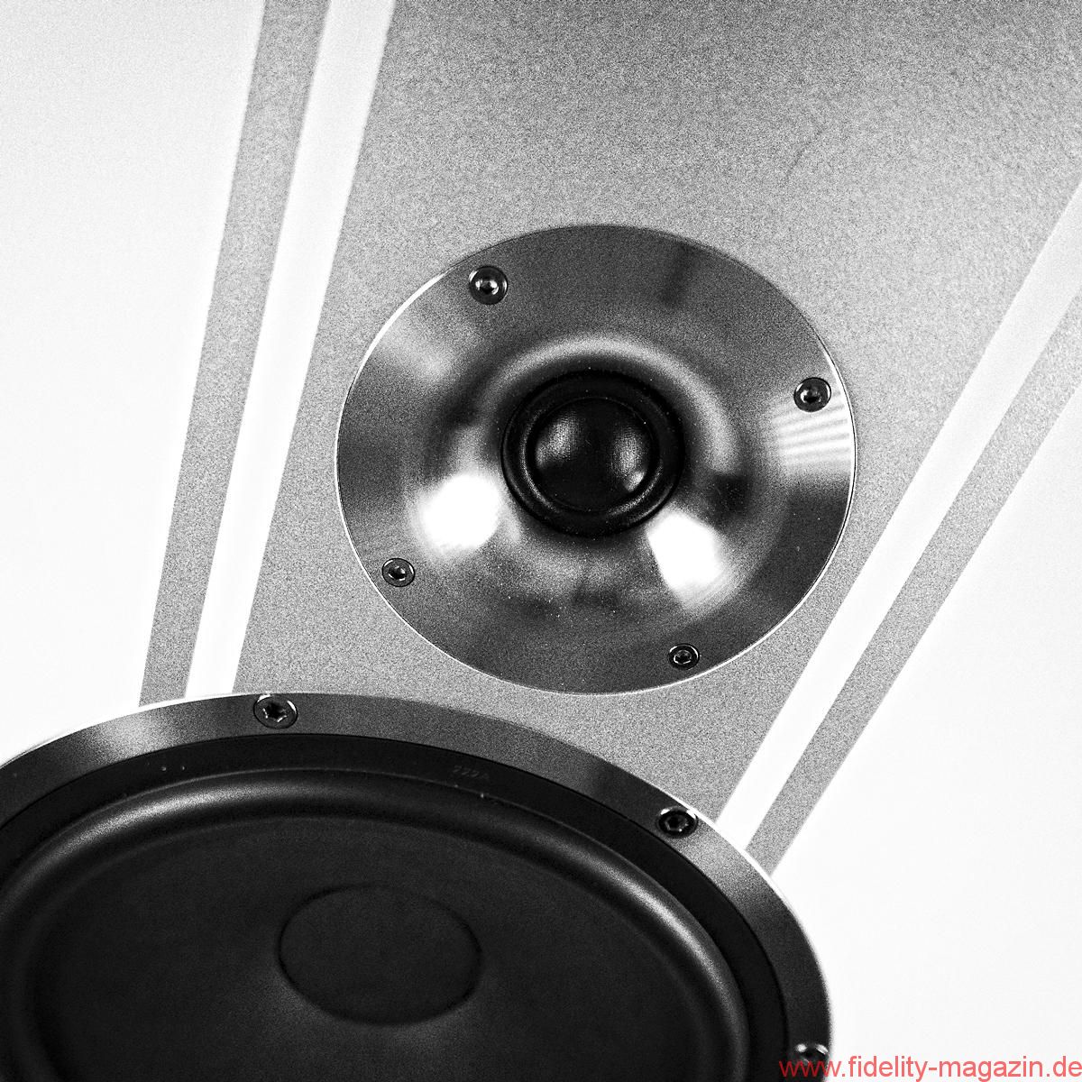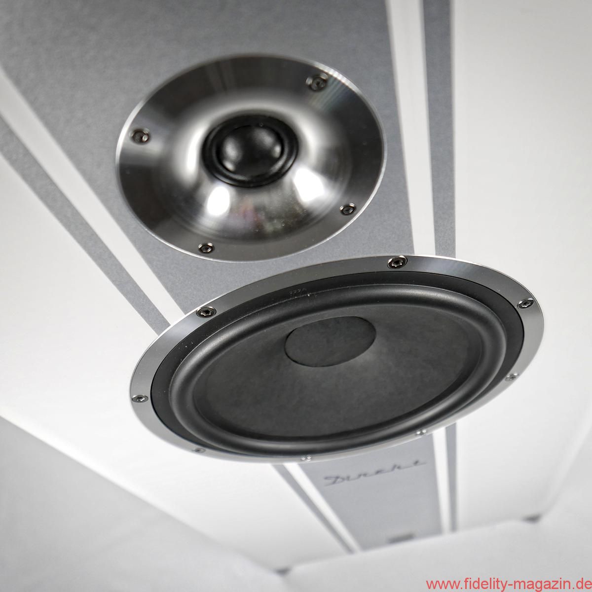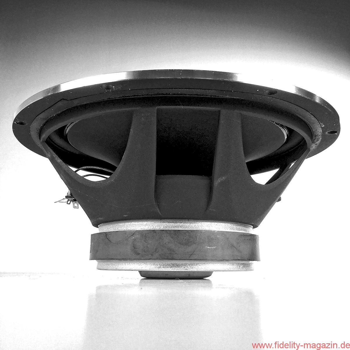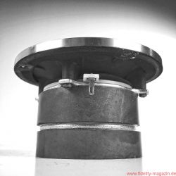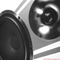 Schon während der Montage der ungewöhnlichen Schmuckstücke beginnt man es zu ahnen: Zwei Auspuff-, pardon, Bassreflexrohre an der Unterseite sind ein nicht zu übersehender Hinweis darauf, dass hier – Hubraum: 55 Liter – fortan großvolumig Luft bewegt werden soll. Beim Hantieren mit den Schrauben für die Fußkonstruktion, die das MDF-Chassis der Direkt auf drei Punkten leicht nach hinten neigt, ergibt sich der Blick auf einen mächtigen Magneten, der zu besonderer Vorsicht mahnt; zunächst beim Umgang mit Schrauben und Inbus, dann mit dem Pegelsteller.