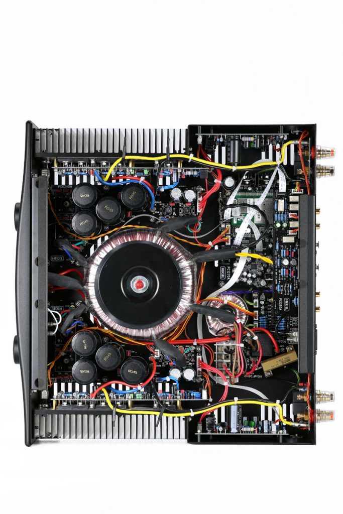 Ein erster Blick auf die Rückseite lässt Freude aufkommen: Es gibt nur wenige Einsatzszenarien, denen sich der H360 verschließt, denn er kommt mit drei analogen Hochpegeleingängen, fünf Digitalanschlüssen (koaxial, USB, 3 x optisch) sowie einer Ethernetbuchse. Der H360 ist auftrennbar, es gibt einen Vorstufenausgang und einer der drei Line-Eingänge ist als Heimkino-Bypass geschaltet, also ein Endstufeneingang, der die Lautstärkeregelung links liegen lässt. Die verbaute DAC-Sektion ist eine Eigenentwicklung, auch die Verstärkerstufen kommen mit technischen Besonderheiten aus dem Hause Hegel, die – man kann in Dänemark auch Marketing! – alle einen eigenen Neologismus mitbringen: Da wäre zunächst die „DualAmp“-Technologie: Anstatt Strom- und Spannungsverstärkung parallel durchzuführen, wird das Eingangssignal zuerst von einer dezidierten Verstärkerstufe spannungsverstärkt, die Stromverstärkung wird von einer weiteren Schaltung durchgeführt. So könne man, heißt es bei Hegel, beide Stufen mit den jeweils bestmöglich geeigneten Komponenten aufbauen. Oder auch die – übrigens in allen Hegel-Verstärkern – eingesetzte „SoundEngine“: Vereinfacht gesagt, misst diese die bei der Verstärkung entstehenden Verzerrungen und „entscheidet“ über einen Schwellwertregelkreis, ob diese klangschädlich sind oder nicht. Falls das der Fall ist, werden diese Verzerrungen dem Ausgangssignal invertiert zugeführt – was im Idealfall ein Nullsummenspiel ergibt. Wer mehr darüber wissen möchte und das Hegel-Mastermind bzw. den Unternehmensgründer Bent Holter inklusive seines charmanten „Dänglish“ kennenlernen möchte, der findet auf YouTube ganz einfach eine vertiefende Erklärung der SoundEngine.