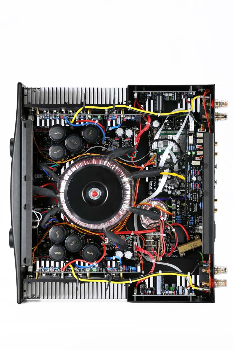 Die erste Begegnung mit dem H360 lässt den Rezensenten sanft fluchen: „Alter Schwede bzw. Däne!“ – das Ding ist sauschwer. Dem dezenten, schnörkellosen Gehäuse ist nicht auf Anhieb anzusehen, dass hier 20,5 Kilogramm aus dem Karton gewuchtet werden wollen. Ein erster Blick durch die Kühlrippen offenbart aber schnell den Übeltäter: einen obszön fetten Ringkerntrafo, der einen Löwenanteil des Gesamtgewichts ausmacht. Er ist ausschließlich zuständig für die Leistungsabteilung, die Vorstufe hat ihren eigenen kleinen Umspanner, sodass beide sich in Sachen Lastverteilung nicht in die Quere kommen. 2 x 250 Watt an 8 Ohm werden geboten, das dürfte auch für die eine oder andere Party reichen, sollte man meinen.