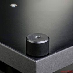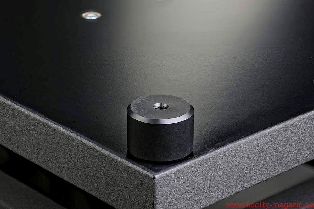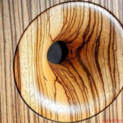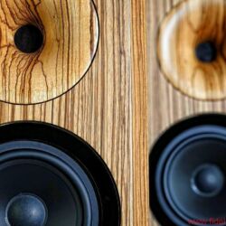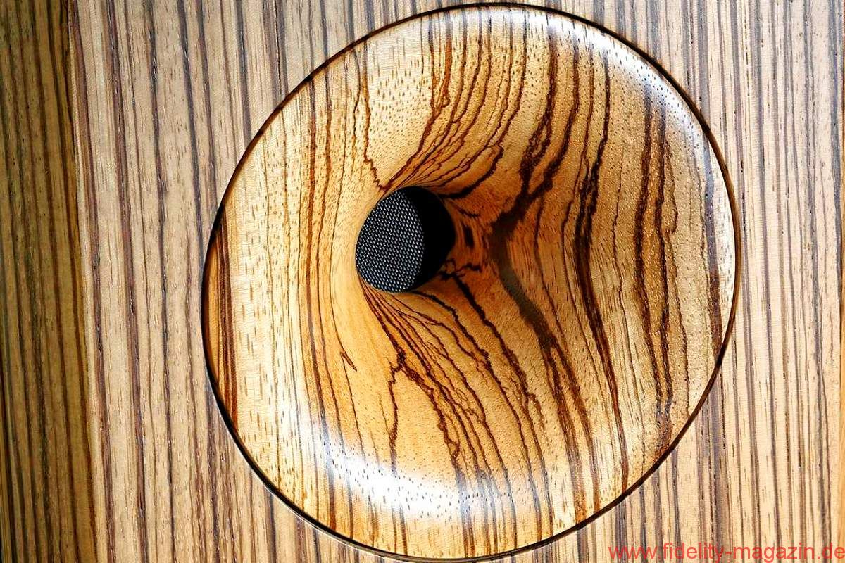 : Gefertigt wird sie ausschließlich von etablierten Handwerksbetrieben in der Region um Köln. Das ist teurer als üblich, erlaubt aber die direkte Kontrolle aller Produktionsschritte. Und über die kurzen Transportwege, die nicht zuletzt der Umwelt zugutekommen, freuen wir uns auch. Die Lackierung des Korpus besteht aus Nextel, einem matten und leicht strukturierten (und teuren) Lack, der dank seiner akustischen Eigenschaften unter anderem auch an Schoeps-Mikrofonen zum Einsatz kommt. Das Furnier der Front passt nicht nur paarweise zusammen, sondern in seiner Maserung auch zum gut zehn Zentimeter durchmessenden Hochtonhorn aus Vollholz. Der kleine Tiefmitteltöner – eigentlich eher ein Breitbänder, da er bis 9000 Hertz läuft – wird nicht nur schlicht in die Schallwand geschraubt, sondern zusätzlich mit einem schwarzen Acrylring verblendet. Sicher nicht nötig, aber durchaus schön anzusehen.