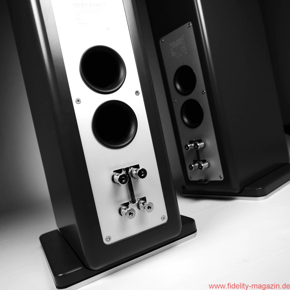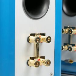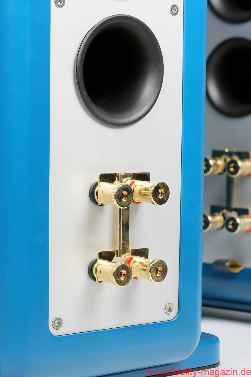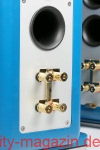 Auf der Rückseite springt die Aluminiumplatte ins Auge, auf der die vergoldeten Anschlussterminals prangen. Sie erlauben Bi-Wiring und Bi-Amping und bieten Anschlussmöglichkeiten für Bananenstecker, Litze und Kabelschuhe. Darüber finden sich zwei Ausgänge für die Bassreflexrohre mit Trompetenöffnung. Die Frequenzweiche – in der Testversion die Upgrade-Version mit feineren Bauteilen – findet sich direkt hinter den Anschlussterminals in einem eigenen Gehäuseabschnitt.