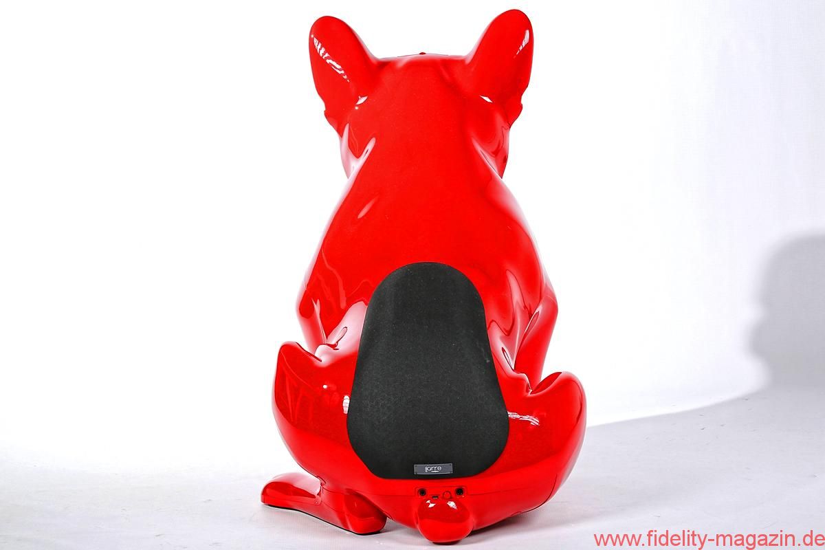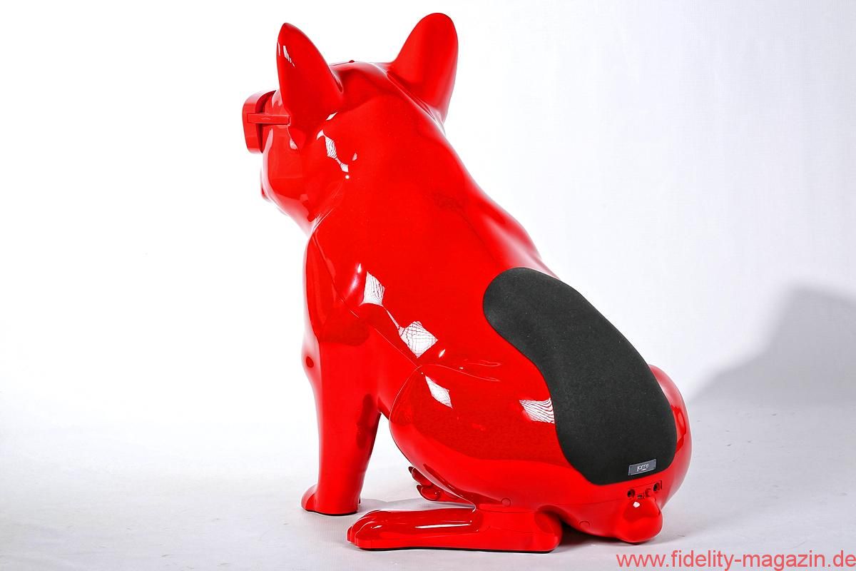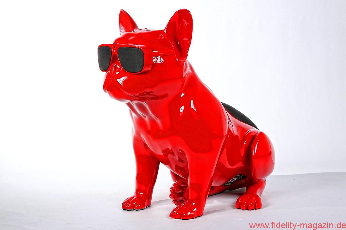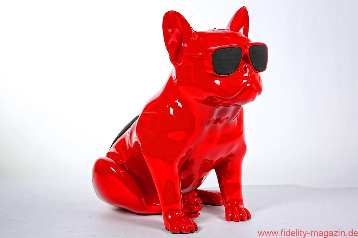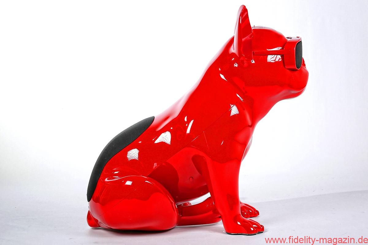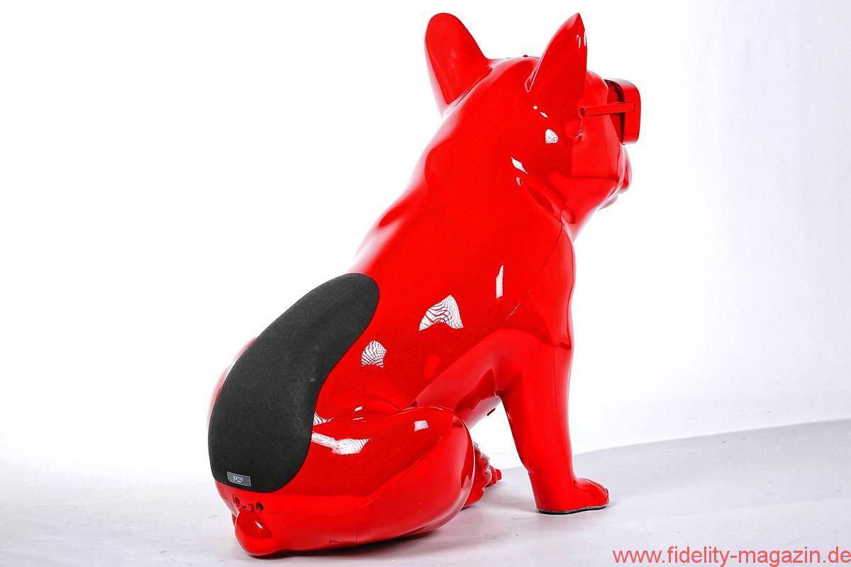Gefallen findet auch Redaktions-Boxerdame Wilma am neuen hochglanzroten Spielkameraden. Zunächst noch mucksmäuschenstill, wird AeroBull zunächst vorsichtig beschnuppert – was sich prompt ändert, als dieser auf Knopfdruck plötzlich die ersten Laute von sich gibt. „Device is on!“ ertönt es mächtig aus der Skulptur. Nicht nur Wilma ist beeindruckt. Kaum Interesse zeigt sie hingegen an der originellen Fernbedienung des AeroBull: ein „Knochen“ mit beleuchteten Tasten. Lieber genießen wir alle den erstaunlich voluminösen Klang des knallroten Hundes, den es übrigens auch in Hochglanzweiß oder Mattschwarz (und ab August 2016 als extraschicke, extrateure „Limited Edition“ auch in edlem Mattgrau) gibt.