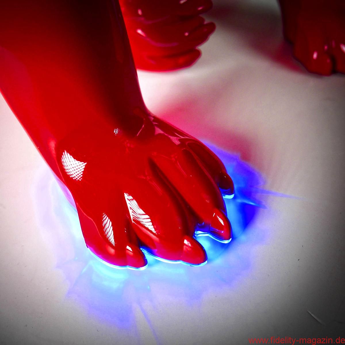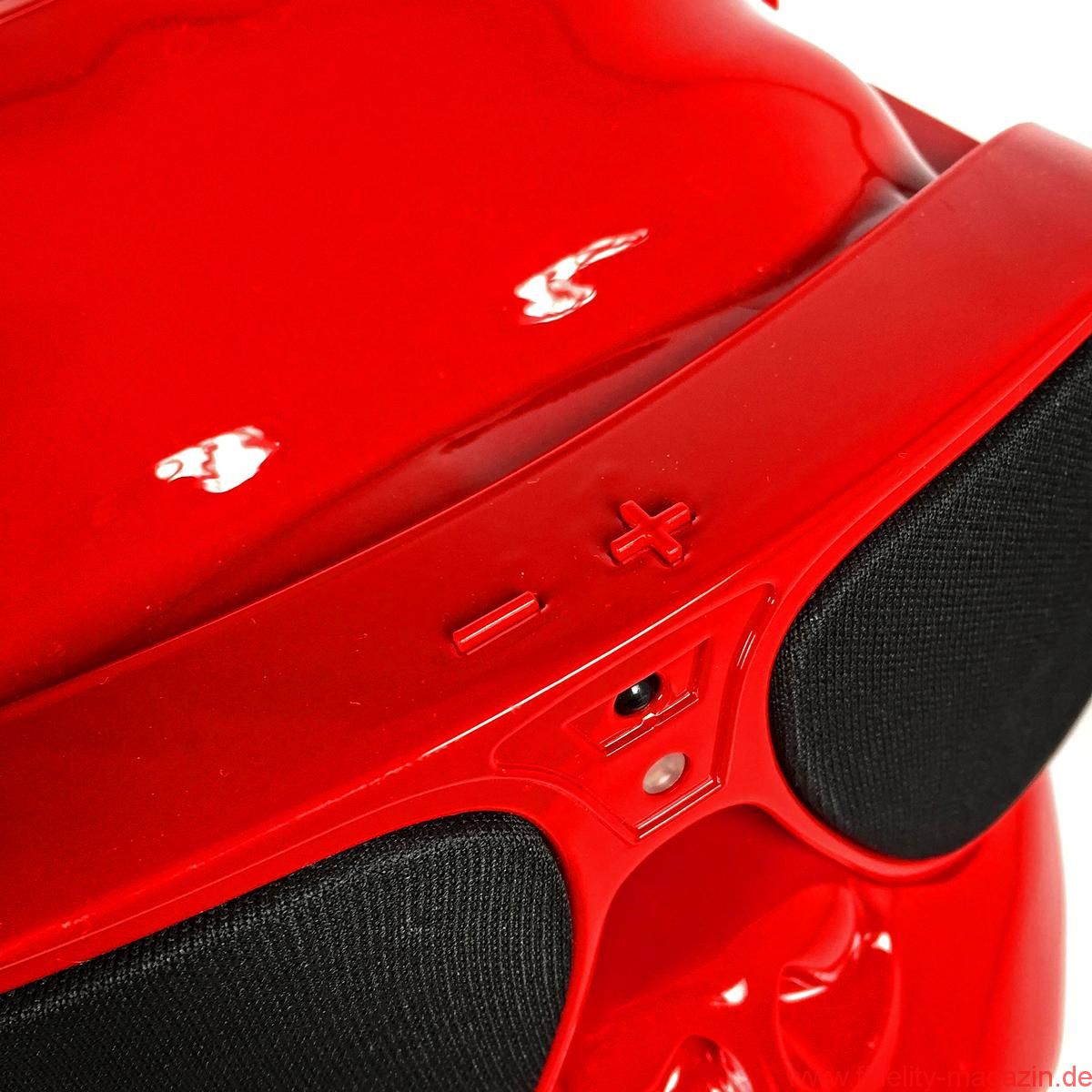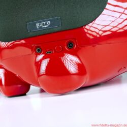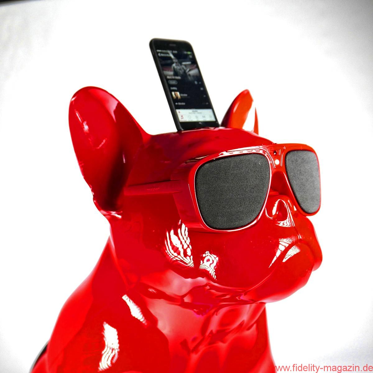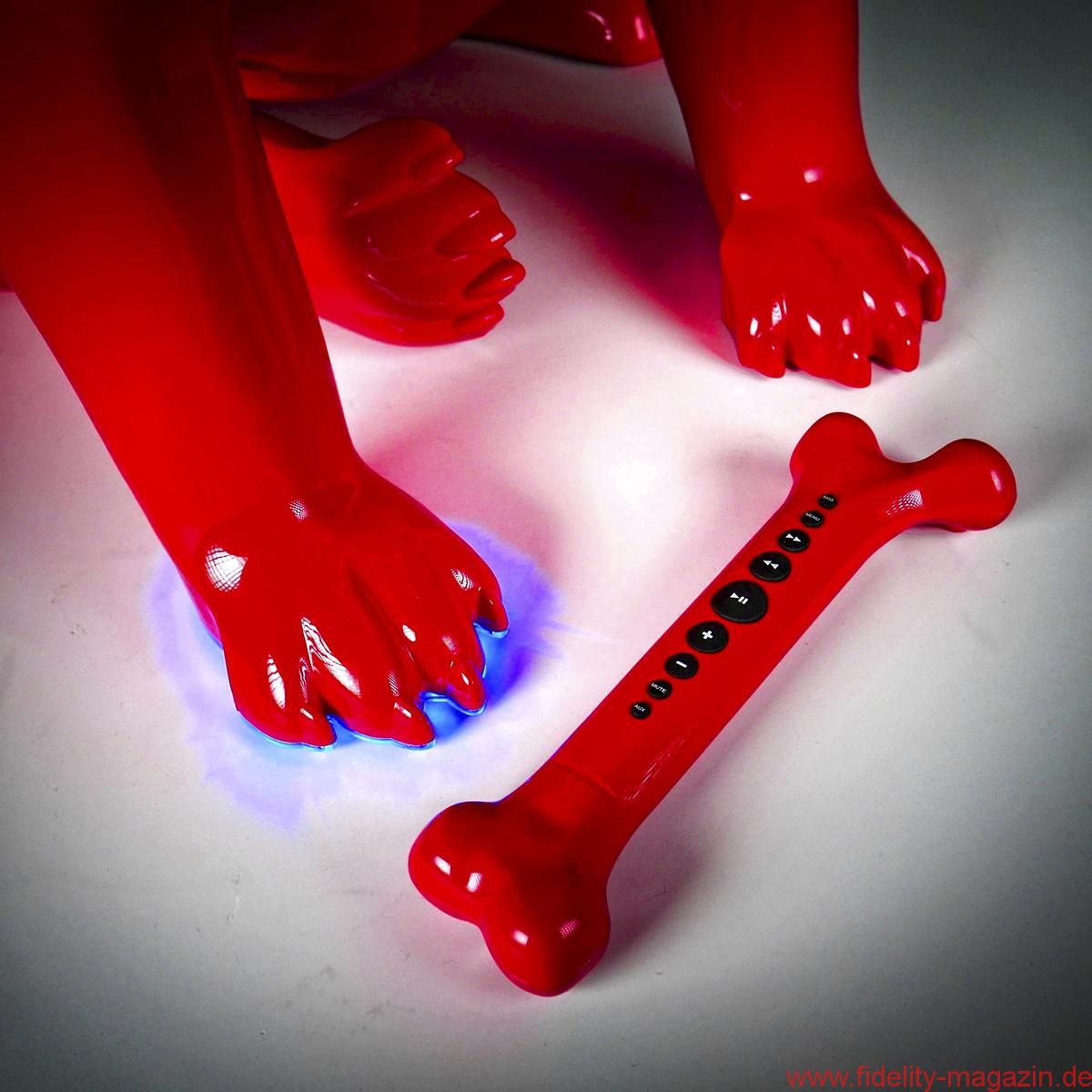 Gefallen findet auch Redaktions-Boxerdame Wilma am neuen hochglanzroten Spielkameraden. Zunächst noch mucksmäuschenstill, wird AeroBull zunächst vorsichtig beschnuppert – was sich prompt ändert, als dieser auf Knopfdruck plötzlich die ersten Laute von sich gibt. „Device is on!“ ertönt es mächtig aus der Skulptur. Nicht nur Wilma ist beeindruckt. Kaum Interesse zeigt sie hingegen an der originellen Fernbedienung des AeroBull: ein „Knochen“ mit beleuchteten Tasten. Lieber genießen wir alle den erstaunlich voluminösen Klang des knallroten Hundes, den es übrigens auch in Hochglanzweiß oder Mattschwarz (und ab August 2016 als extraschicke, extrateure „Limited Edition“ auch in edlem Mattgrau) gibt.