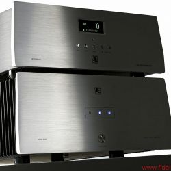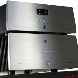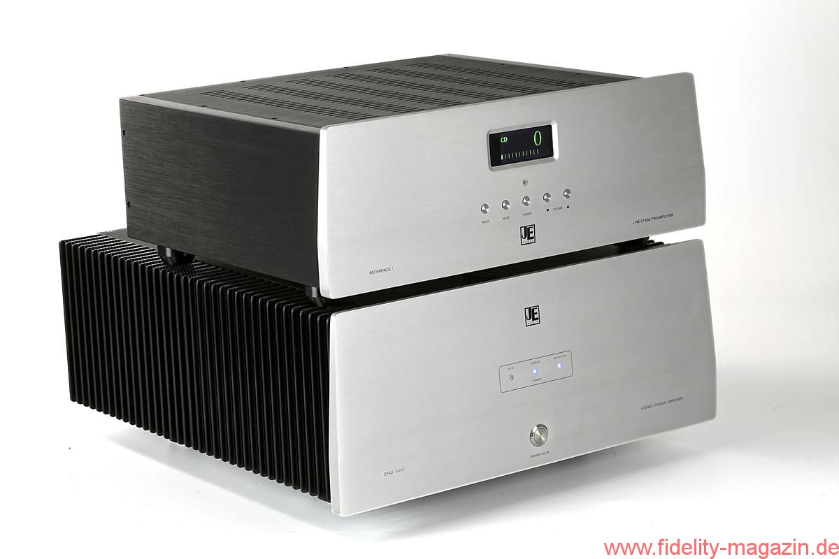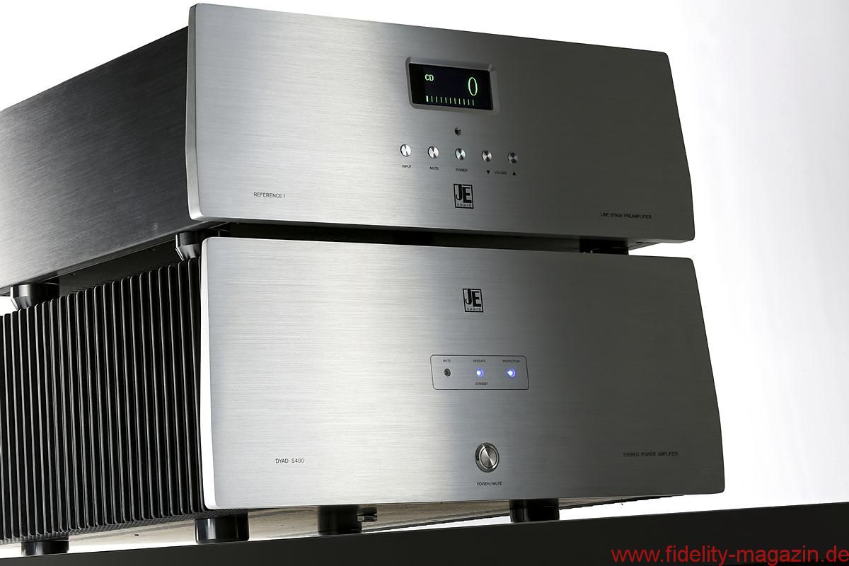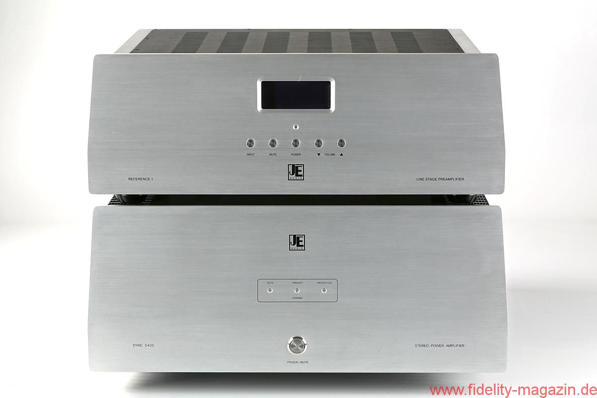 Doch zunächst mal die Basics: Die hier vorgestellte Vor-End-Kombi ist das Aushängeschild von JE Audio: Sie besteht aus der Vorstufe Reference 1 für 8400 Euro sowie dem Endverstärker Dyad S400 (12900 Euro). Mit ihren stattlichen Abmessungen bildet sie genau den richtigen Mittelpunkt für einen standesgemäßen HiFi-Altar, hält sich durch ihre wenigen Bedienelemente optisch jedoch dezent zurück. Mechanisch und in Sachen Verarbeitungsqualität hinterlassen die JE-Amps einen „amtlichen“ Eindruck, bei den leicht trapezförmigen massiven Alu-Frontplatten hat der Kunde die Wahl zwischen Alu natur und schwarz eloxiert.