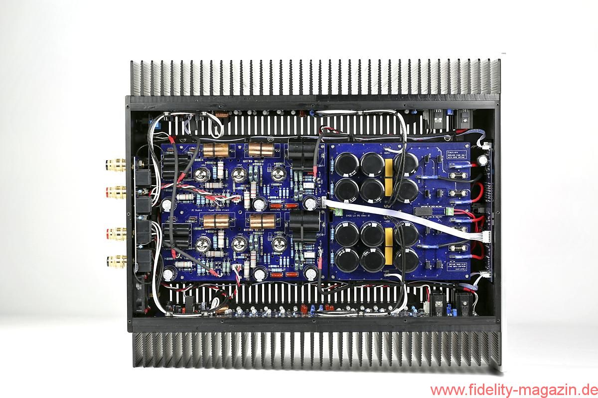 Für solche Aufgaben sind Halbleiter bedingt durch ihren niedrigen Innenwiderstand technisch viel besser geeignet als Röhren: Im Dyad S440 sind hierfür nicht weniger als 24 MOSFETs pro Kanal zuständig – jeweils ein Dutzend für das invertierte wie für das nicht invertierte Signal. Letztendlich hängt der Lautsprecher hier also ohne Massebezug (floatend) zwischen den Lautsprecherklemmen, was der Funktion eines Brückenverstärkers entspricht.
