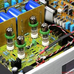 Komplexer geht es dagegen im Endverstärker Dyad S400 zu, der als Hybrid-Amp sowohl Röhren als auch Halbleiter im Signalweg beschäftigt. Auch er verwendet als Eingangsstufe pro Kanal einen vollsymmetrischen Differenzverstärker ähnlich dem Reference 1, der bei ihm jedoch mit jeweils zwei Doppeltrioden vom Typ 12AU7 (vgl. ECC82) arbeitet. Gefolgt wird der Eingangs-Differenzverstärker von einer weiteren Spannungsverstärkerstufe, die pro Kanal eine Doppeltriode 6922 (vgl. E88CC) verwendet. Weil beide Röhrenstufen zusammen bereits die gesamte erforderliche Spannungsverstärkung aufbringen (31 dB), kann sich der nachfolgende Endstufenblock auf die reine Stromlieferung für die Lautsprecher konzentrieren.