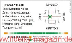 Der Luxman L-590-AXII ist ein würdiger Nachkomme legendärer Vollverstärker-Konstruktionen aus jener Epoche, als man noch „Stereoanlagen“ hatte, bei denen alles zusammenpassen musste. Nostalgiker werden sein Design lieben, Klang-Kulinariker seinen ganz zeitgemäßen Sound. Bei ihm passt einfach alles.