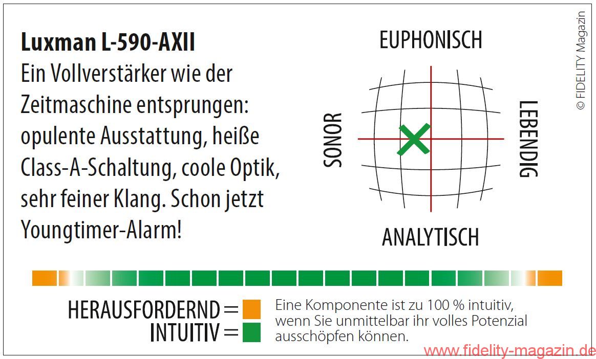 Wie der Luxman alle diese Einzelheiten in ein Klangbild gießt, das zu jeder Sekunde haarscharf die Balance zwischen „glasklar durchhörbar“ und „vollfett“ hält, hat Klasse und Stil. Eine große Portion Charme kommt durch die Art hinzu, wie dieser Vollverstärker in Aufnahmeräume hineinleuchtet, Ensembles egal welcher Größe in Breite und Tiefe sauber staffelt und Instrumente dabei größenrichtig abbildet: Der Luxman L-590-AXII geriert sich nicht eigenmächtig als Makro-Objektiv, nicht einmal als akustische Lupe, sondern ist hörbar darum bemüht, nur das wiederzugeben, was der Tonmeister zuvor aufgenommen hat – nicht mehr, aber auch nicht weniger.