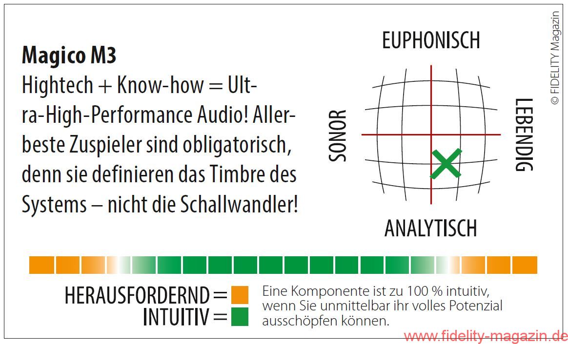 Diese geballte Ladung von Hightech-Stoffen und Know-how ist geradezu ideal, um damit am audiophilen Stammtisch mal so richtig zu punkten. Die Frage ist nur, ob sich ein M3-Besitzer nach der Inbetriebnahme seiner Super-Schallwandler überhaupt noch aus dem Haus begibt, geschweige denn einen derartigen Stammtisch aufsucht. Aus eigener Erfahrung möchte ich das anzweifeln. Wer eine M3 in Ruhe und mit den „richtigen“ Zuspielern hört, dürfte für den audiophilen Alltag verloren sein.